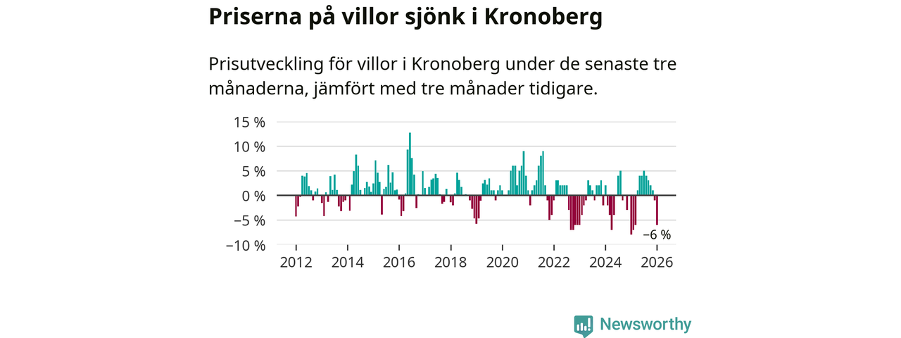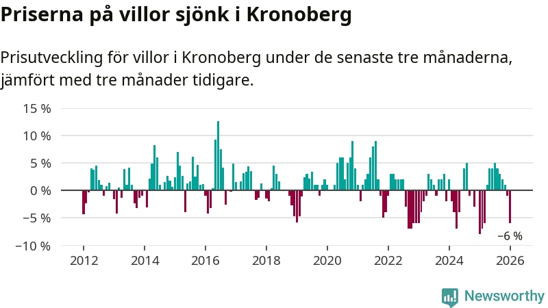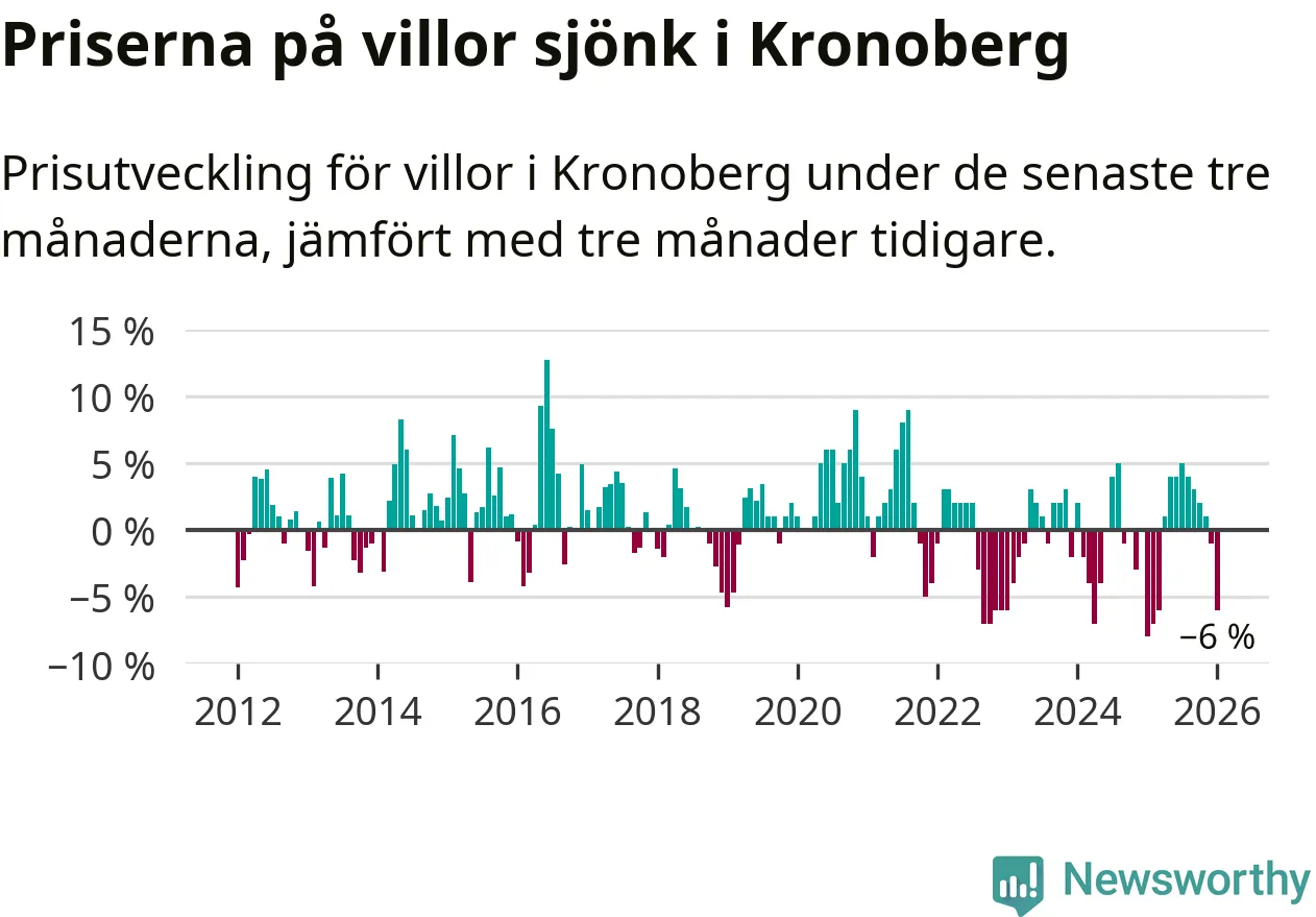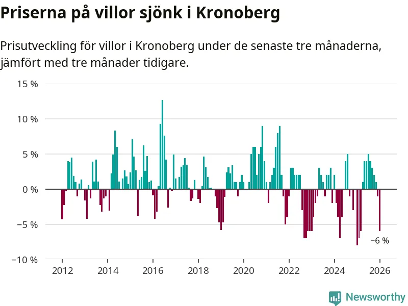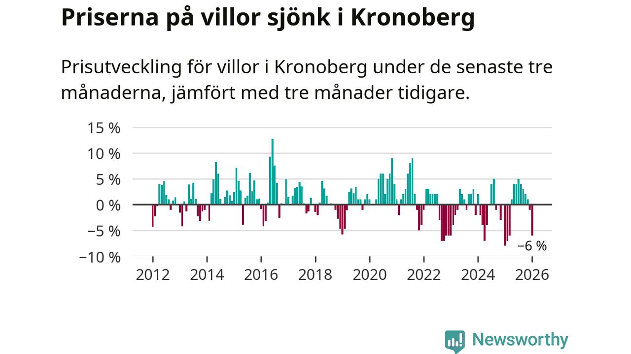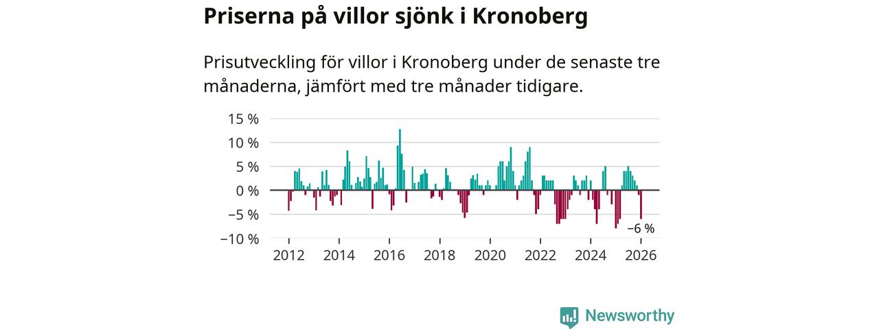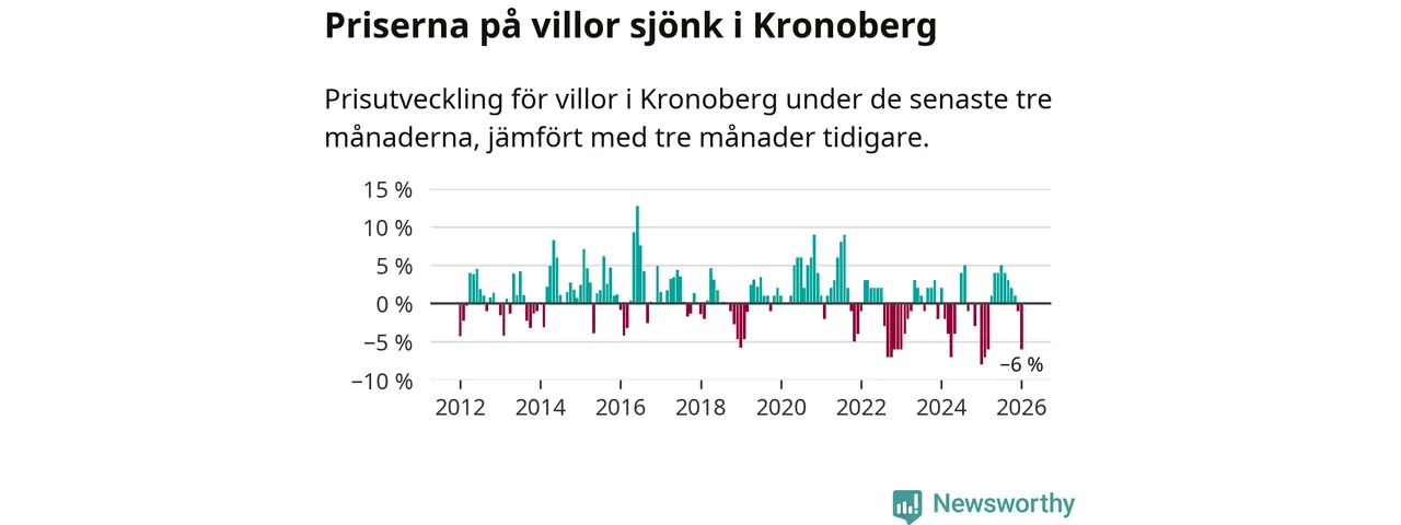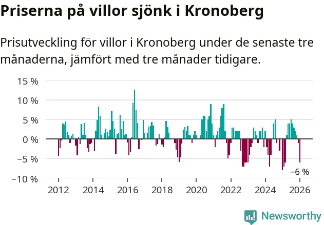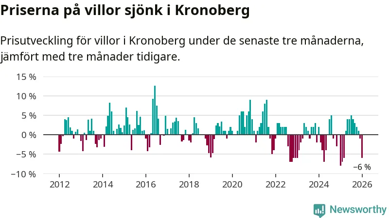 Villapriserna sjönk mellan november och januari med 6 procent i Kronobergs län. Det är en betydande nedgång jämfört med det gångna året då priserna i snitt stått stilla.