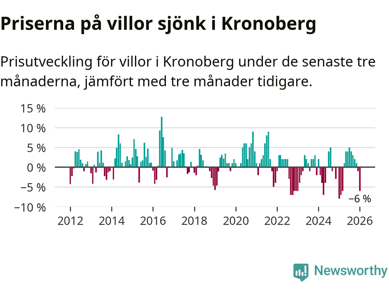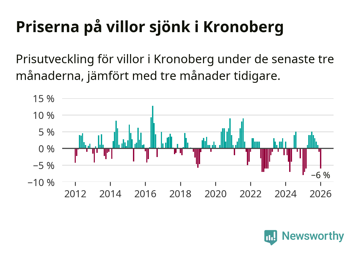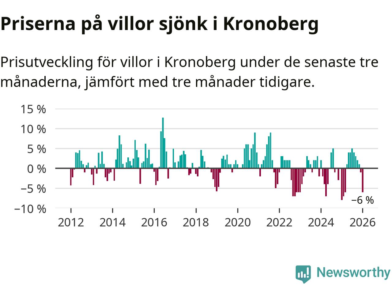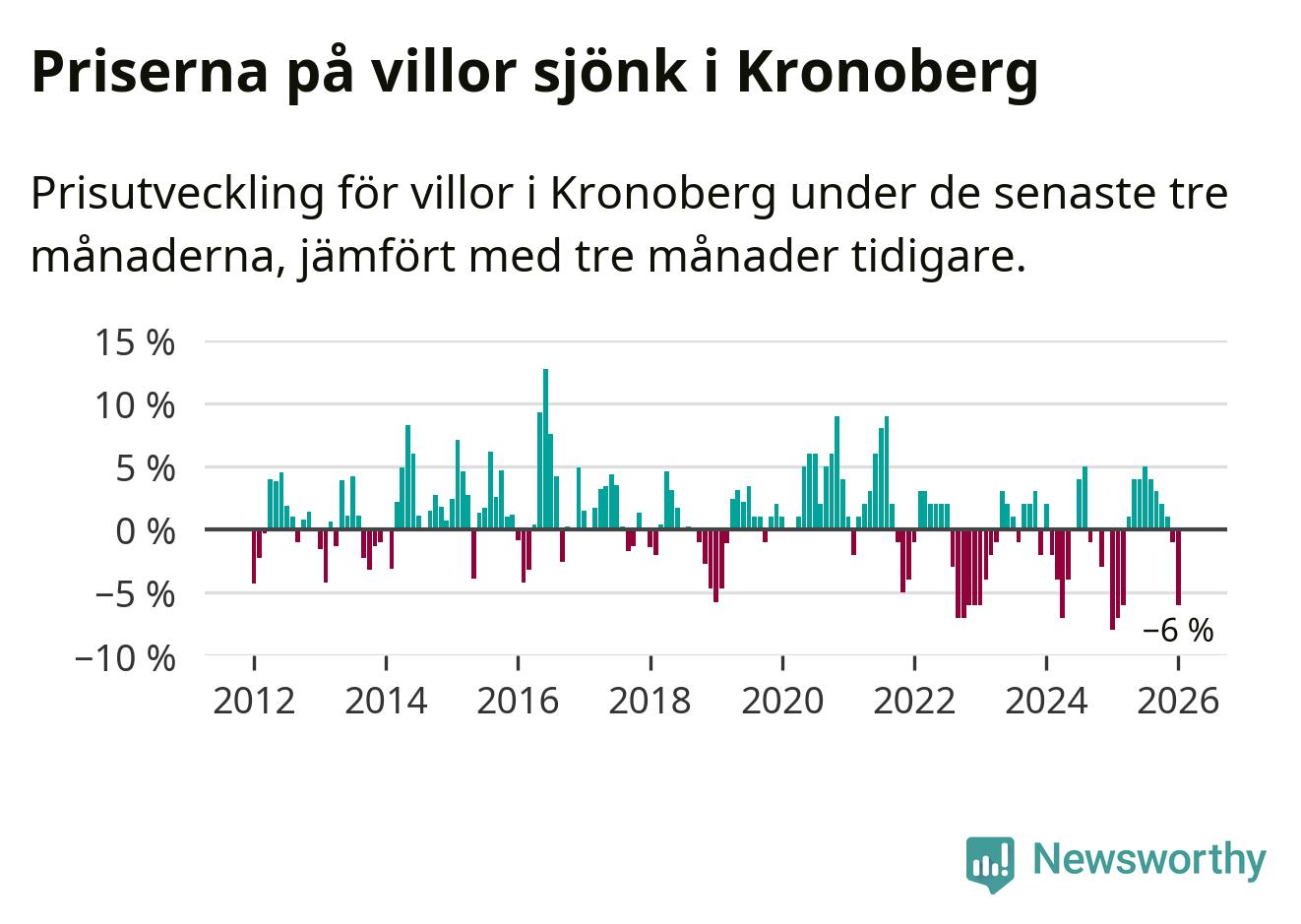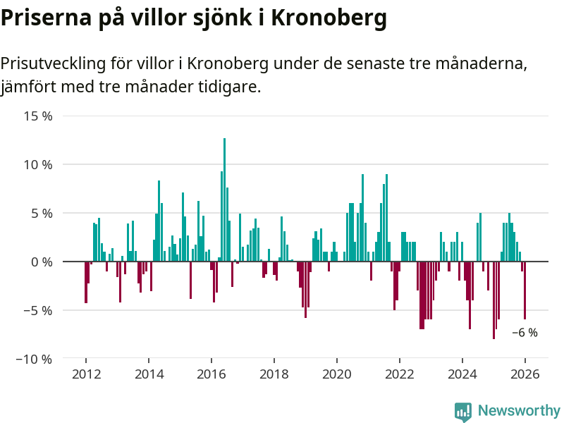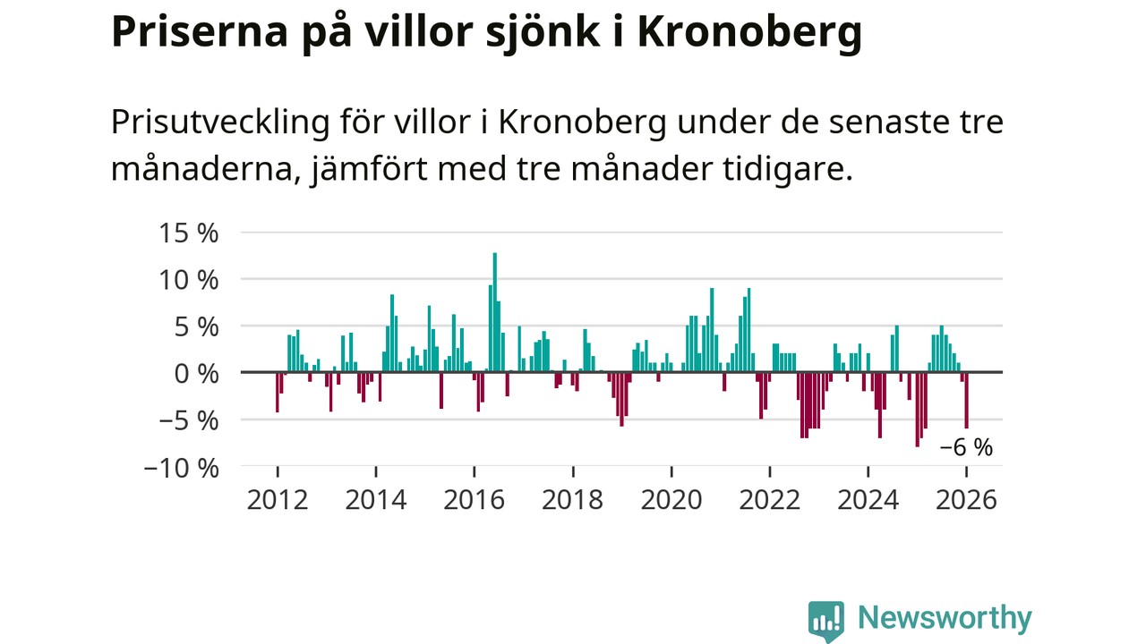 Villapriserna sjönk mellan november och januari med 6 procent i Kronobergs län. Det är en betydande nedgång jämfört med det gångna året då priserna i snitt stått stilla.