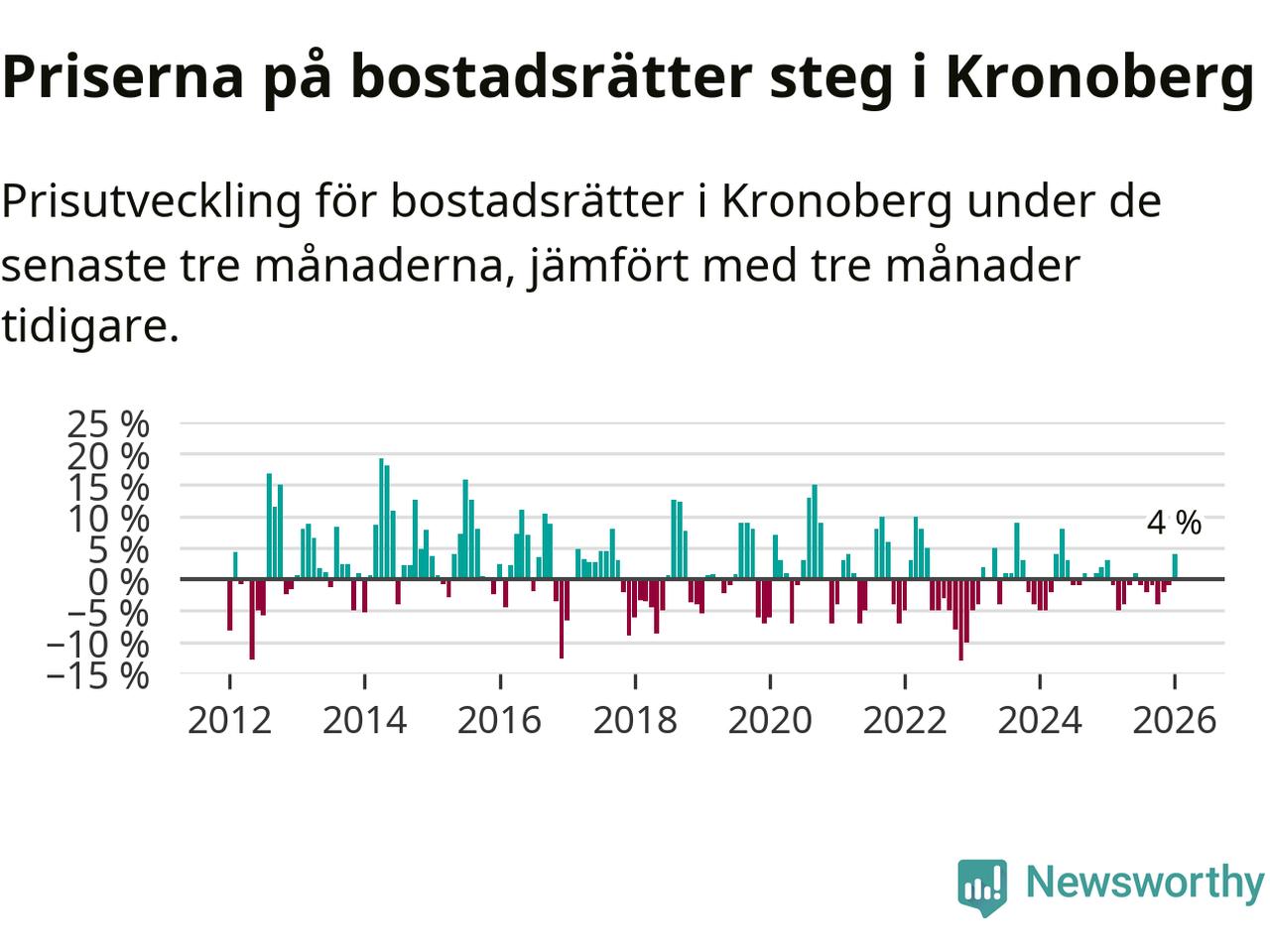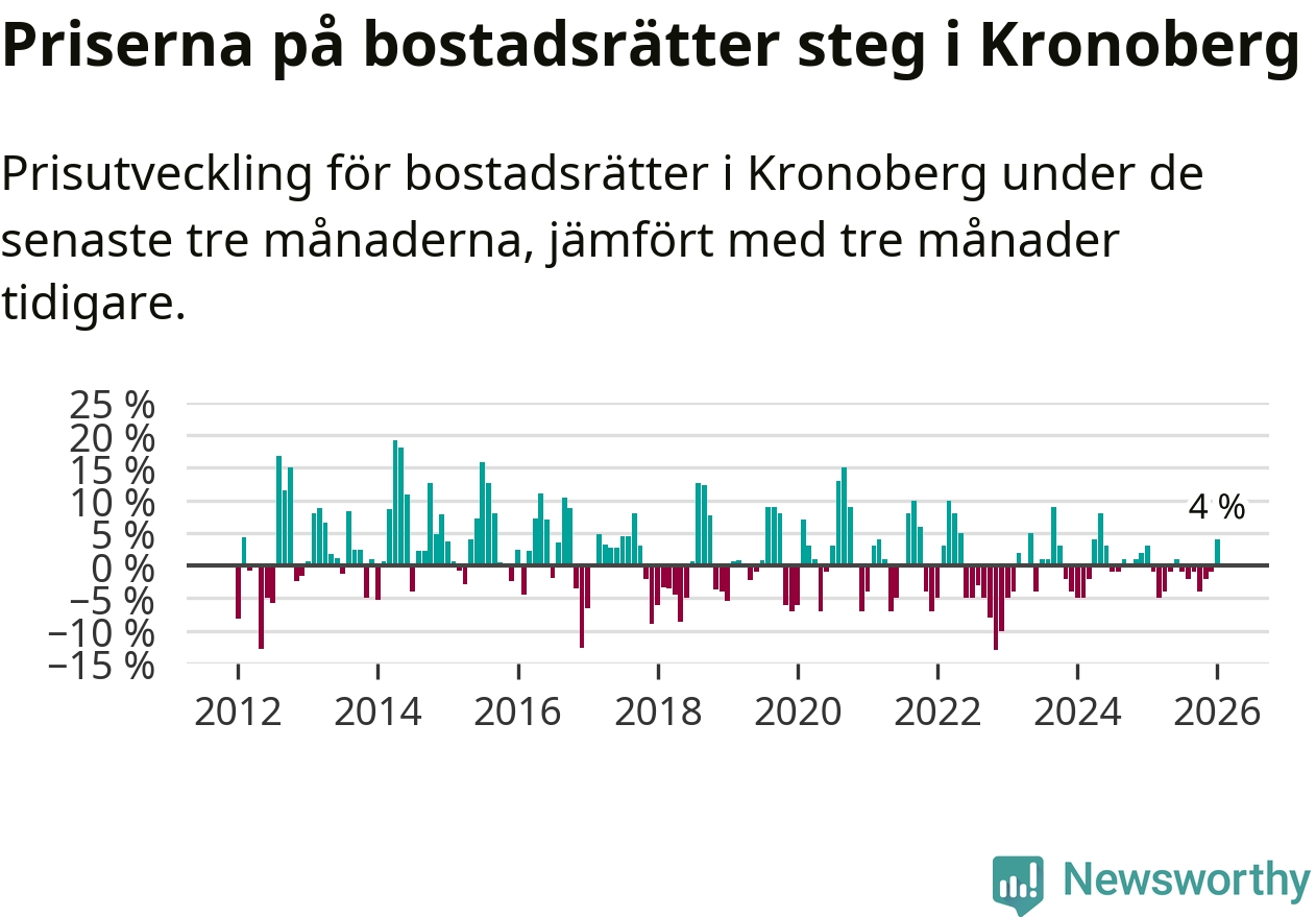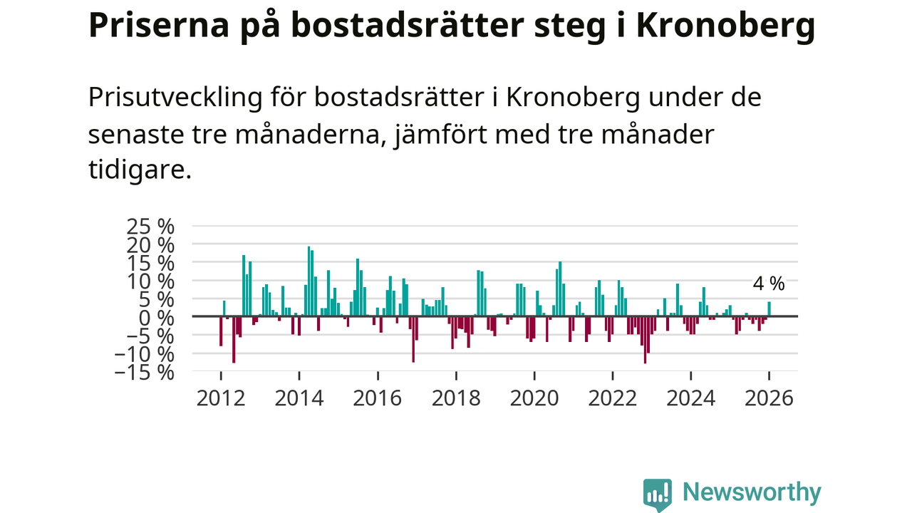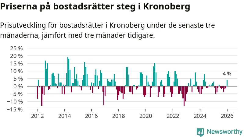 Priserna på bostadsrätter har gått upp i Kronobergs län. Medelpriset på försäljningarna under de senaste tre månaderna visar på en uppgång med 4 procent.