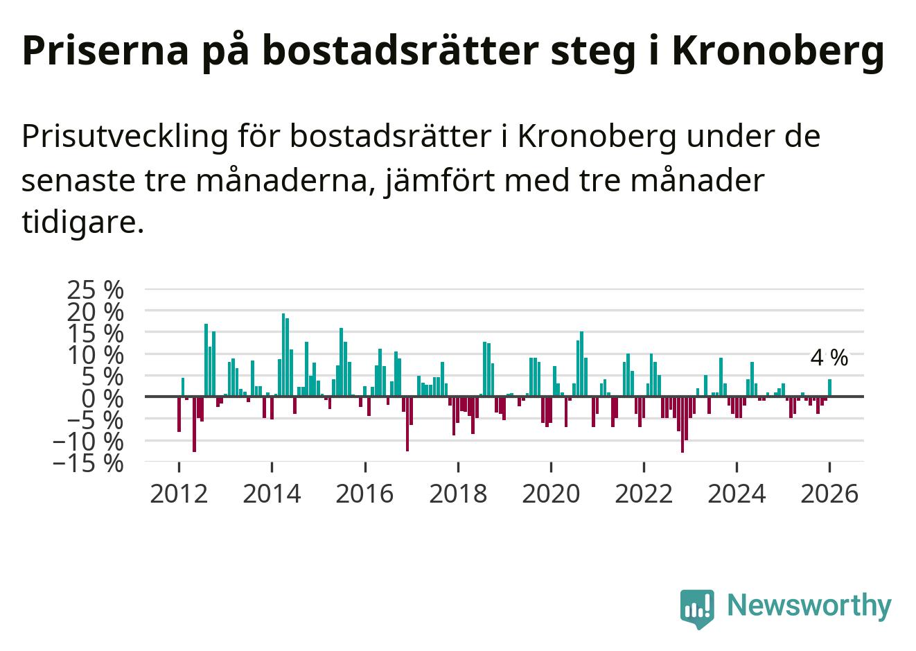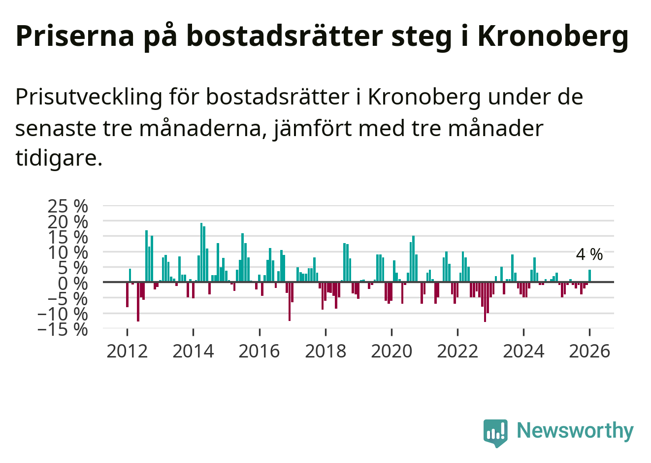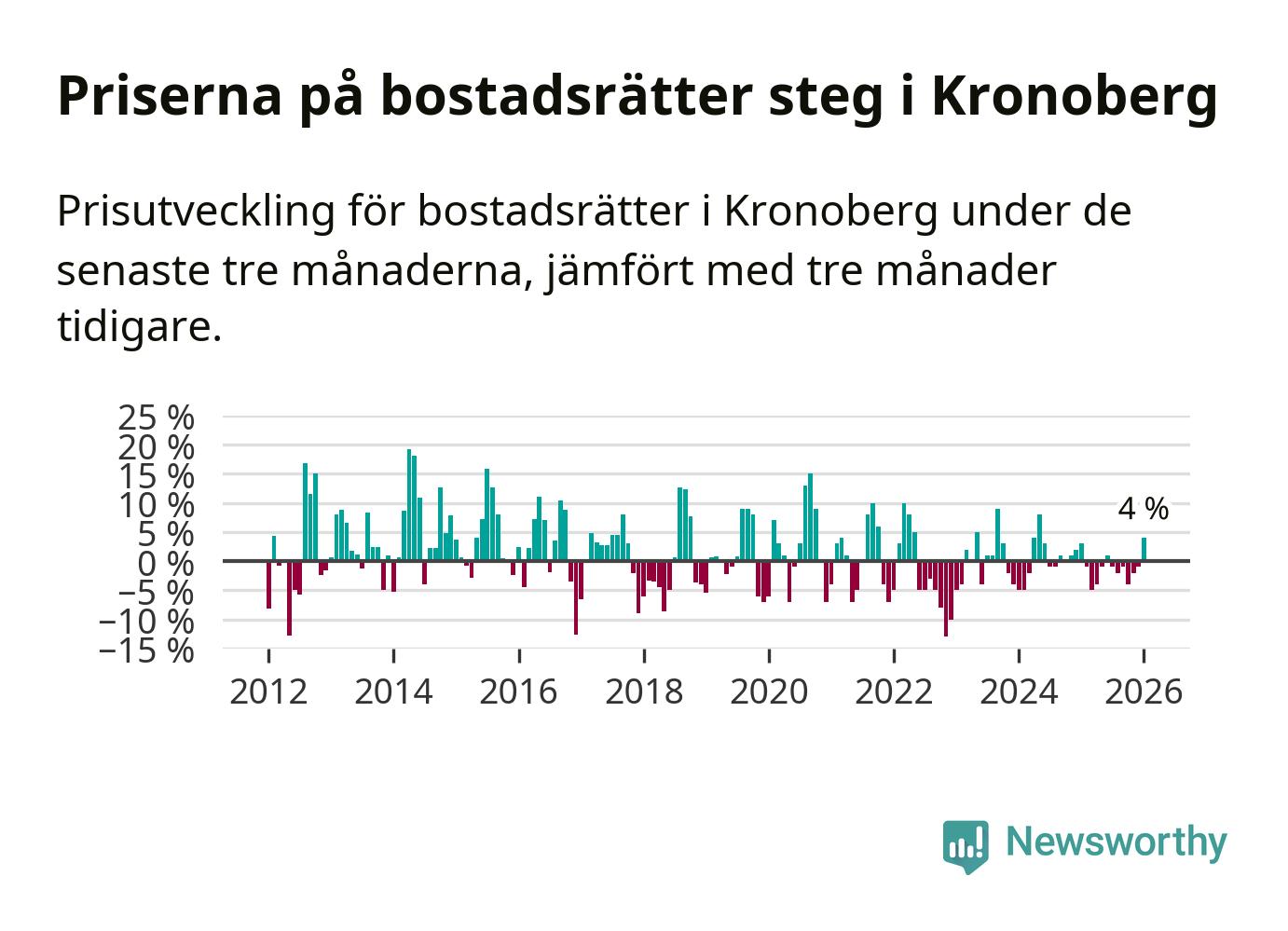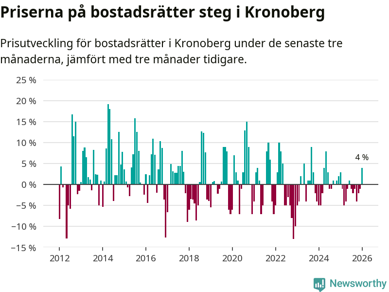 Priserna på bostadsrätter har gått upp i Kronobergs län. Medelpriset på försäljningarna under de senaste tre månaderna visar på en uppgång med 4 procent.