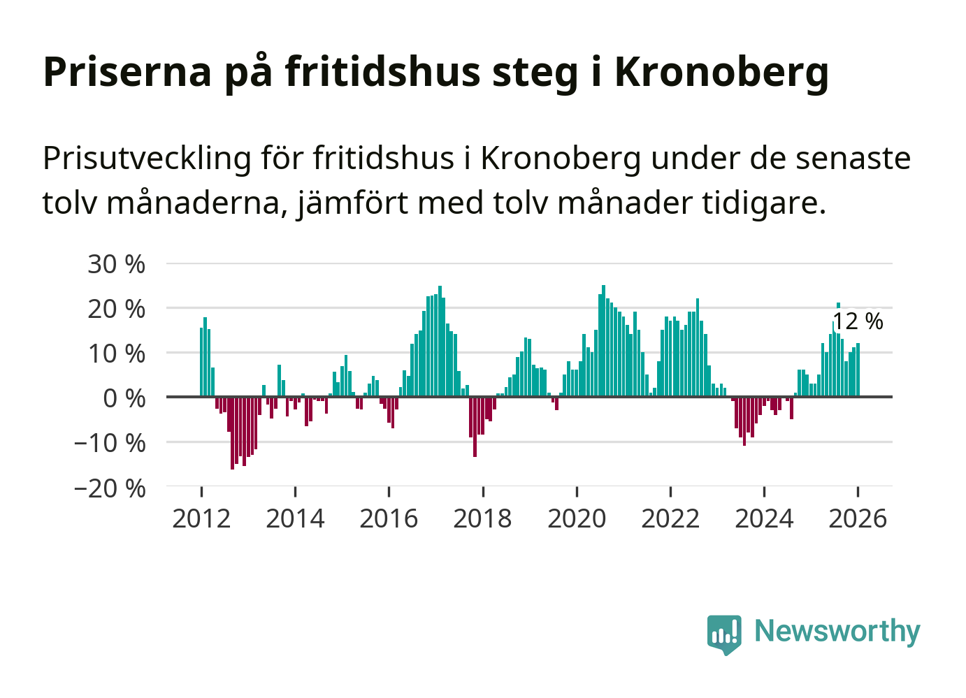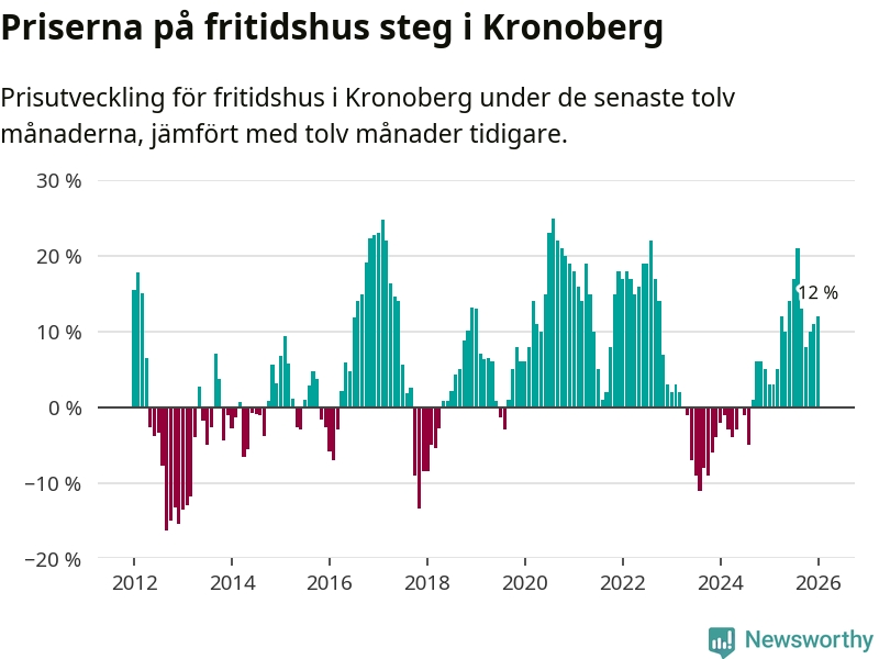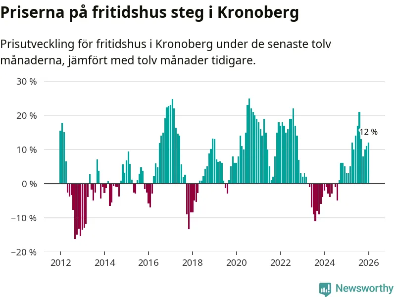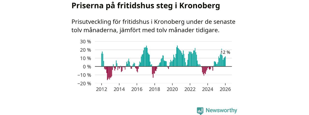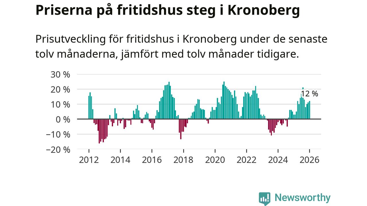 Priserna på fritidshus har gått upp i Kronobergs län. Medelpriset på försäljningarna under de senaste tolv månaderna visar på en uppgång med 12 procent.