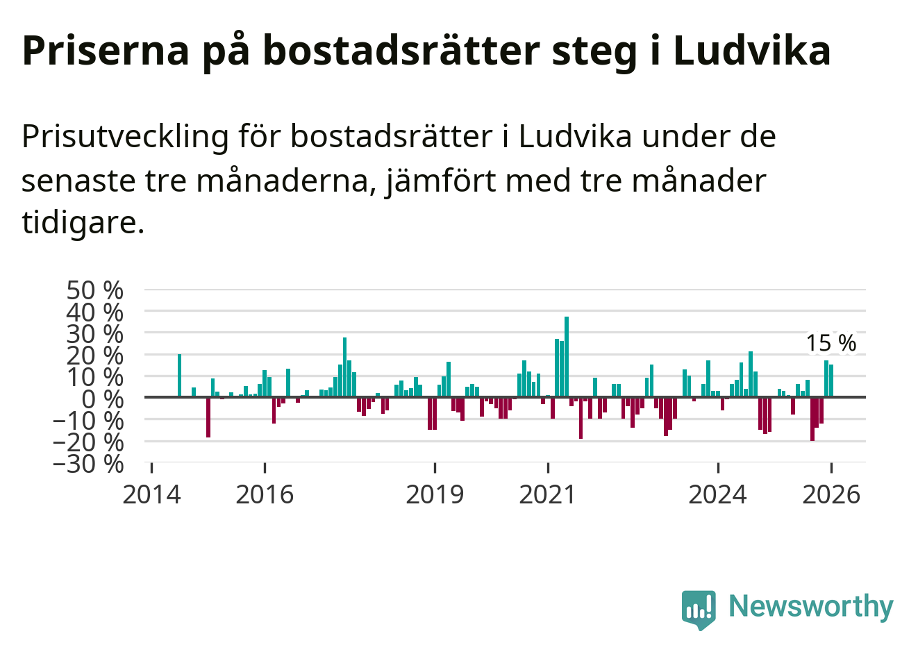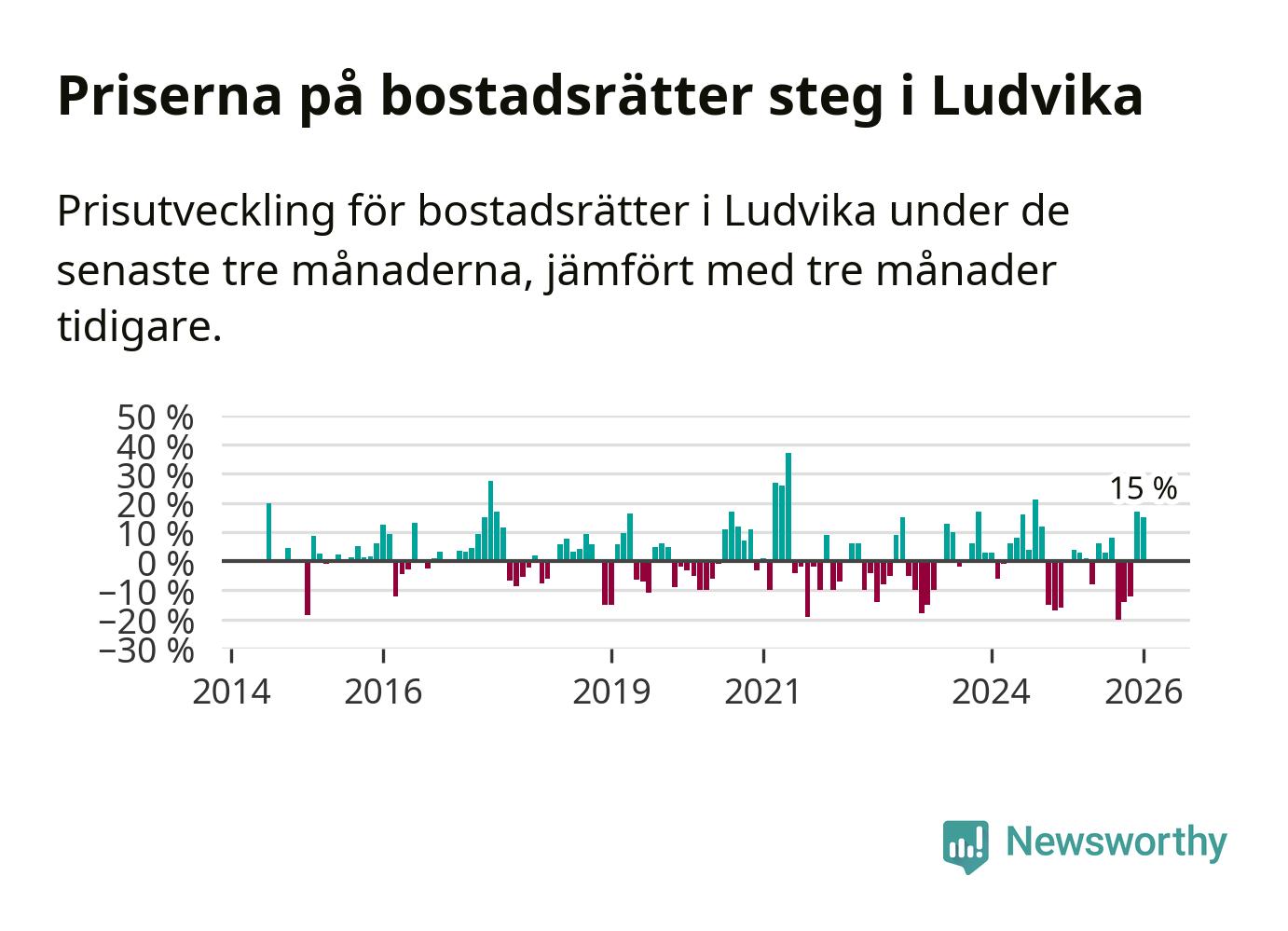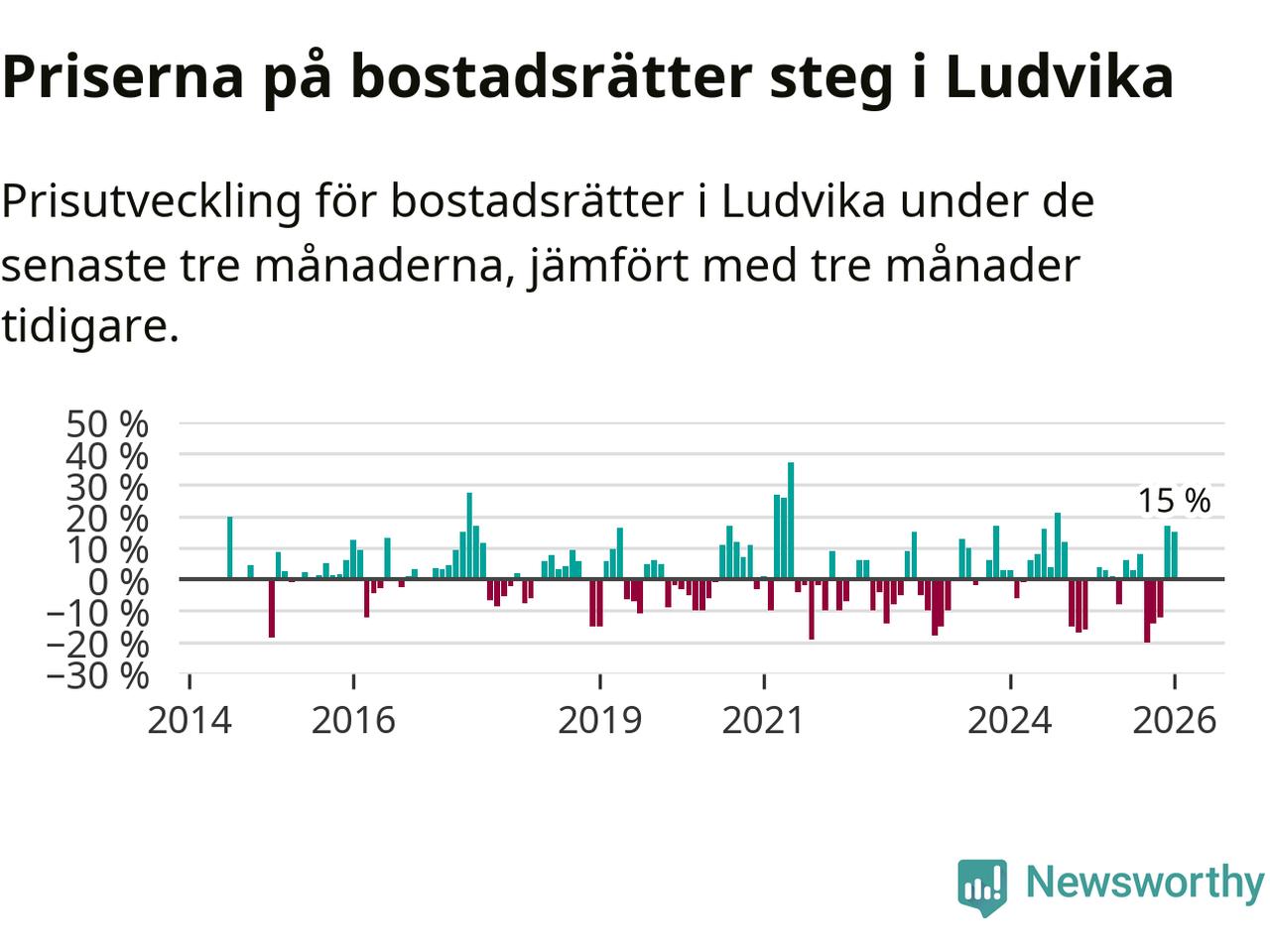 Priserna på bostadsrätter steg mellan november och januari med 15 procent i Ludvika kommun. Det är en betydande uppgång jämfört med det gångna året då priserna i snitt stått stilla.