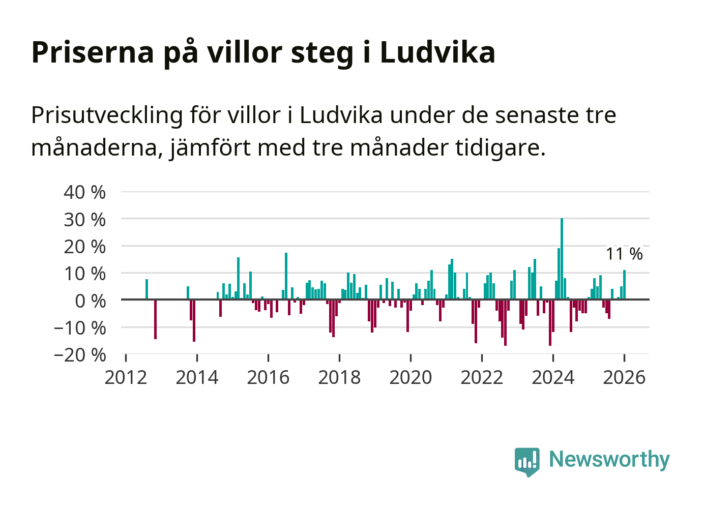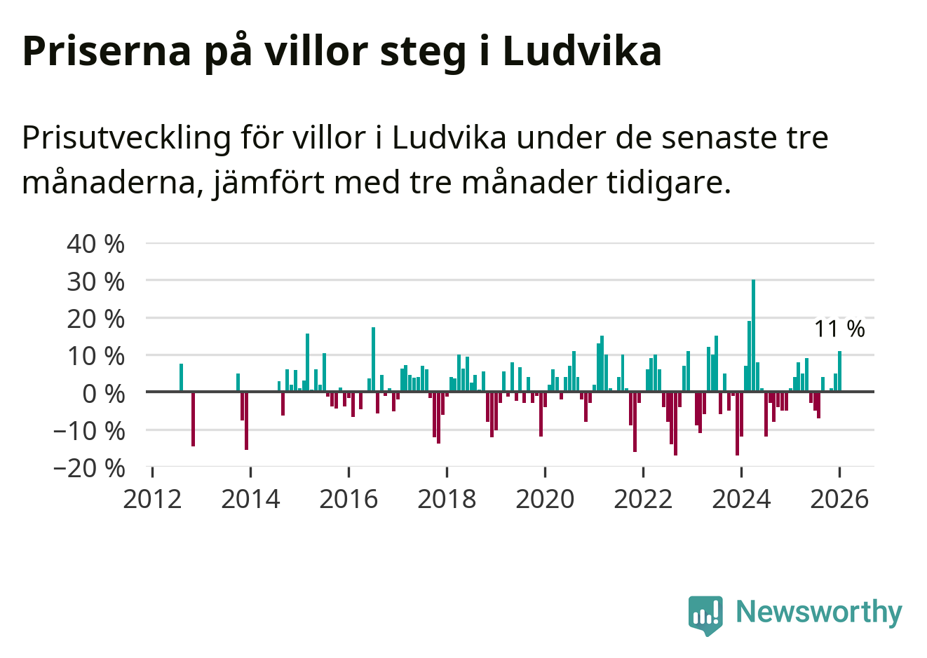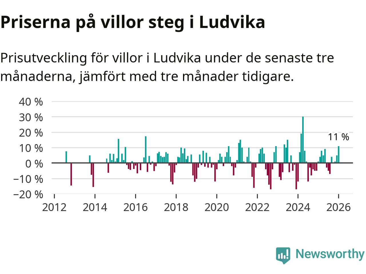 Villapriserna har gått upp i Ludvika kommun. Medelpriset på försäljningarna under de senaste tre månaderna visar på en uppgång med 11 procent.