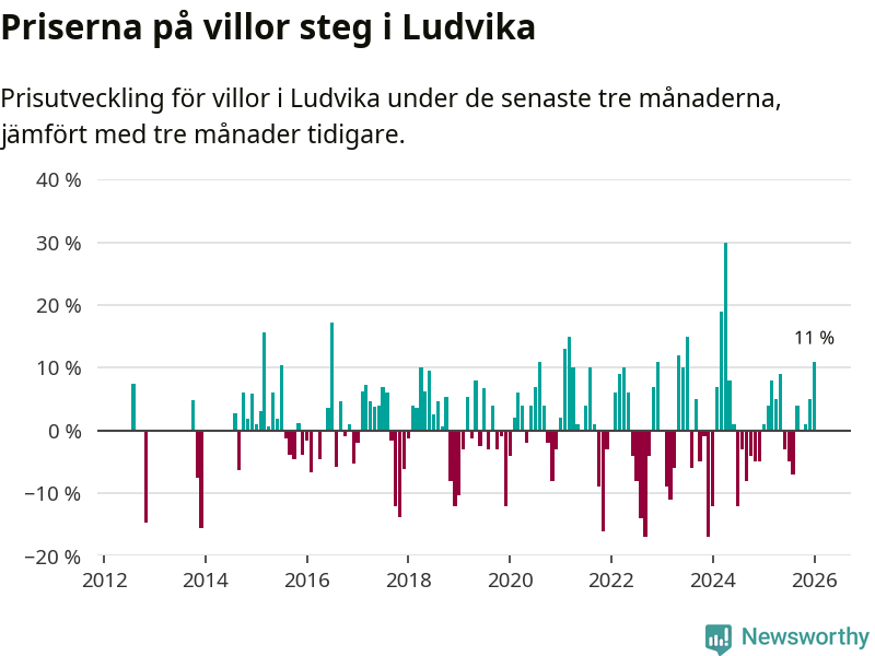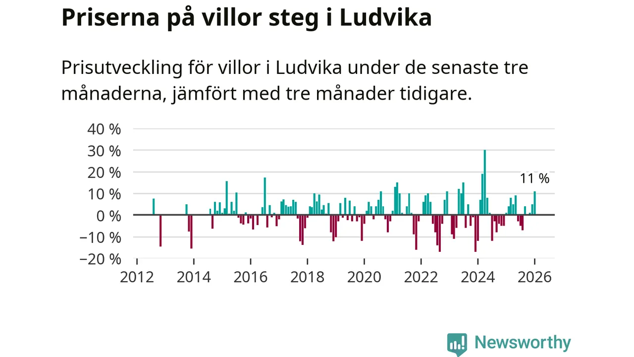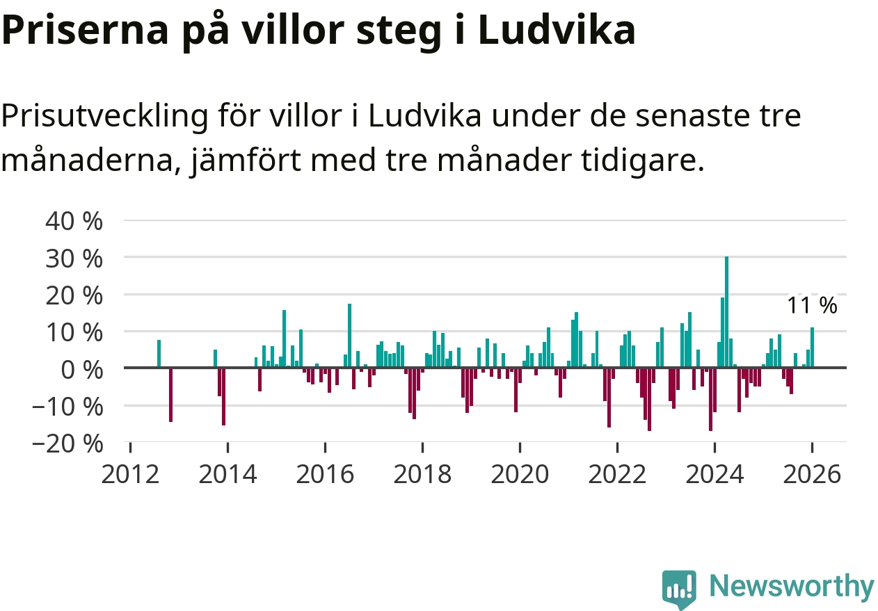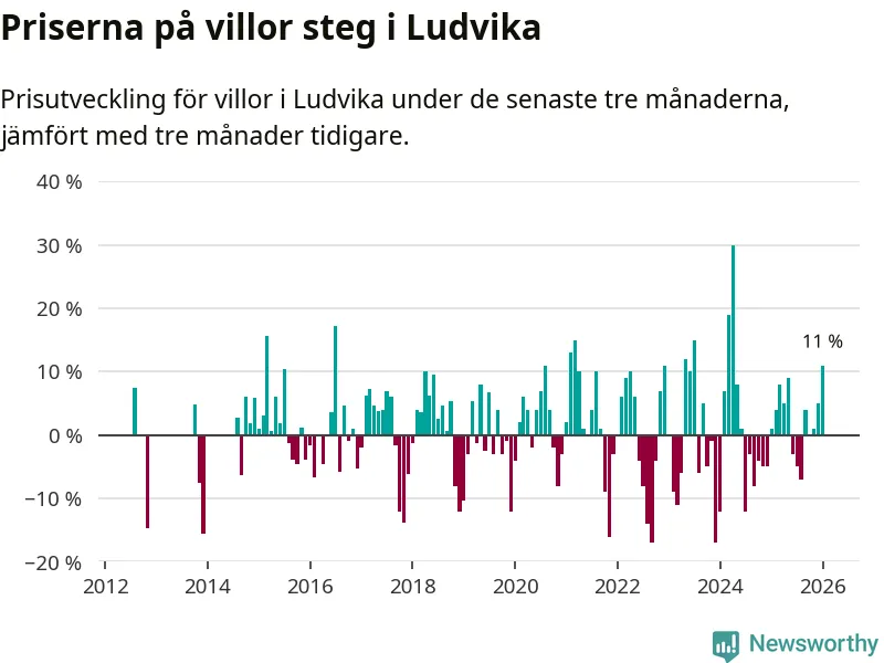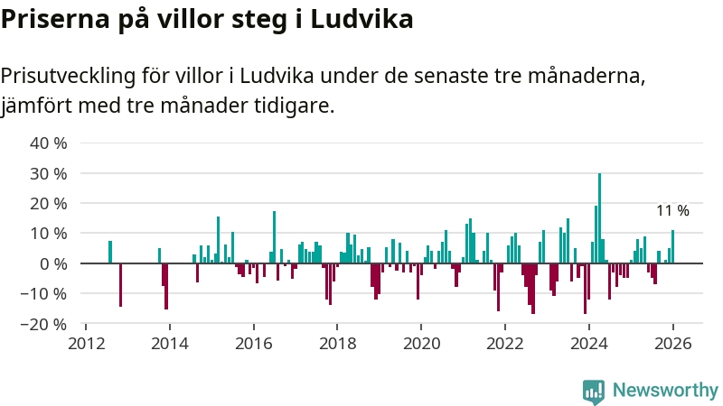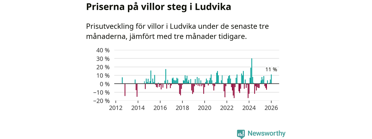 Villapriserna har gått upp i Ludvika kommun. Medelpriset på försäljningarna under de senaste tre månaderna visar på en uppgång med 11 procent.