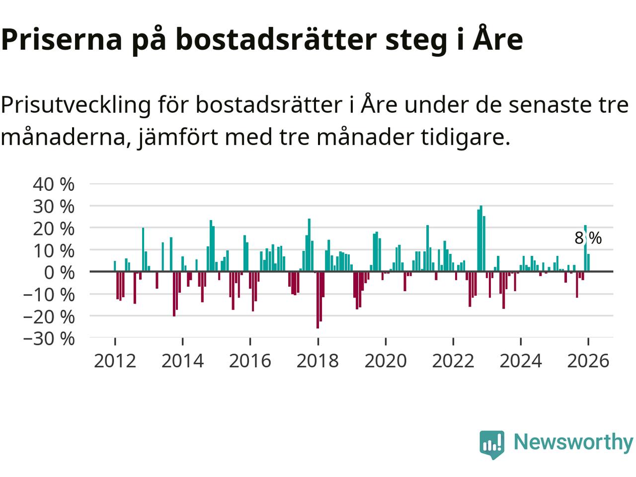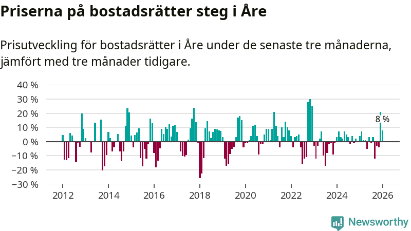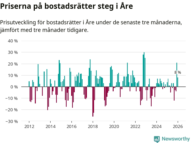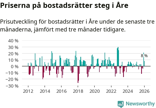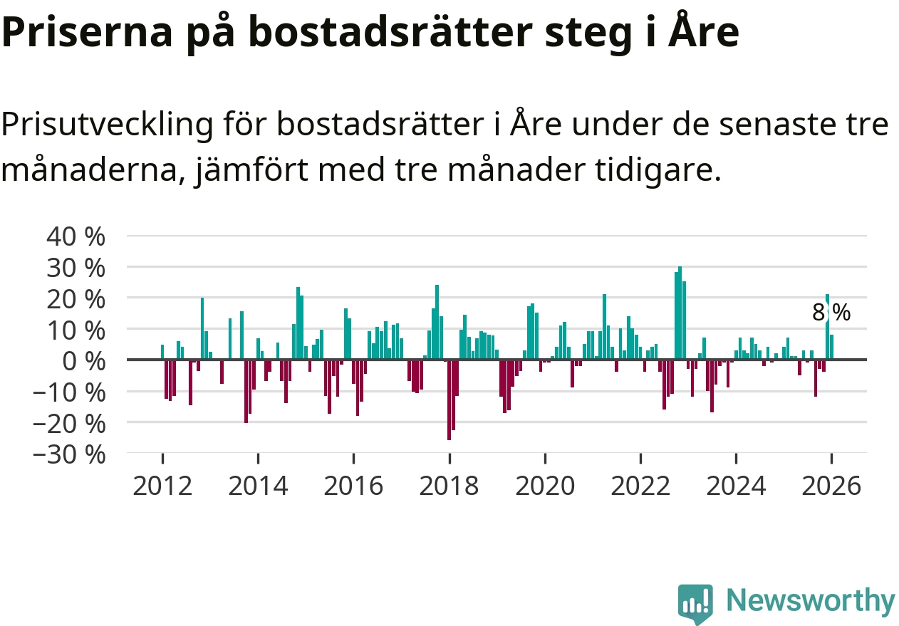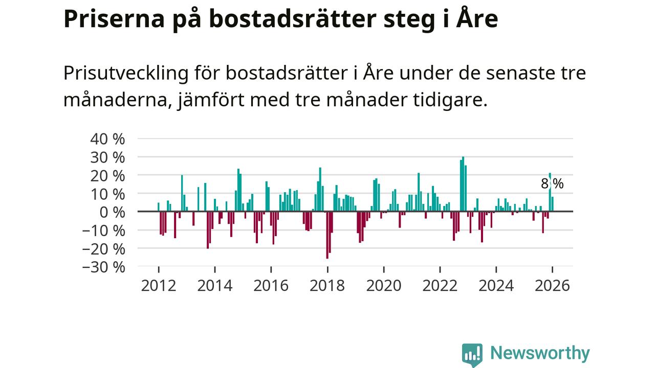 Priserna på bostadsrätter har gått upp i Åre kommun. Medelpriset på försäljningarna under de senaste tre månaderna visar på en uppgång med 8 procent.