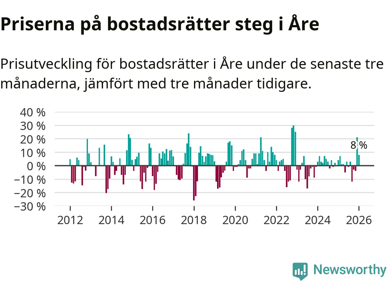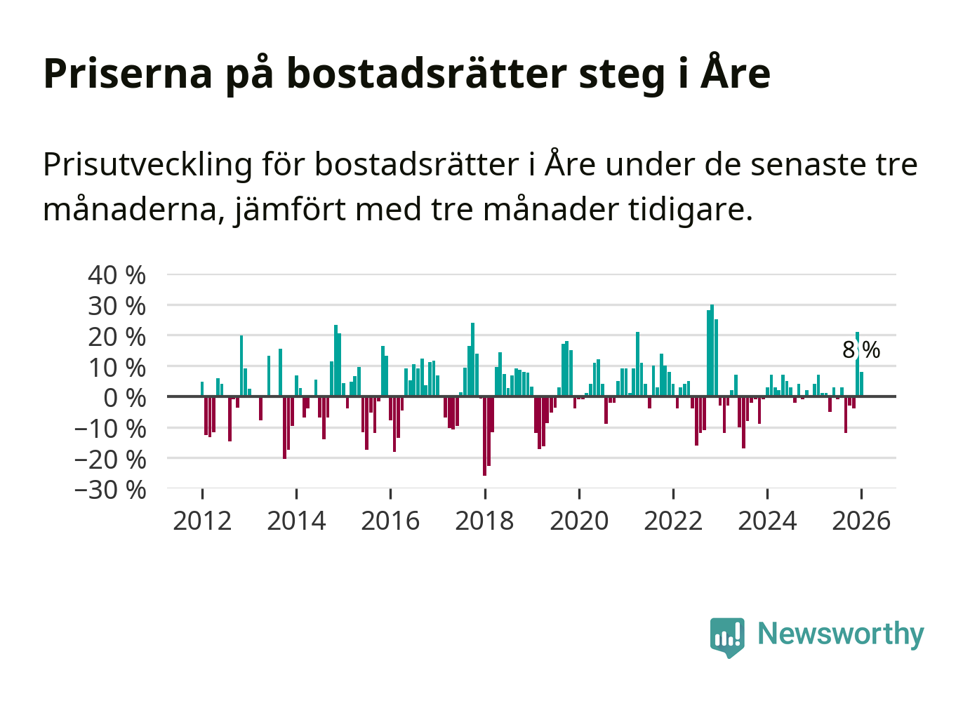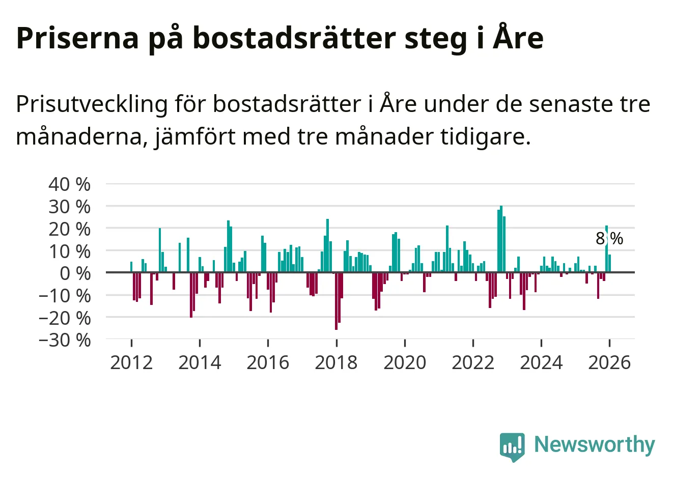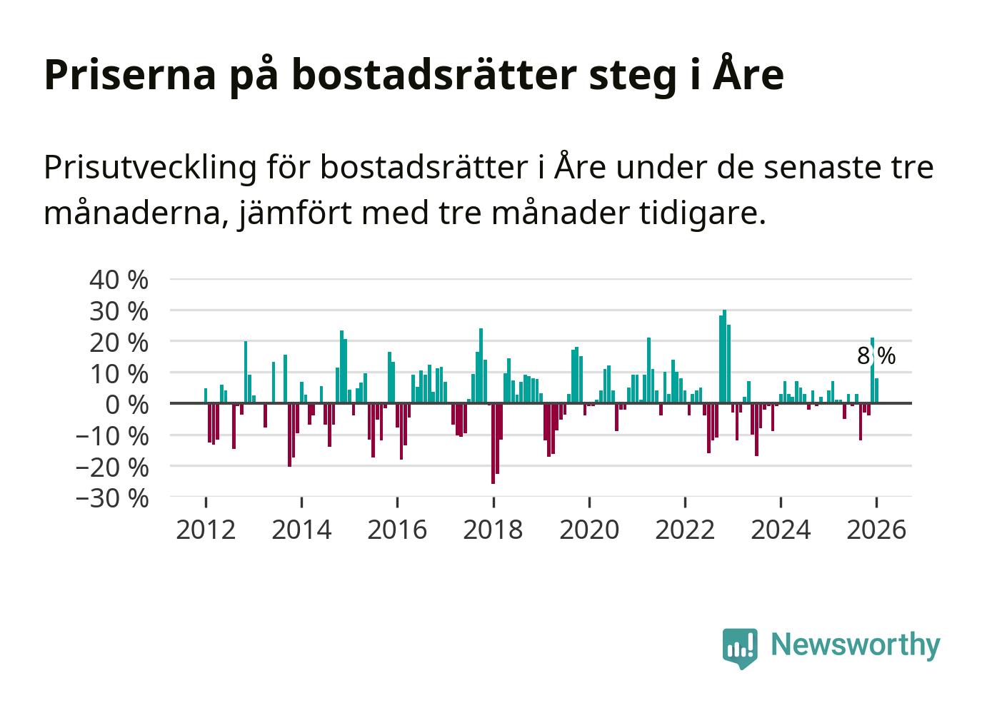 Priserna på bostadsrätter har gått upp i Åre kommun. Medelpriset på försäljningarna under de senaste tre månaderna visar på en uppgång med 8 procent.