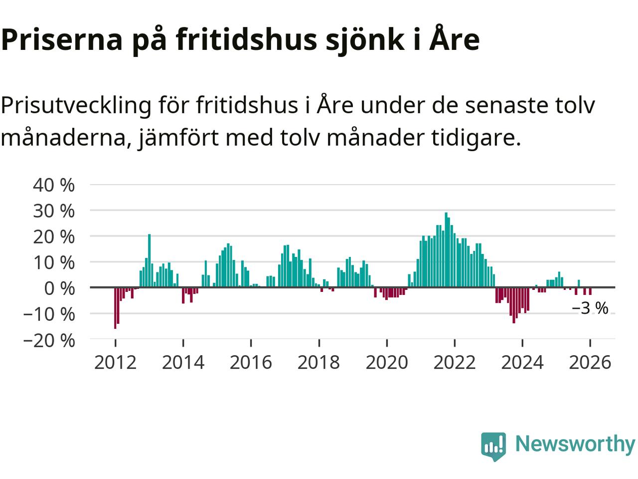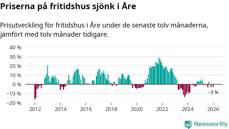 Priserna på fritidshus har gått ner i Åre kommun. Medelpriset på försäljningarna under de senaste tolv månaderna visar på en nedgång med 3 procent.