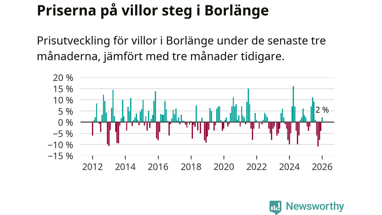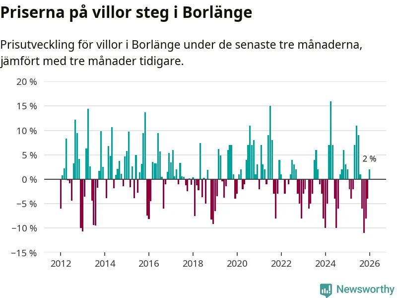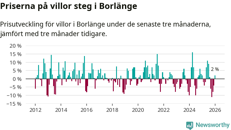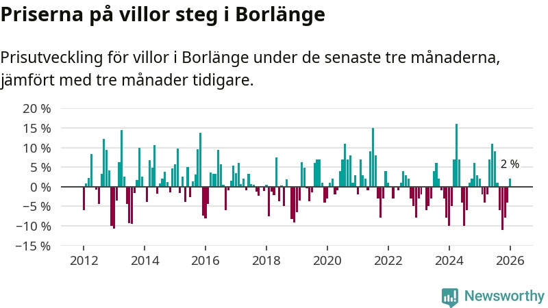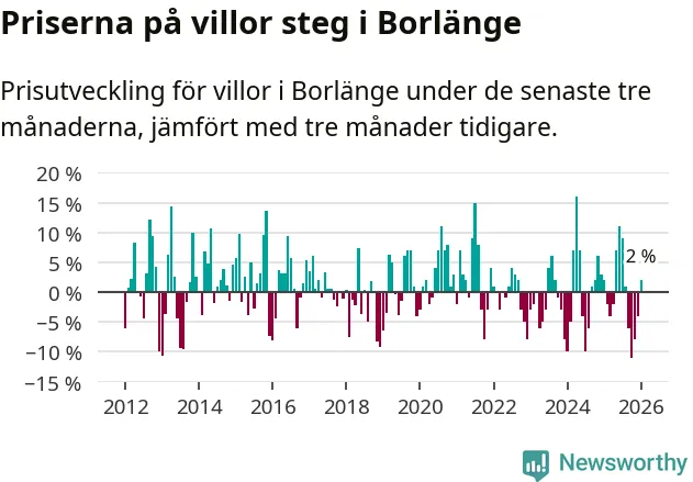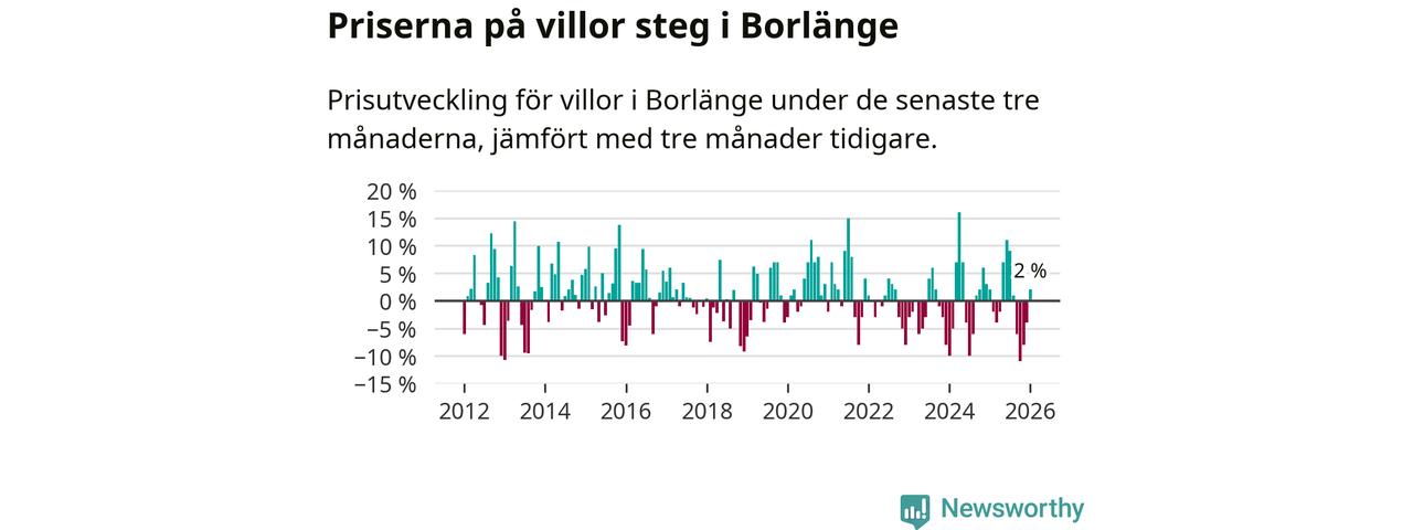 Villapriserna har gått upp i Borlänge kommun. Medelpriset på försäljningarna under de senaste tre månaderna visar på en uppgång med 2 procent.