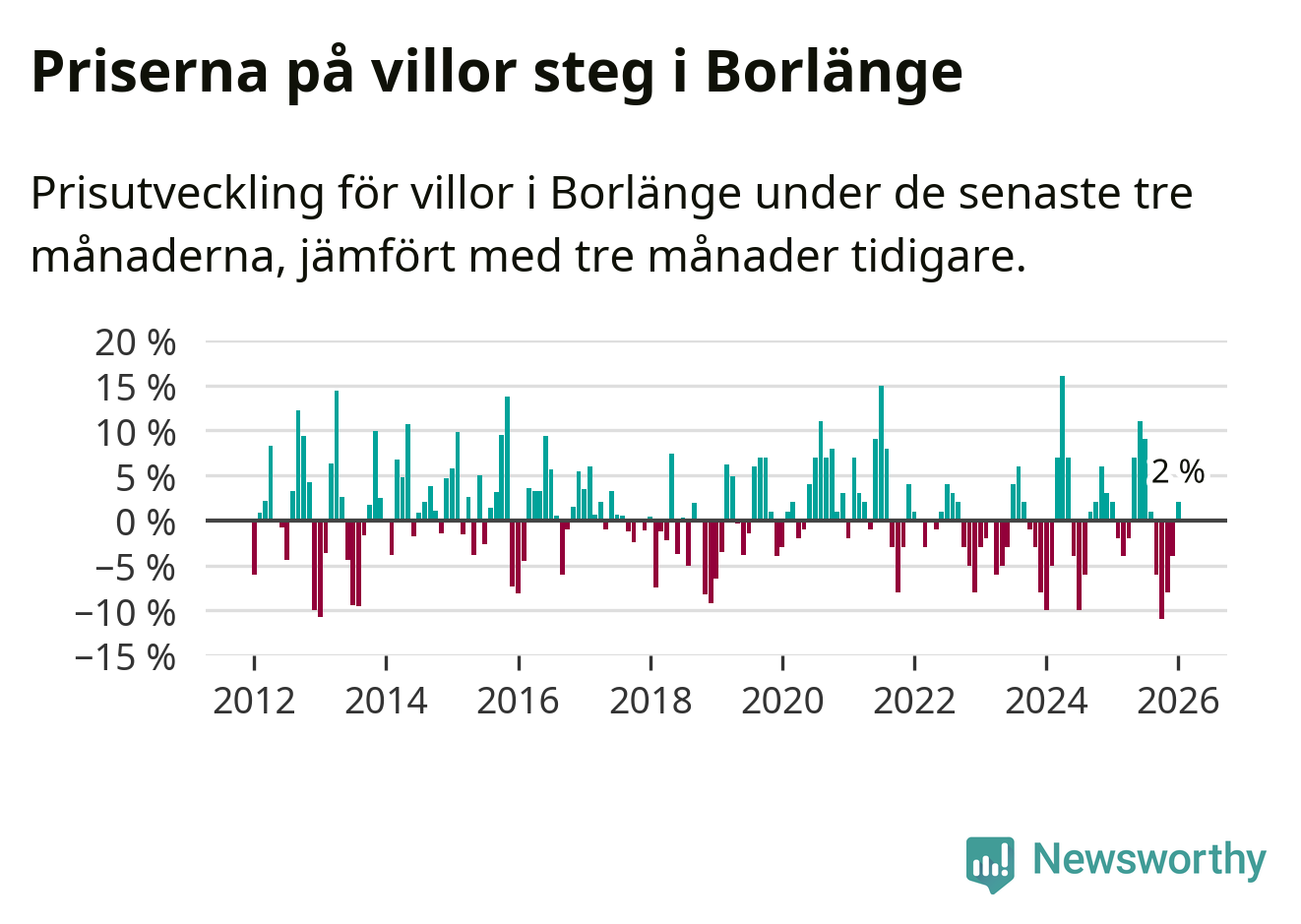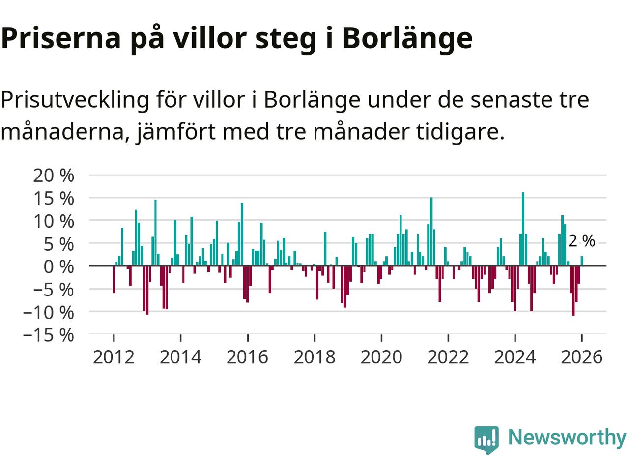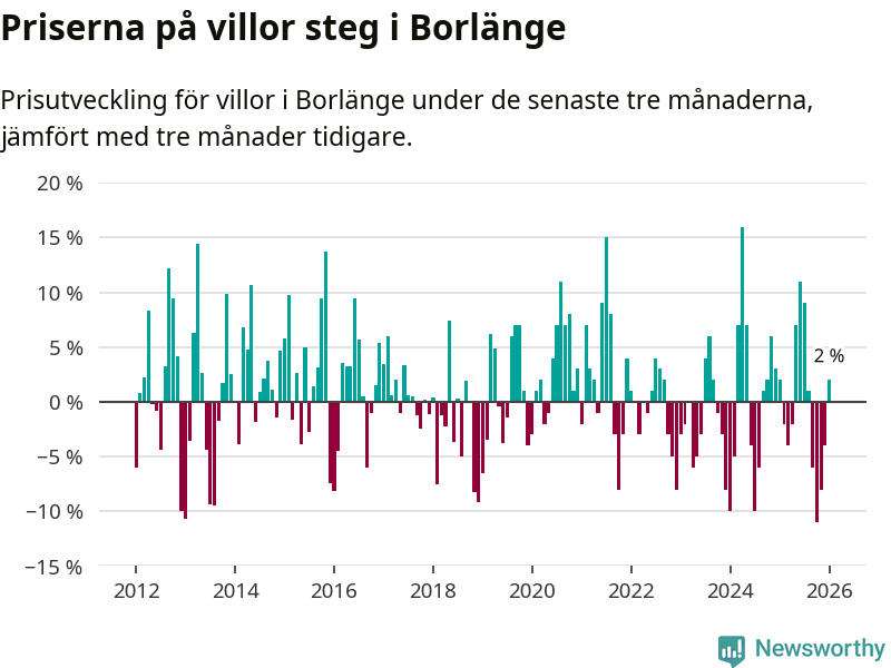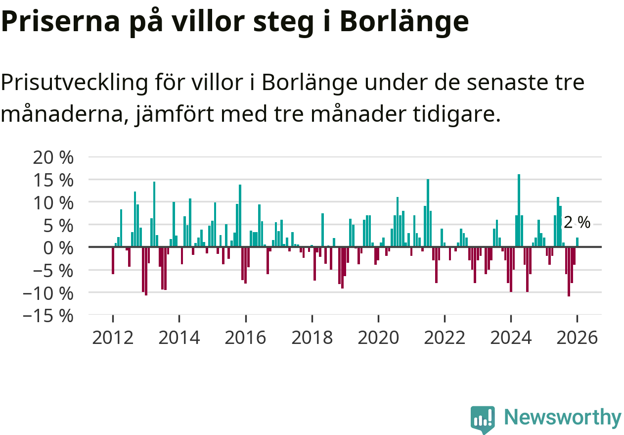 Villapriserna har gått upp i Borlänge kommun. Medelpriset på försäljningarna under de senaste tre månaderna visar på en uppgång med 2 procent.