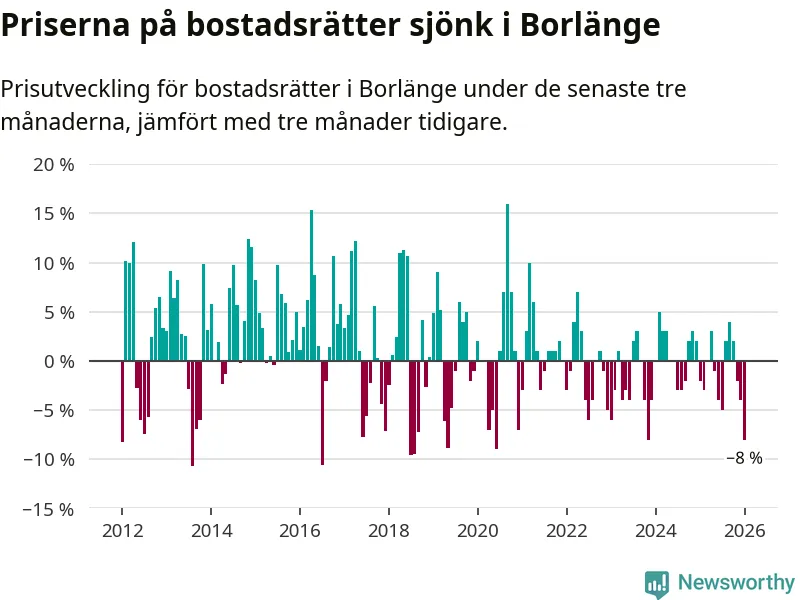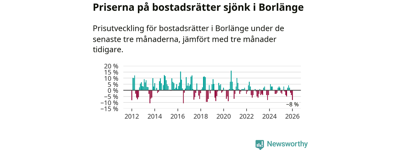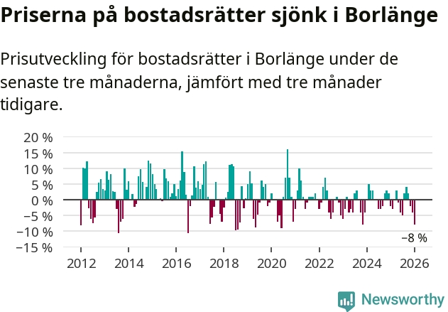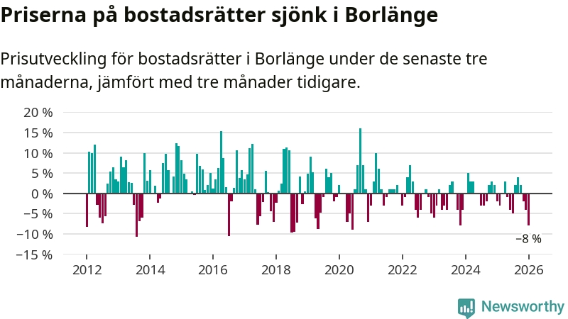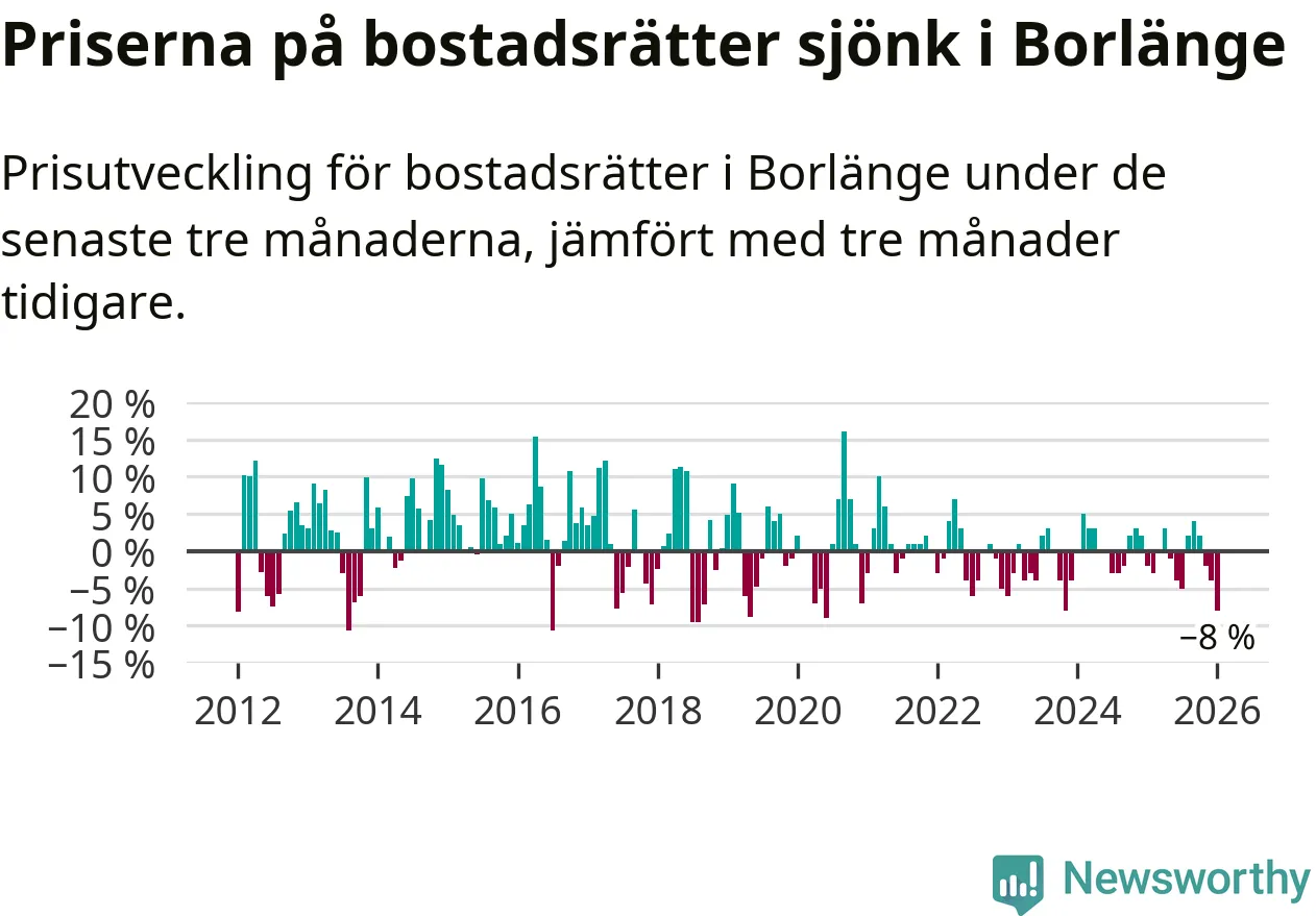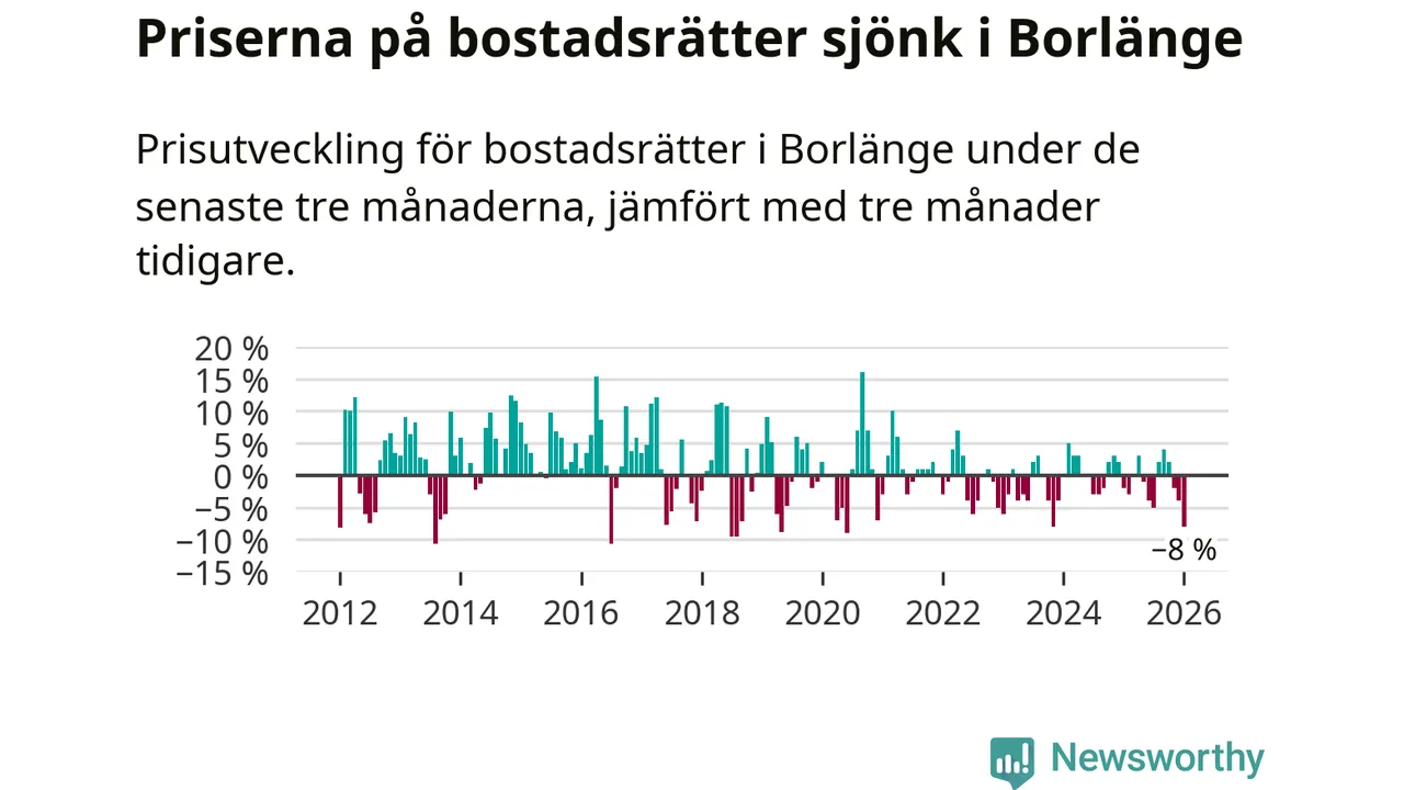 Priserna på bostadsrätter har gått ner i Borlänge kommun. Medelpriset på försäljningarna under de senaste tre månaderna visar på en nedgång med 8 procent.