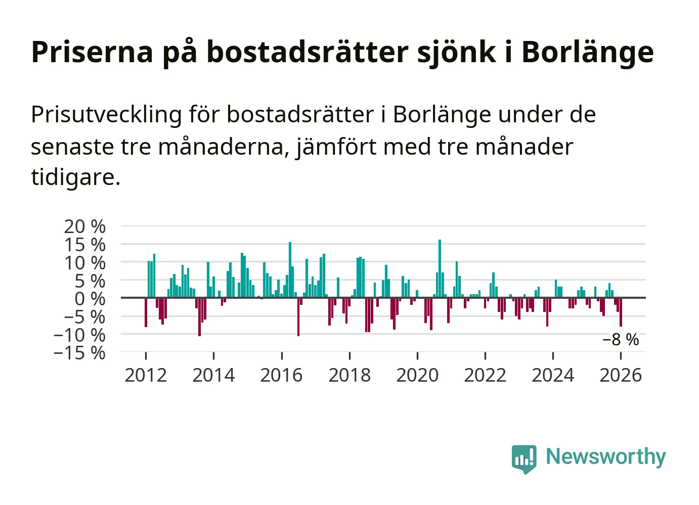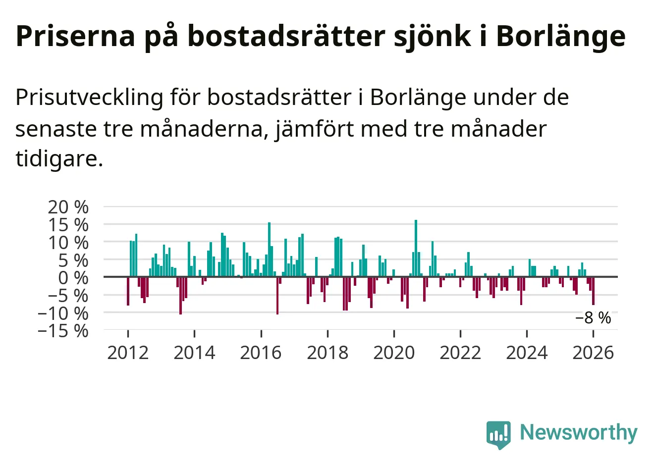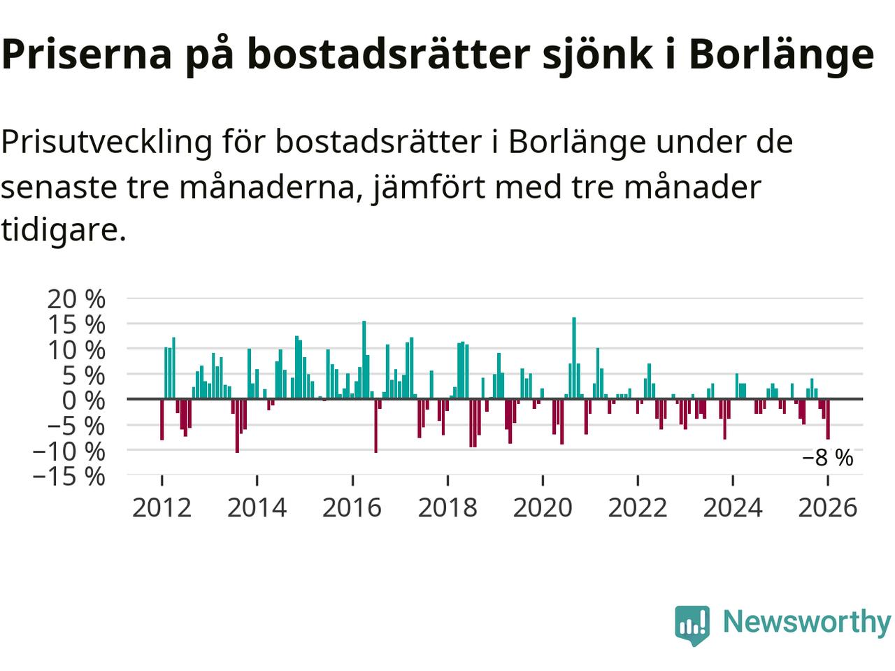 Priserna på bostadsrätter har gått ner i Borlänge kommun. Medelpriset på försäljningarna under de senaste tre månaderna visar på en nedgång med 8 procent.