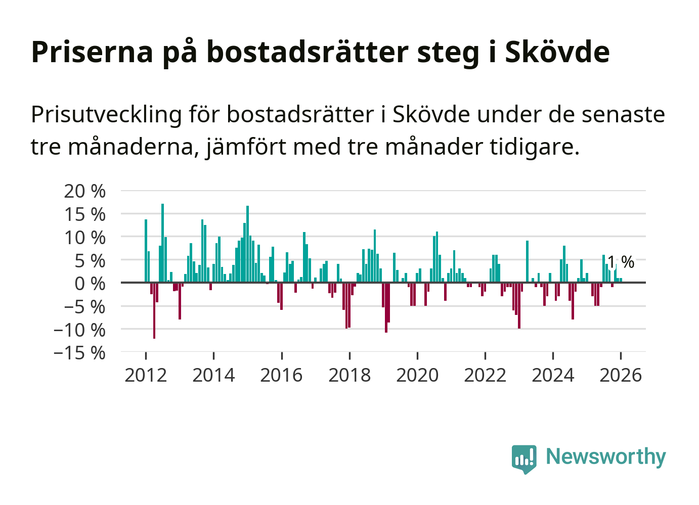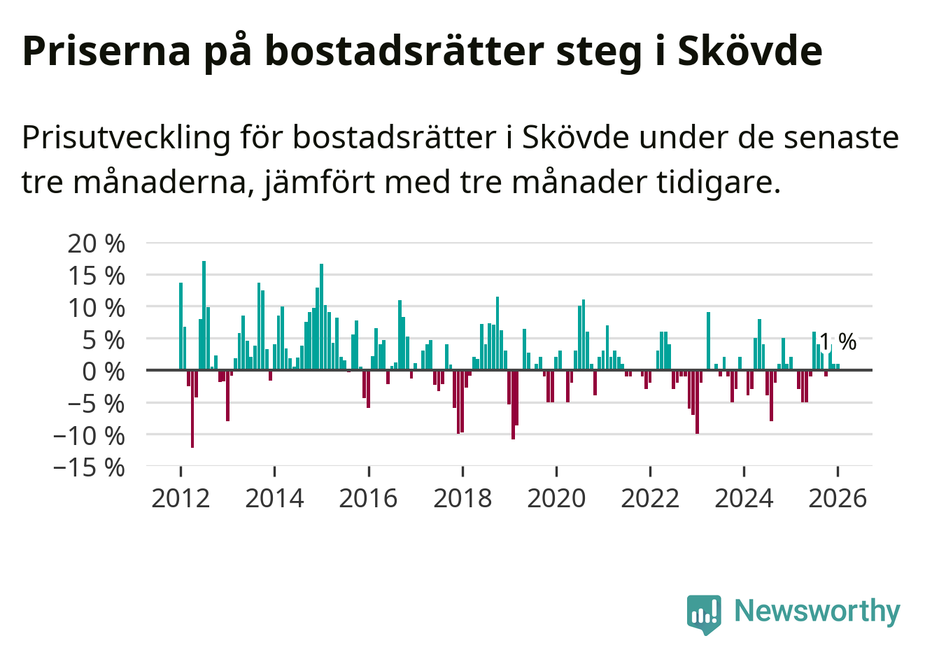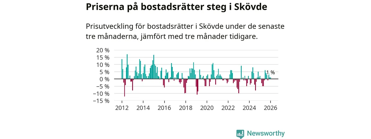 Priserna på bostadsrätter har gått upp i Skövde kommun. Medelpriset på försäljningarna under de senaste tre månaderna visar på en uppgång med 1 procent.
