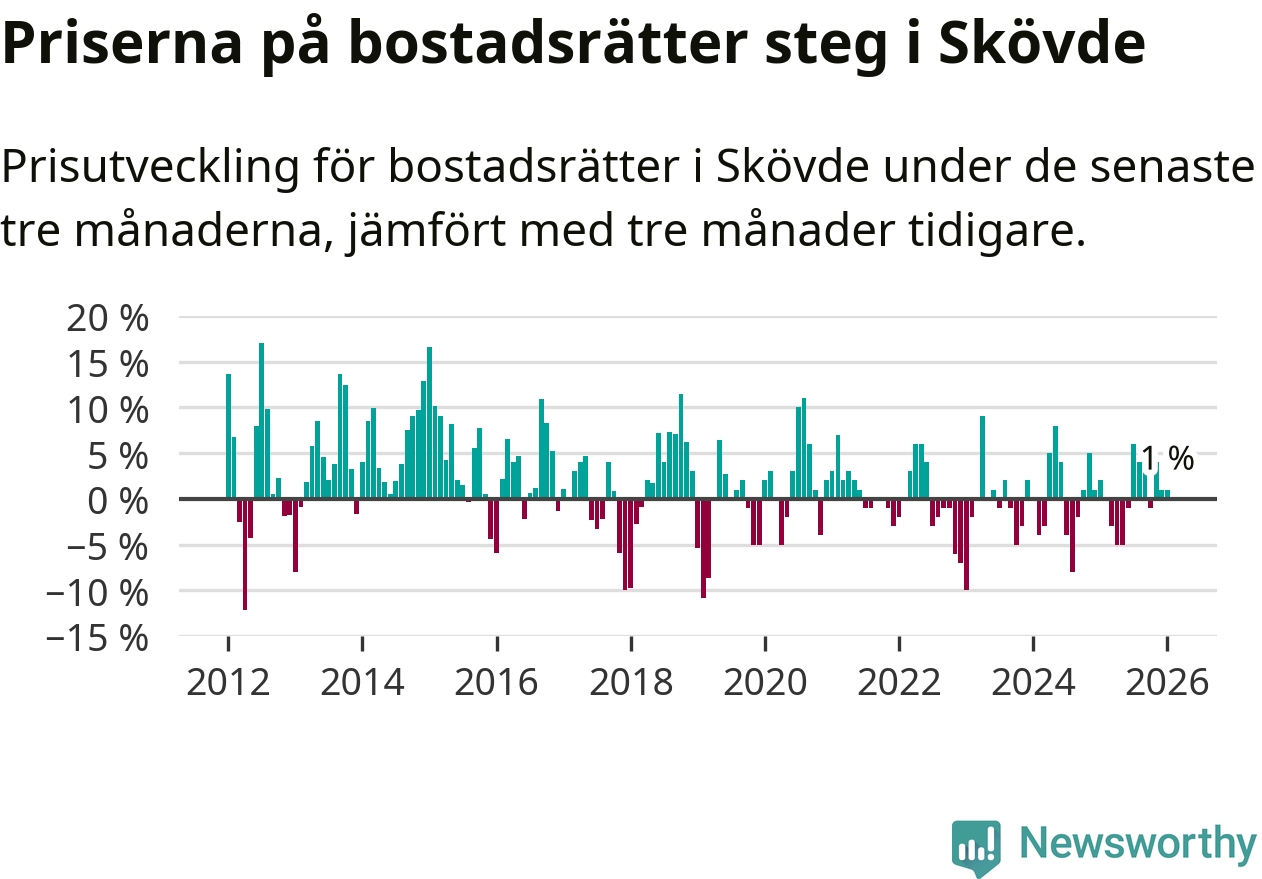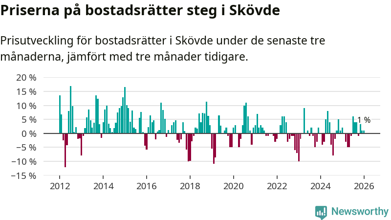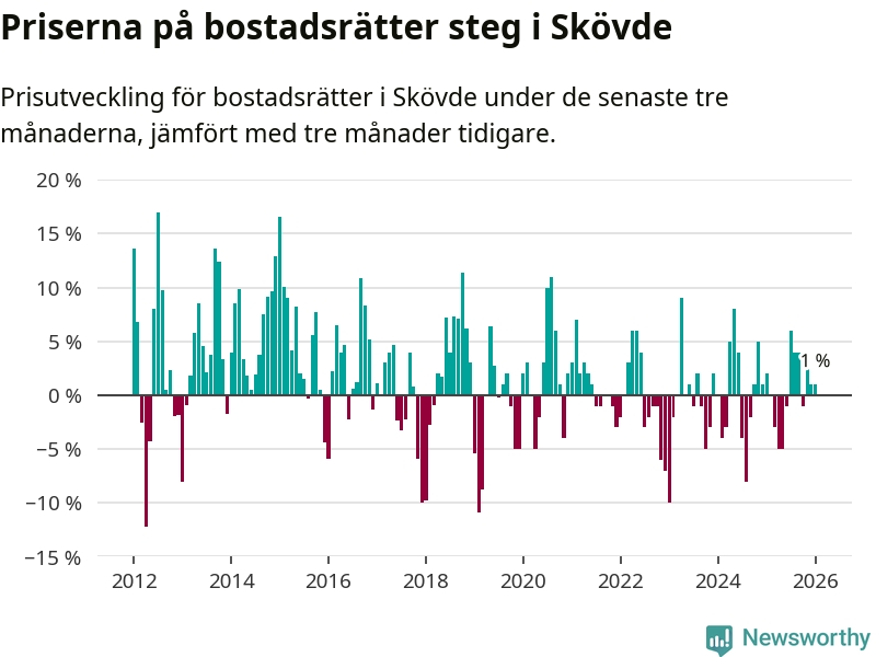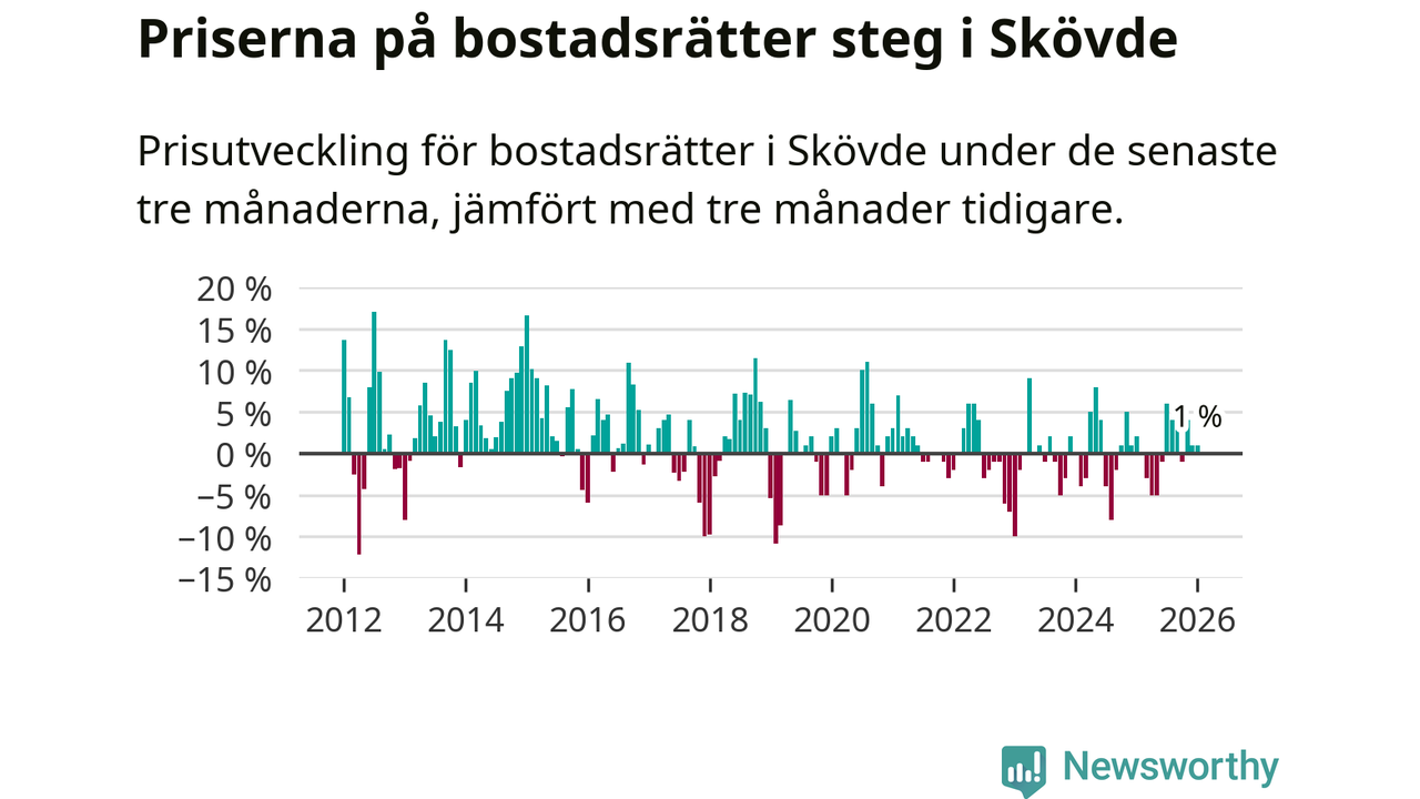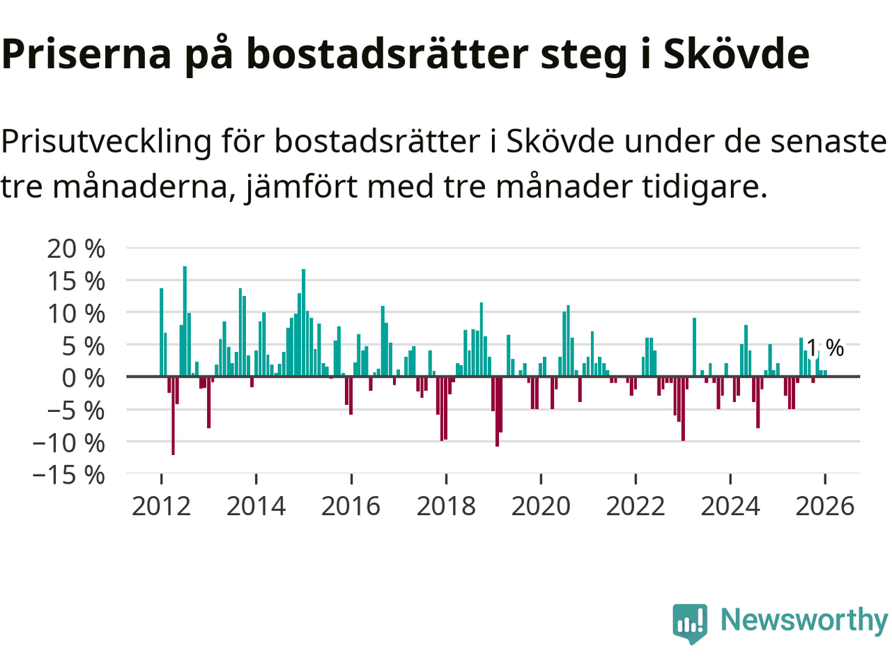 Priserna på bostadsrätter har gått upp i Skövde kommun. Medelpriset på försäljningarna under de senaste tre månaderna visar på en uppgång med 1 procent.