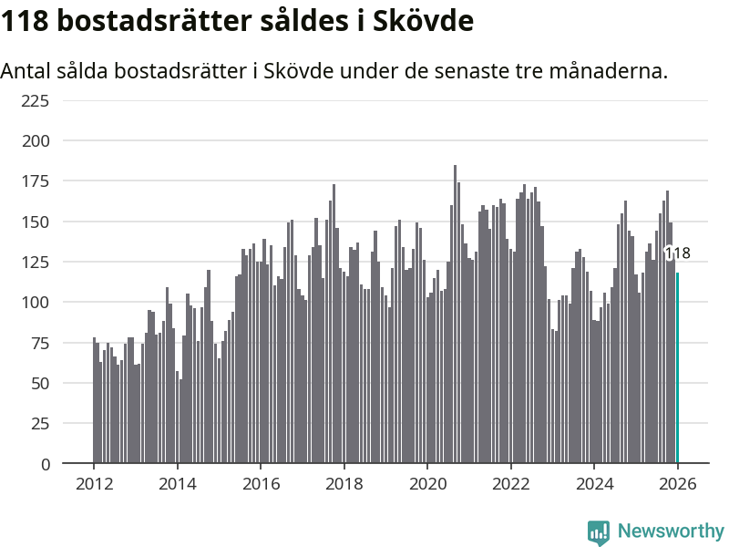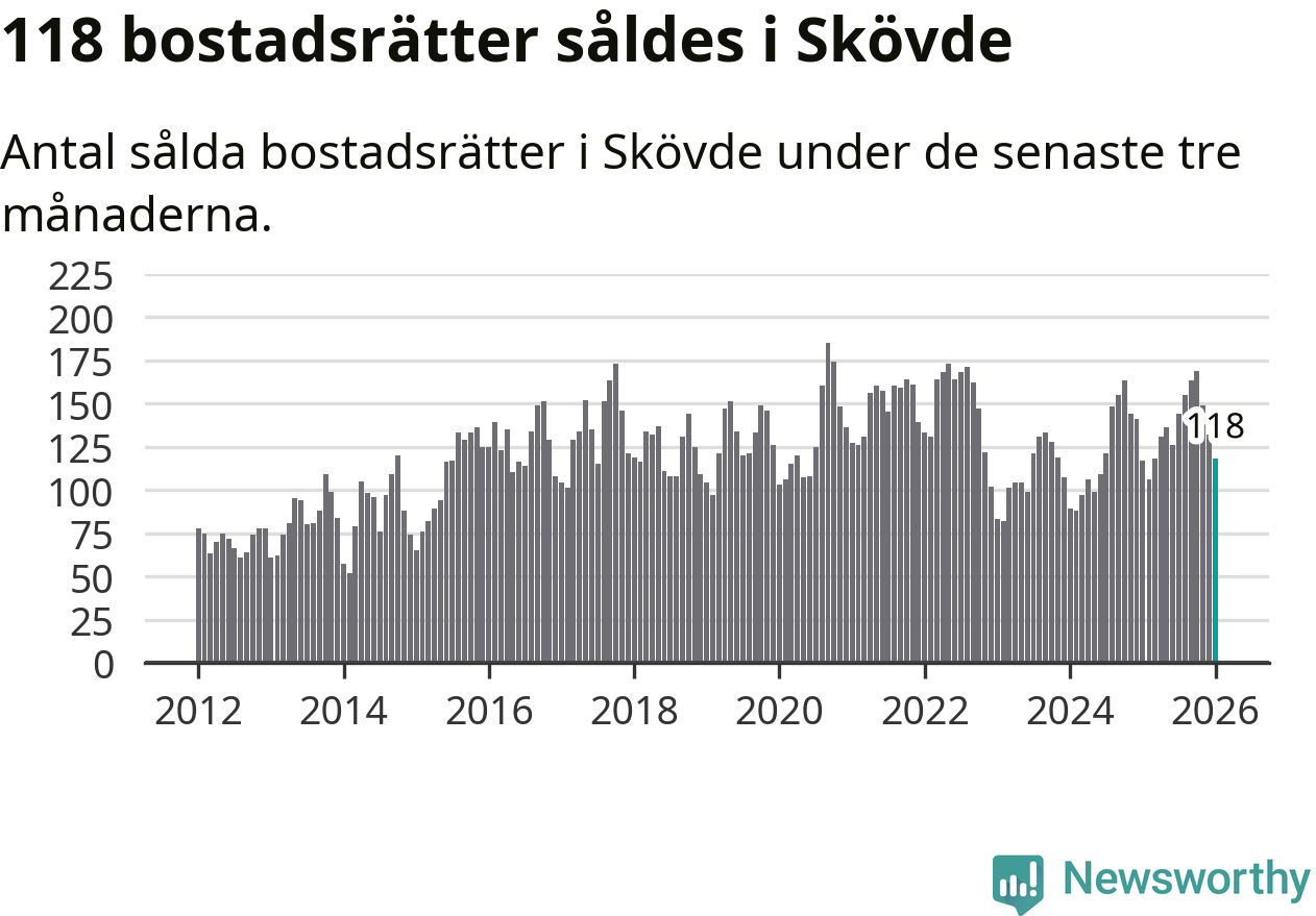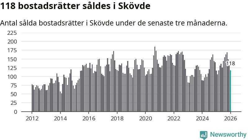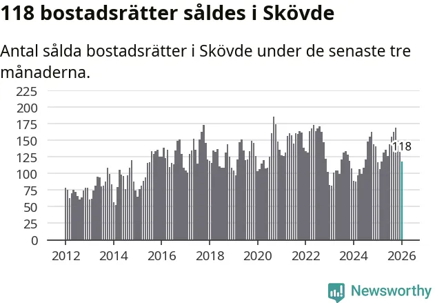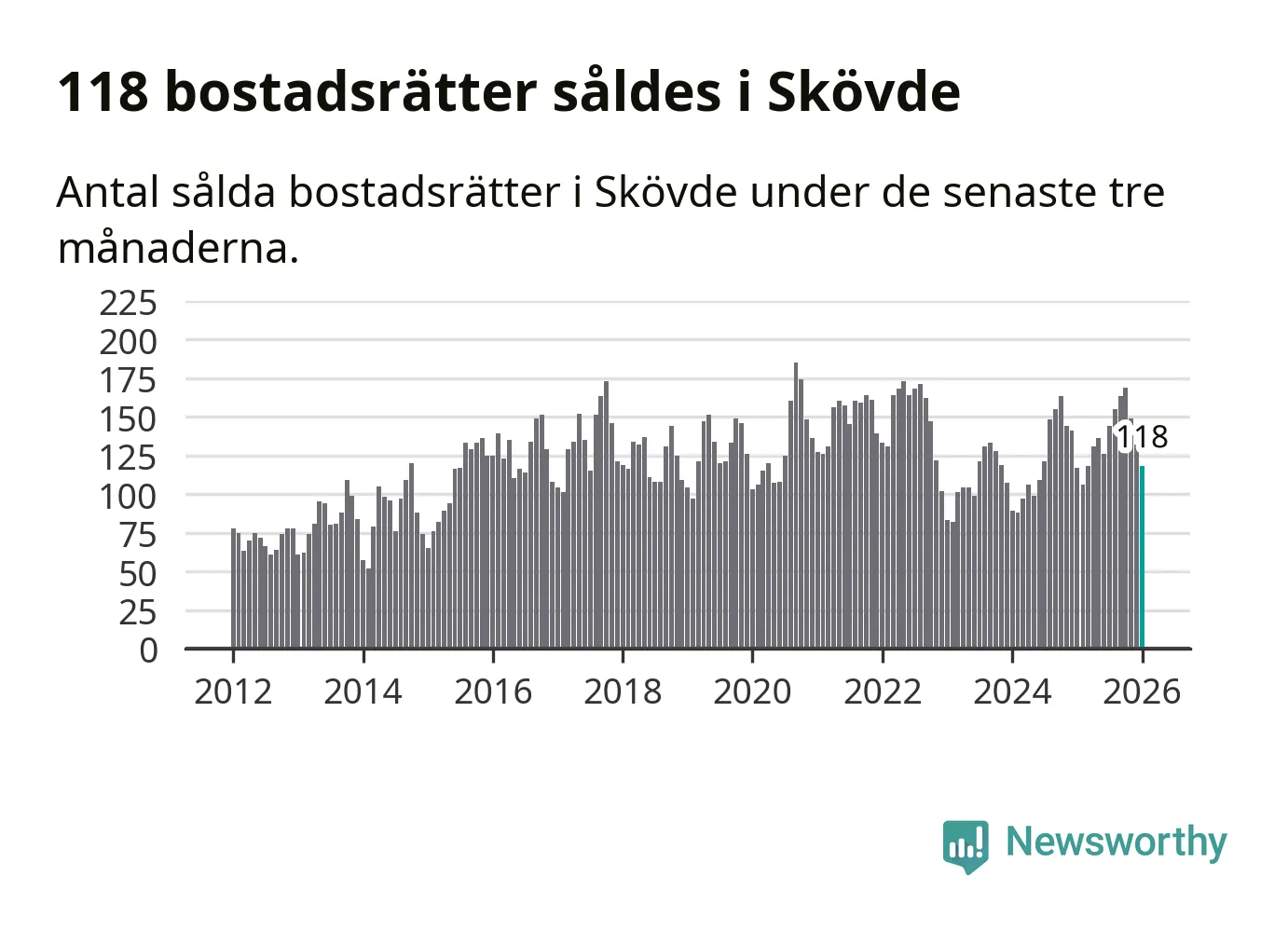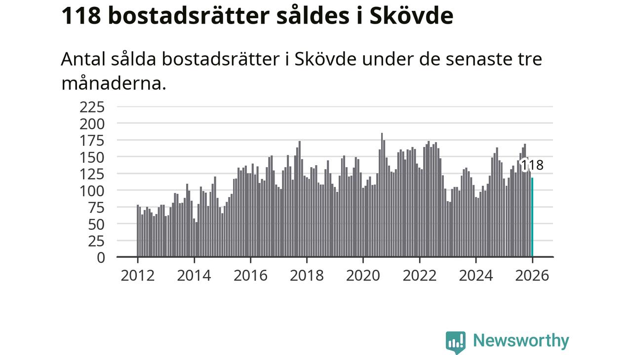Sammanlagt såldes 118 bostadsrätter i Skövde kommun mellan november och januari till ett genomsnittligt pris på 1,5 miljoner kronor. I fjol gjordes 117 affärer vid den här tiden på året.