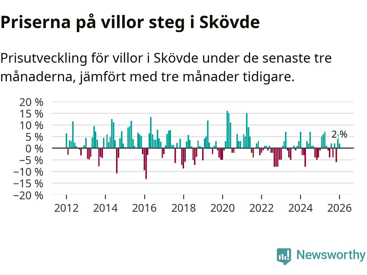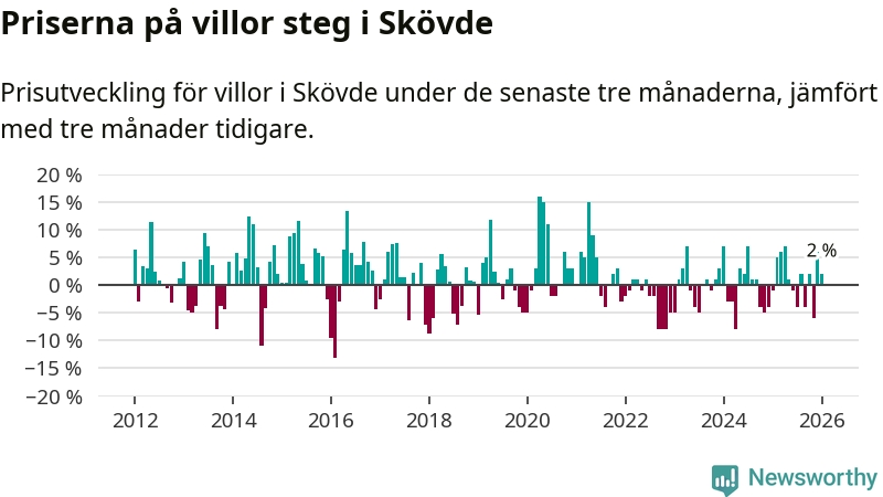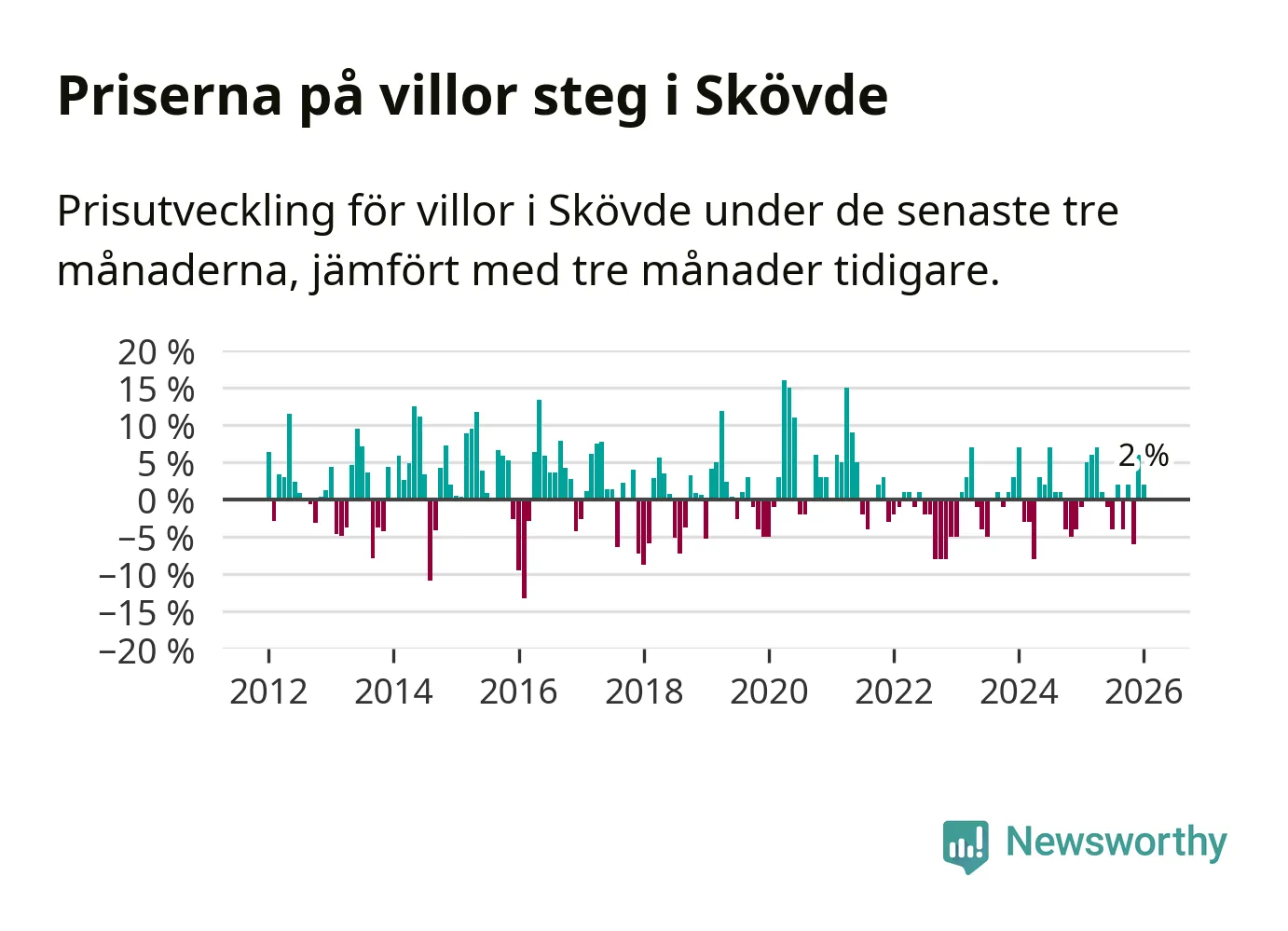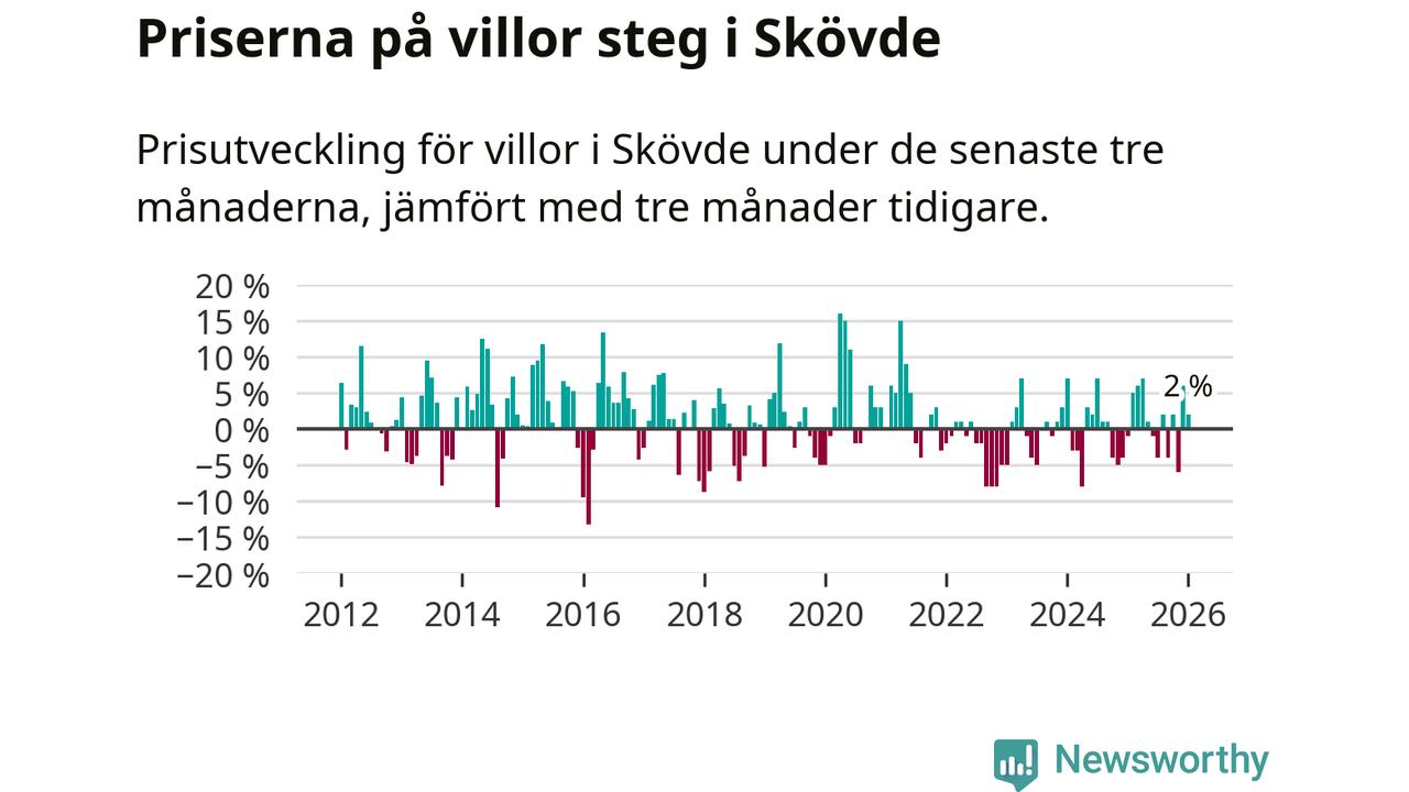 Villapriserna har gått upp i Skövde kommun. Medelpriset på försäljningarna under de senaste tre månaderna visar på en uppgång med 2 procent.