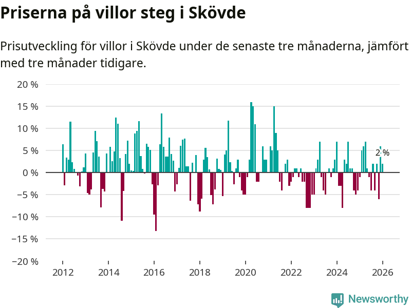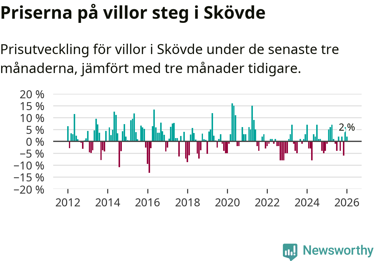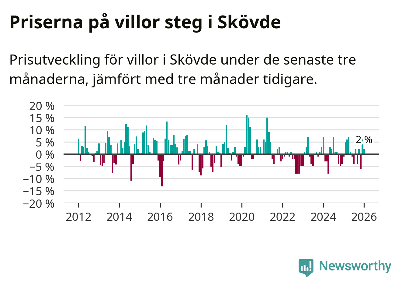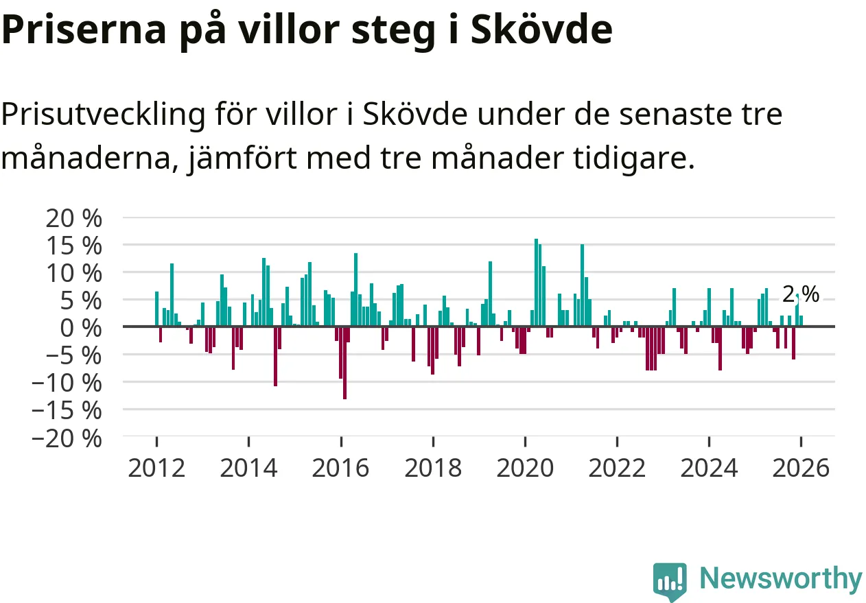 Villapriserna har gått upp i Skövde kommun. Medelpriset på försäljningarna under de senaste tre månaderna visar på en uppgång med 2 procent.