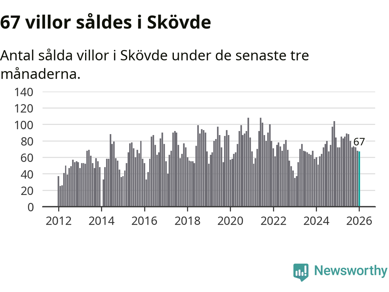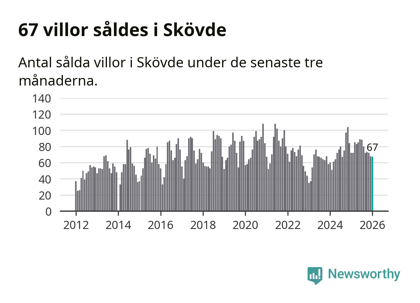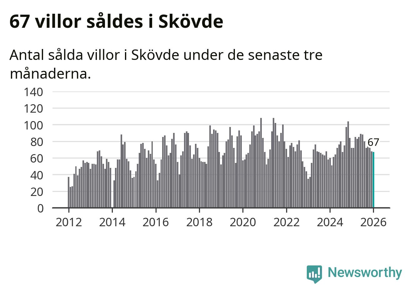 Sammanlagt såldes 67 villor i Skövde kommun mellan november och januari till ett genomsnittligt pris på 3,4 miljoner kronor. I fjol gjordes 72 affärer vid den här tiden på året.