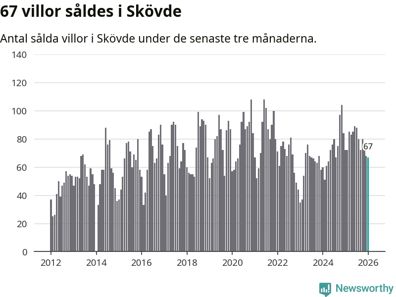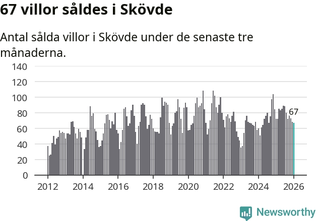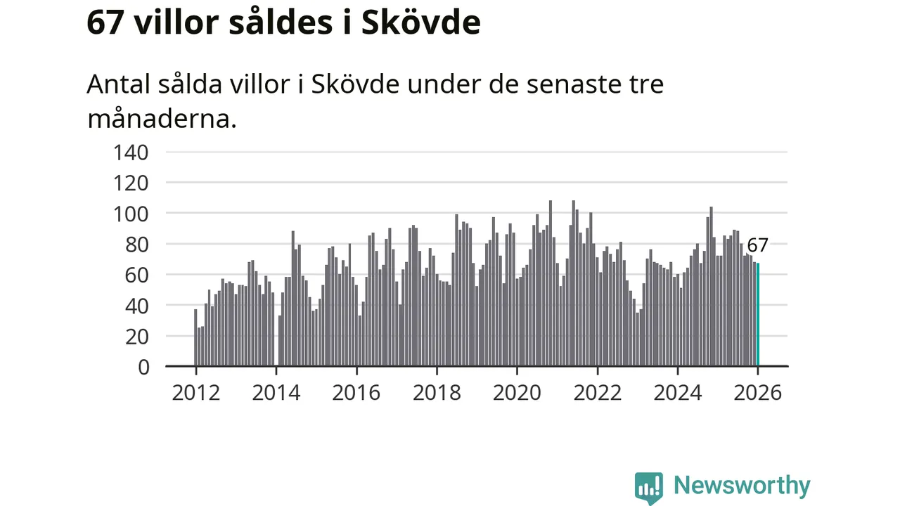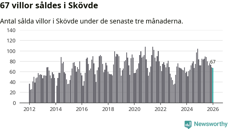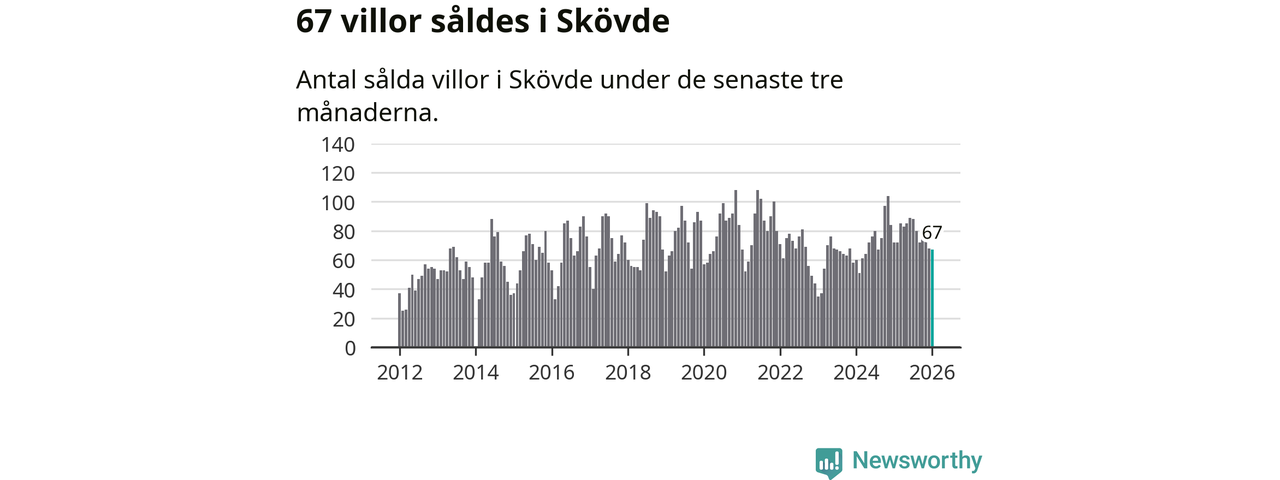 Sammanlagt såldes 67 villor i Skövde kommun mellan november och januari till ett genomsnittligt pris på 3,4 miljoner kronor. I fjol gjordes 72 affärer vid den här tiden på året.