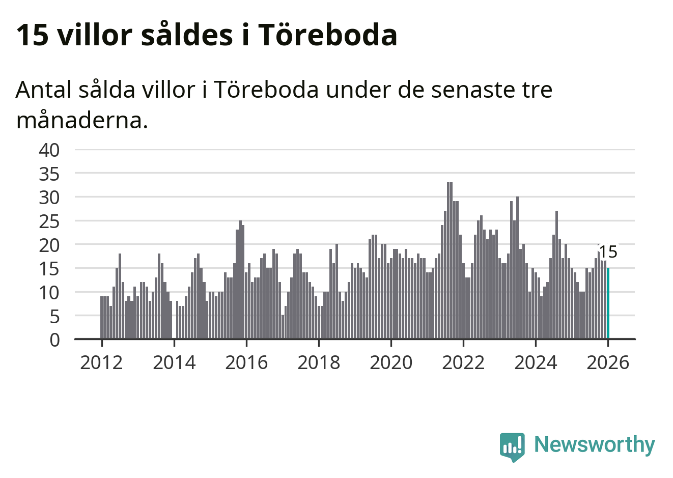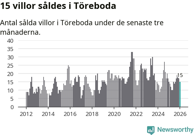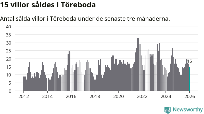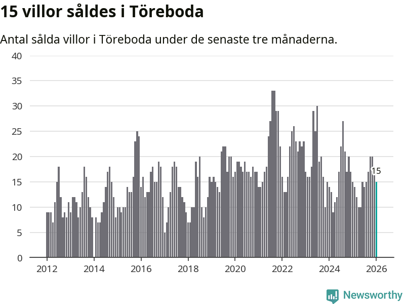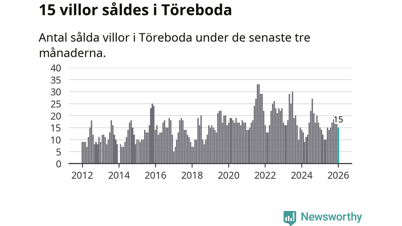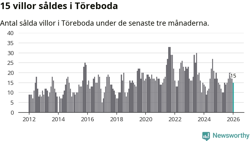 Mellan november och januari gjordes sammanlagt 15 affärer med villor i Töreboda kommun. Det är lika många affärer som vid motsvarande tid i fjol.