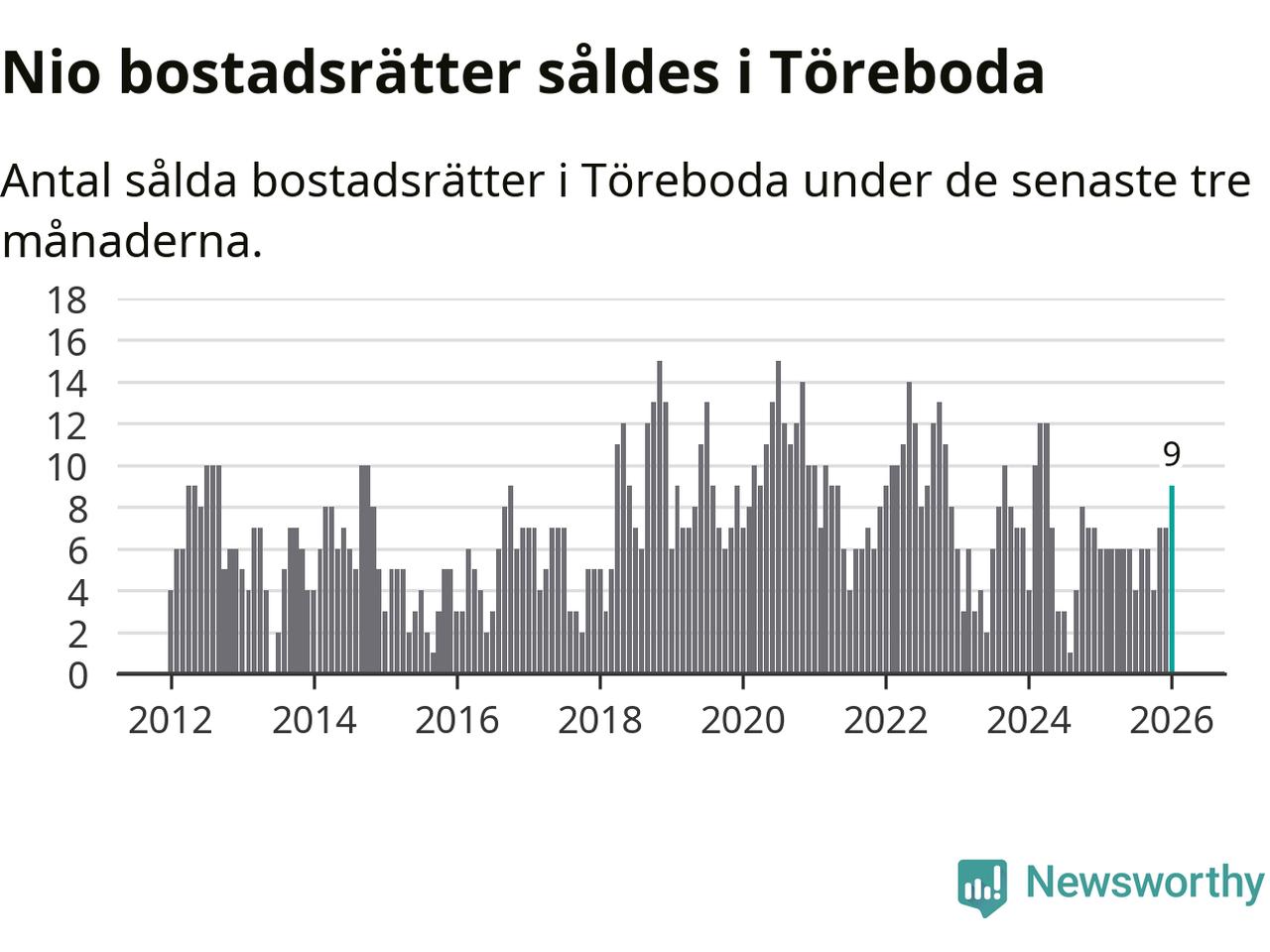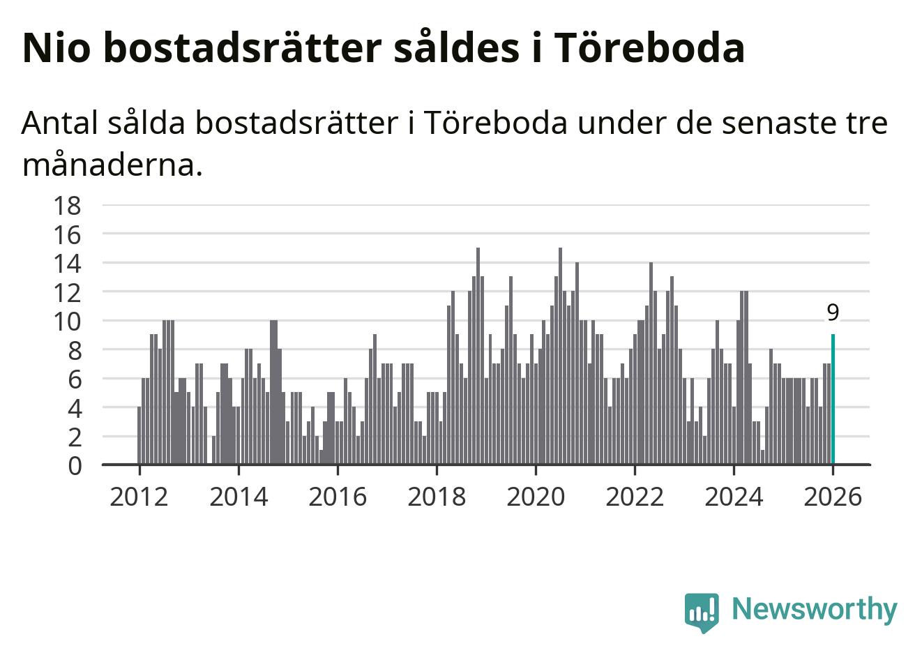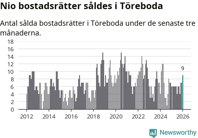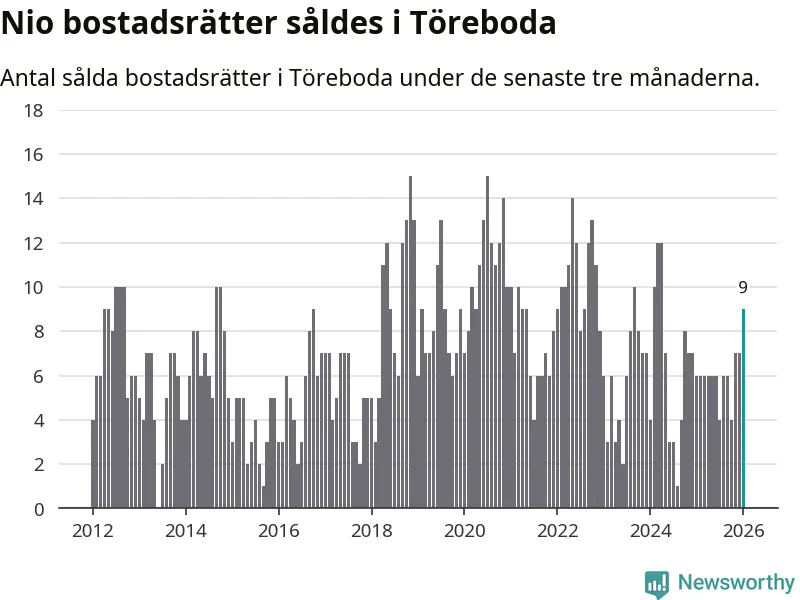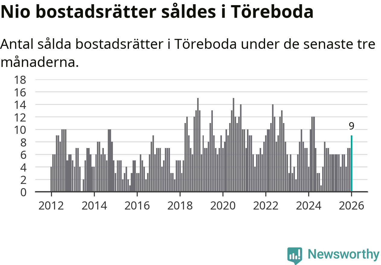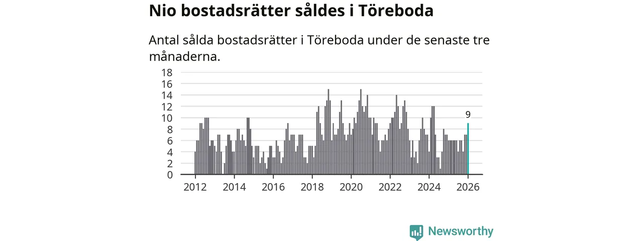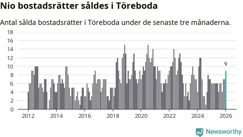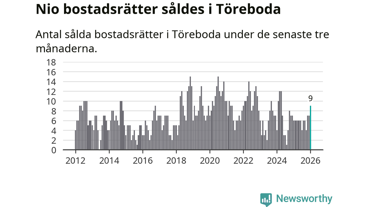 Mellan november och januari gjordes sammanlagt nio affärer med bostadsrätter i Töreboda kommun. Det kan jämföras med sex vid motsvarande tid i fjol.