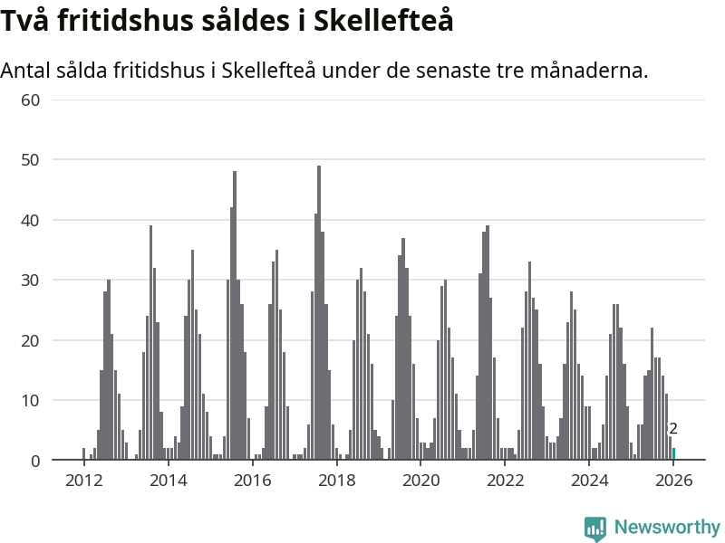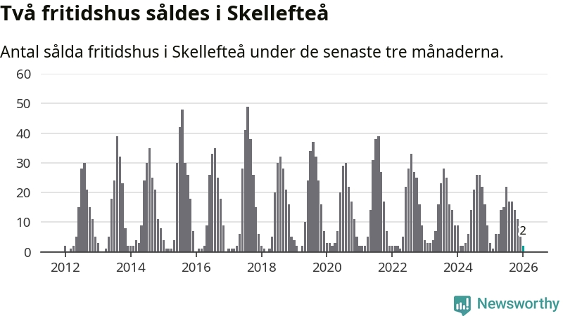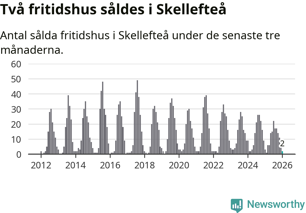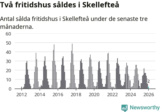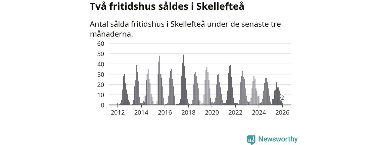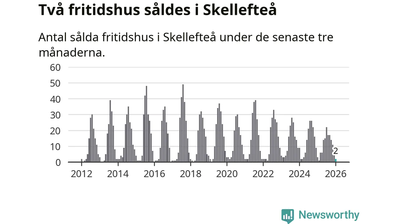 Sammanlagt såldes två fritidshus i Skellefteå kommun mellan november 2025 och januari till ett genomsnittligt pris på 0,8 miljoner kronor. I fjol gjordes tre affärer vid den här tiden på året.