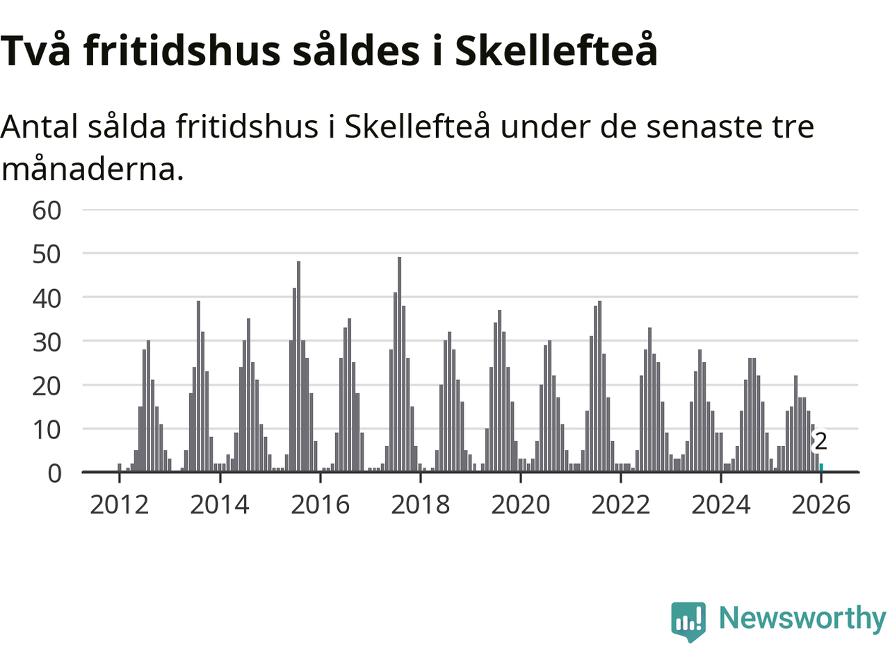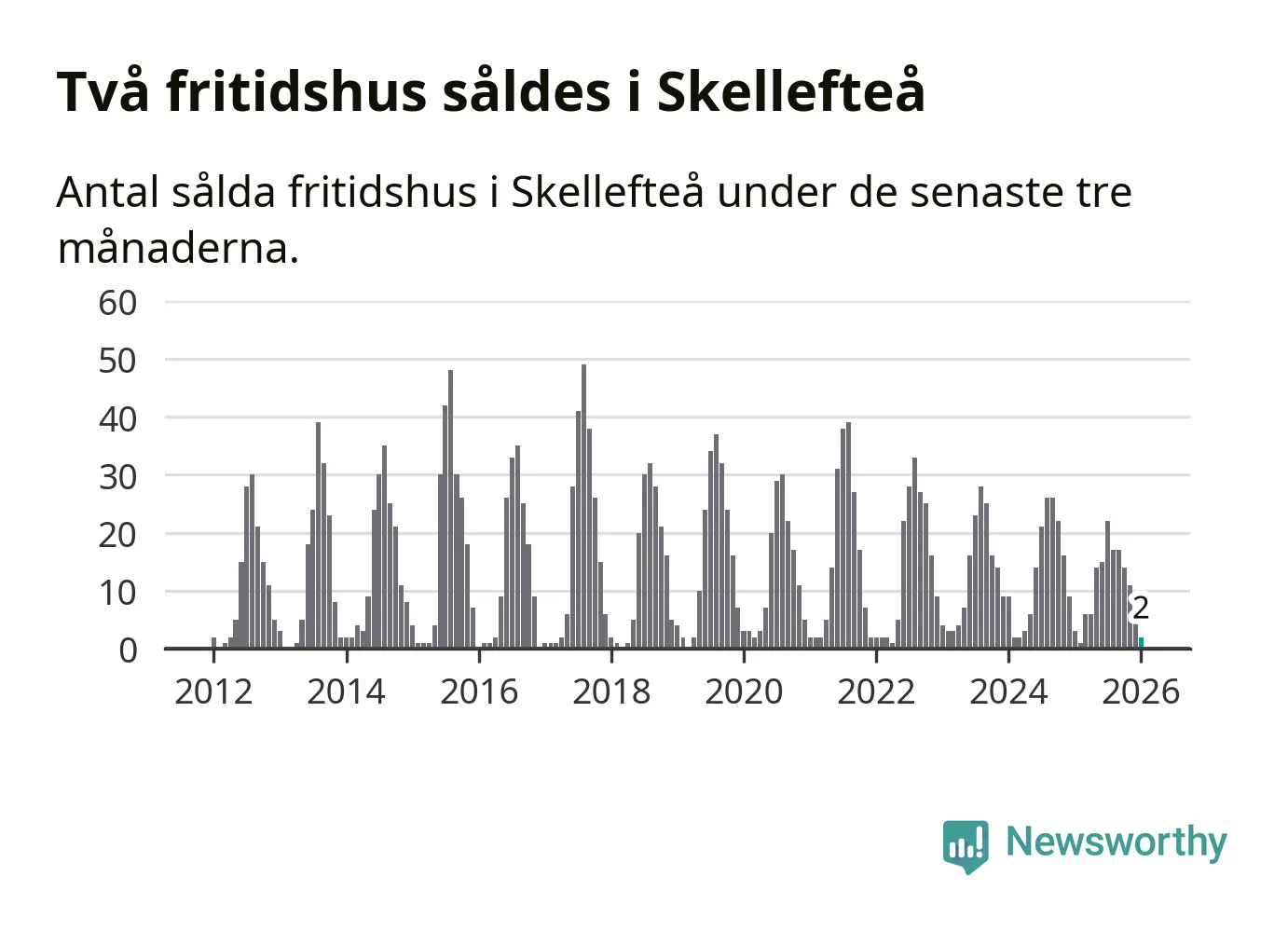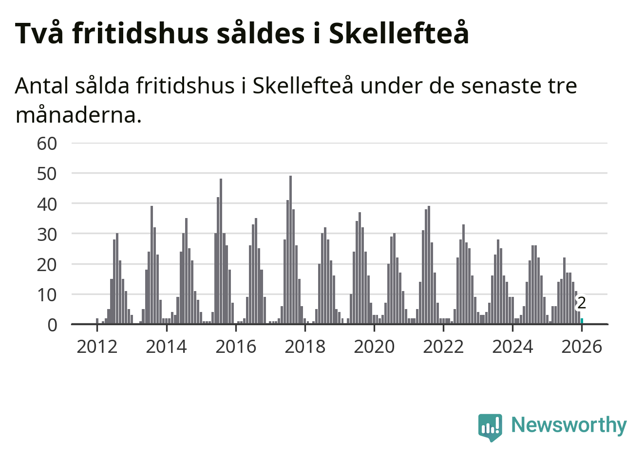 Sammanlagt såldes två fritidshus i Skellefteå kommun mellan november 2025 och januari till ett genomsnittligt pris på 0,8 miljoner kronor. I fjol gjordes tre affärer vid den här tiden på året.