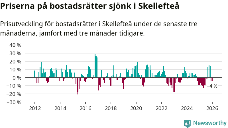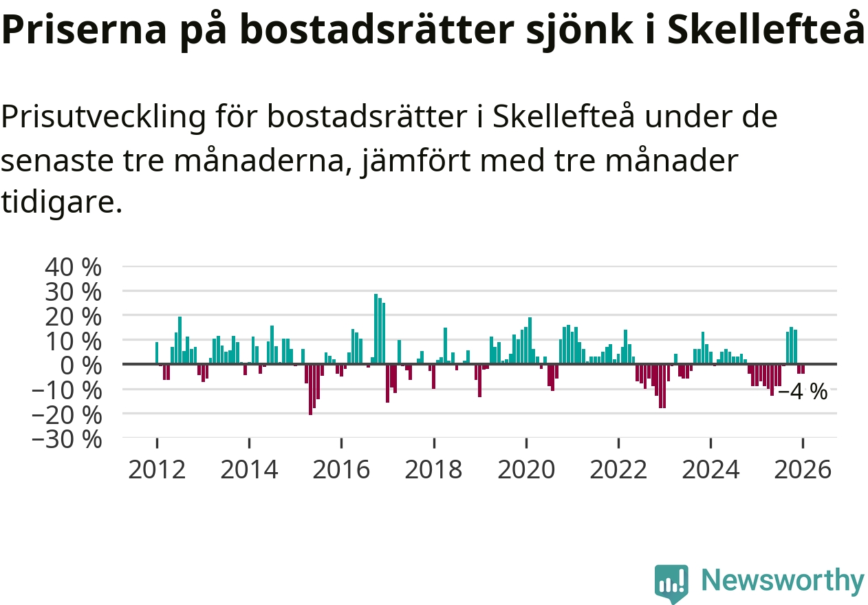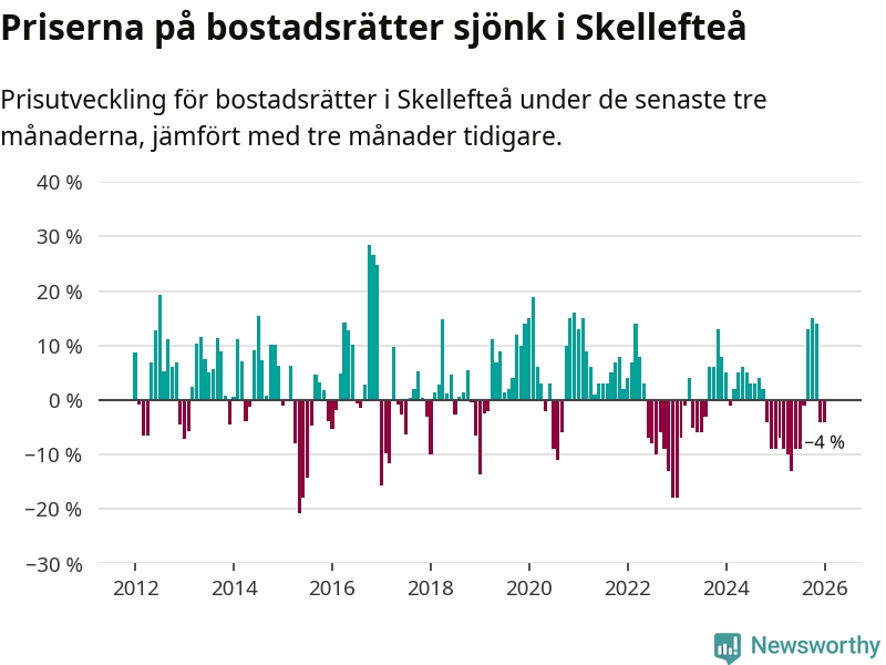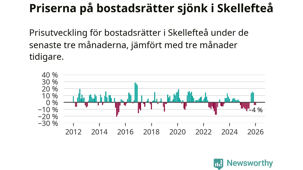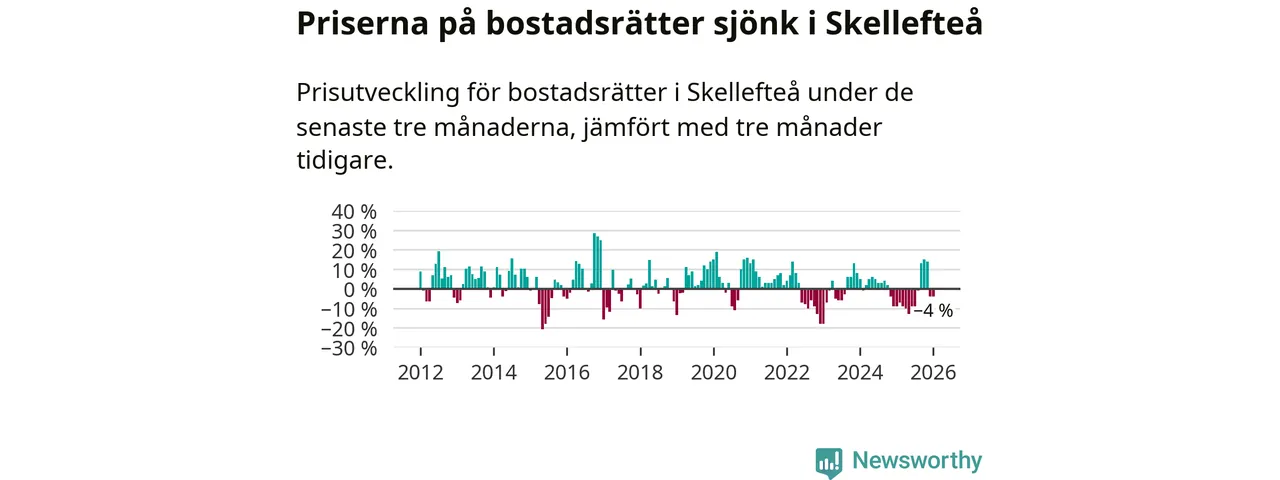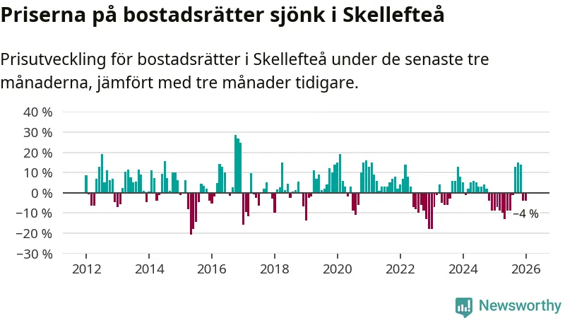 Statistiken visar även på en kännbar prisnedgång i Skellefteå kommun. Medelpriset på försäljningarna av bostadsrätter i kommunen var 4 procent lägre än för tre månader sedan. I hela Västerbotten däremot ökar priserna på bostadsrätter. I hela länet noterades en prisuppgång på 2 procent.