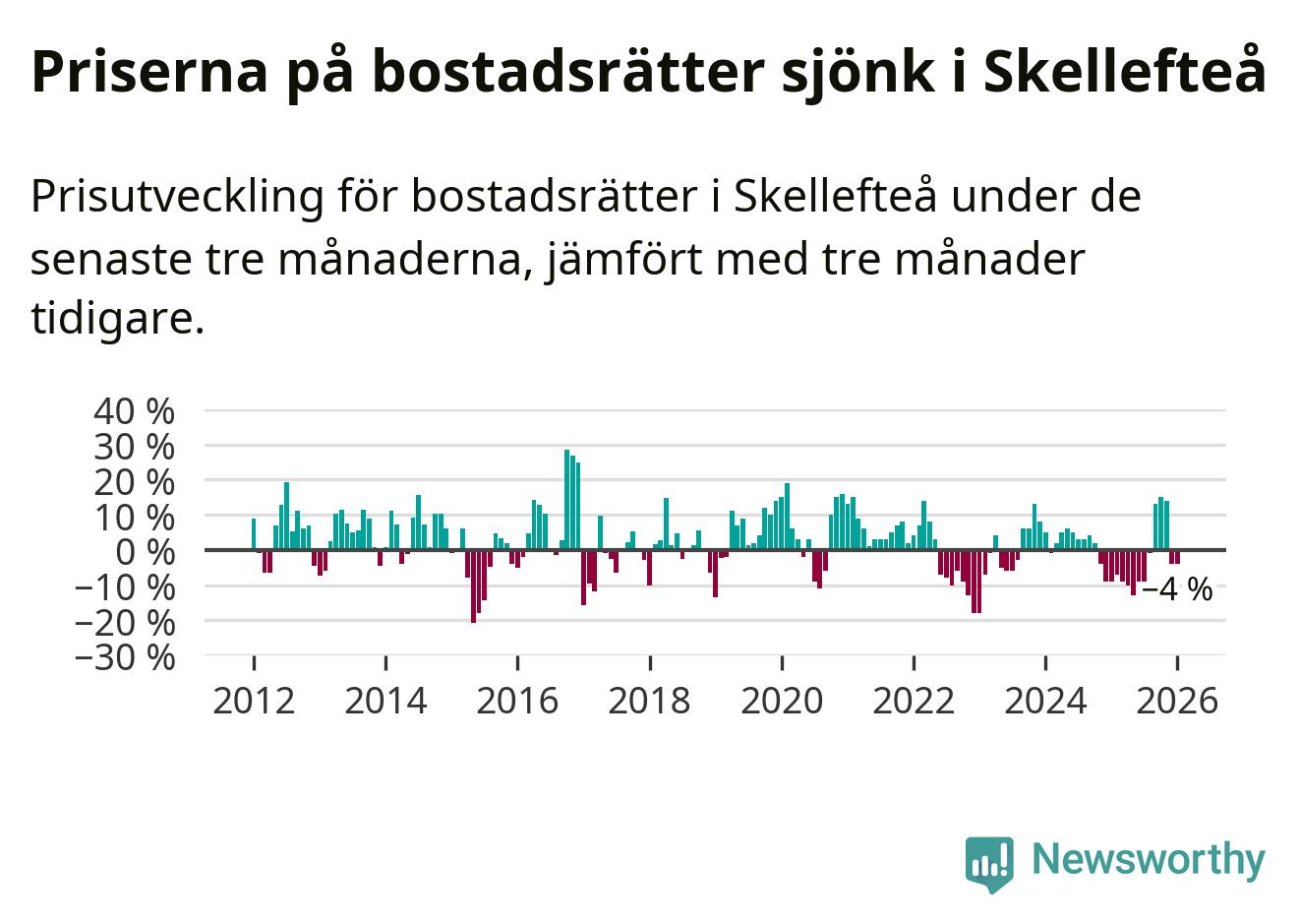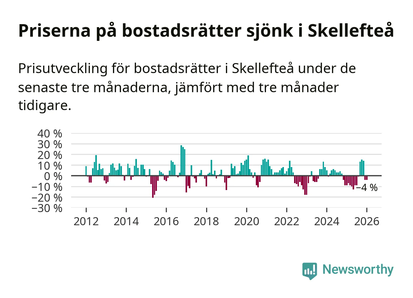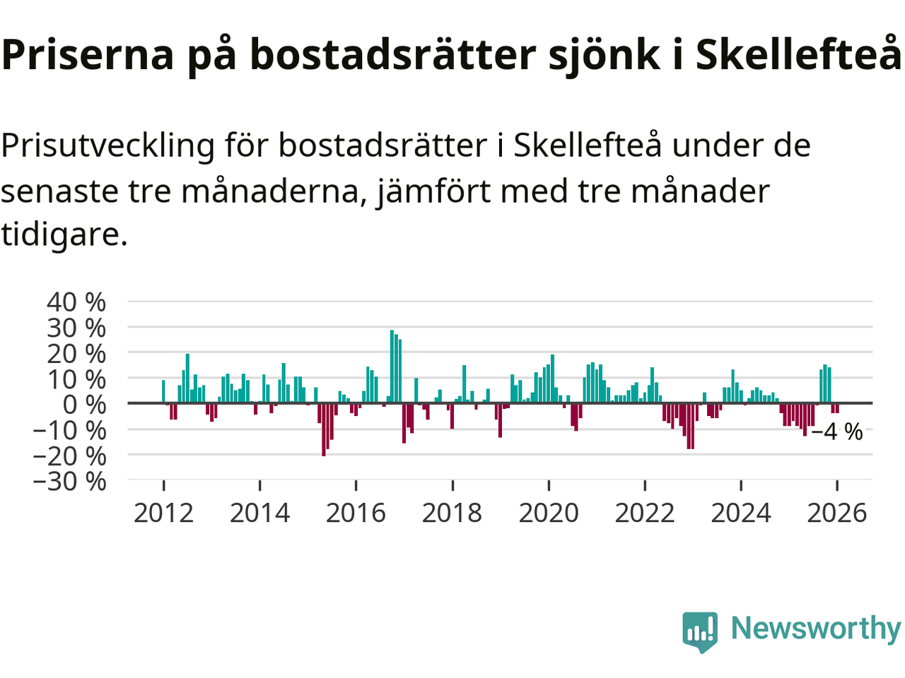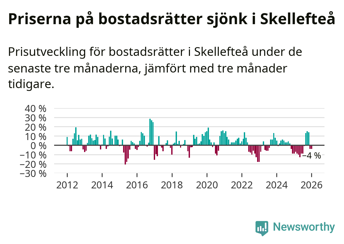 Statistiken visar även på en kännbar prisnedgång i Skellefteå kommun. Medelpriset på försäljningarna av bostadsrätter i kommunen var 4 procent lägre än för tre månader sedan. I hela Västerbotten däremot ökar priserna på bostadsrätter. I hela länet noterades en prisuppgång på 2 procent.