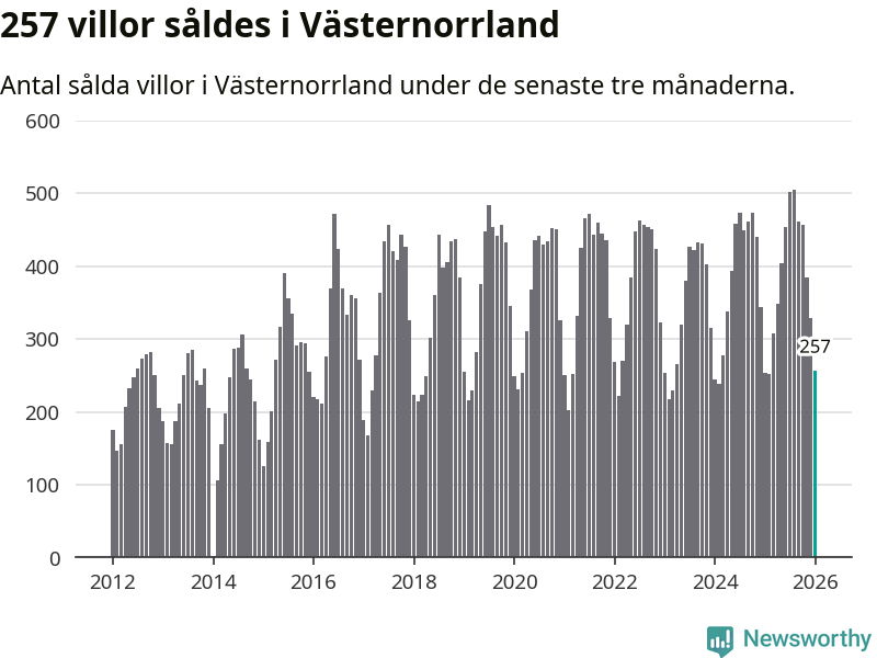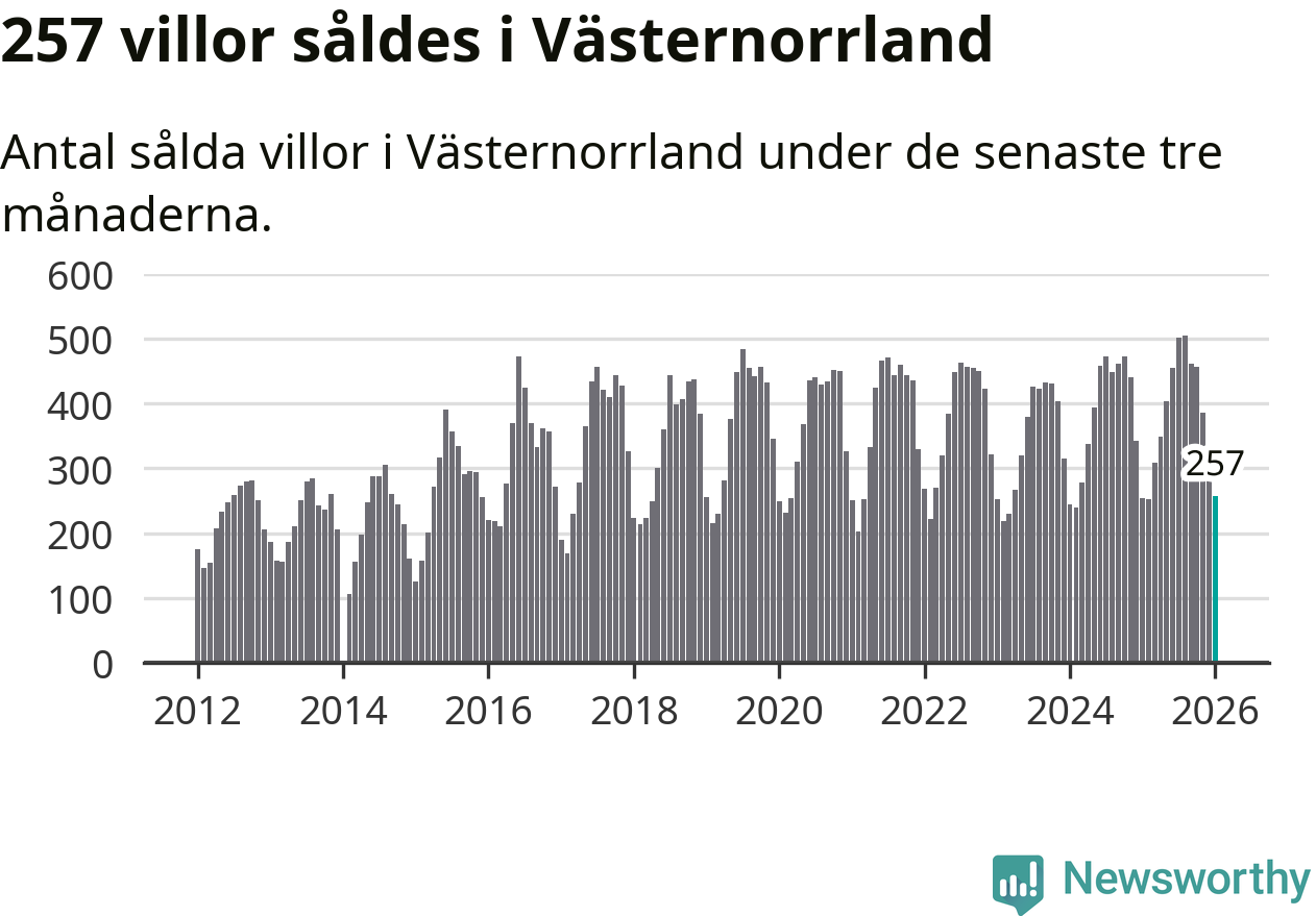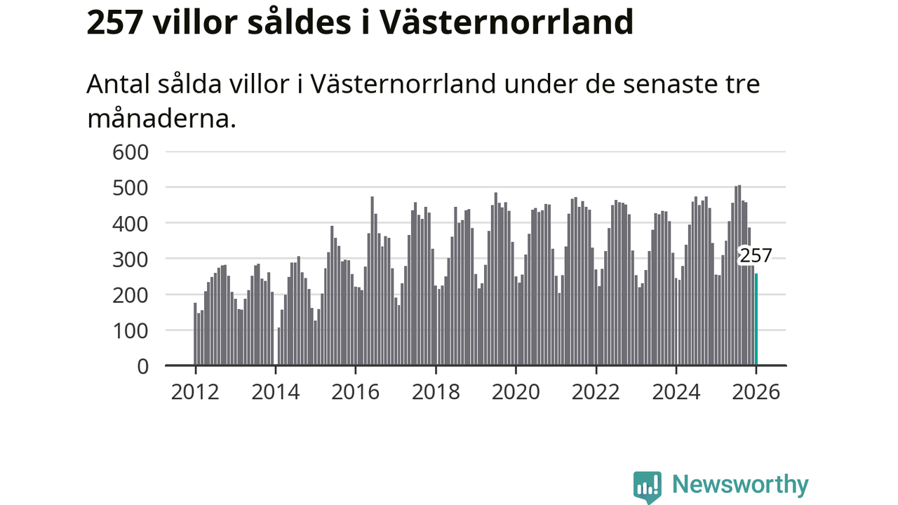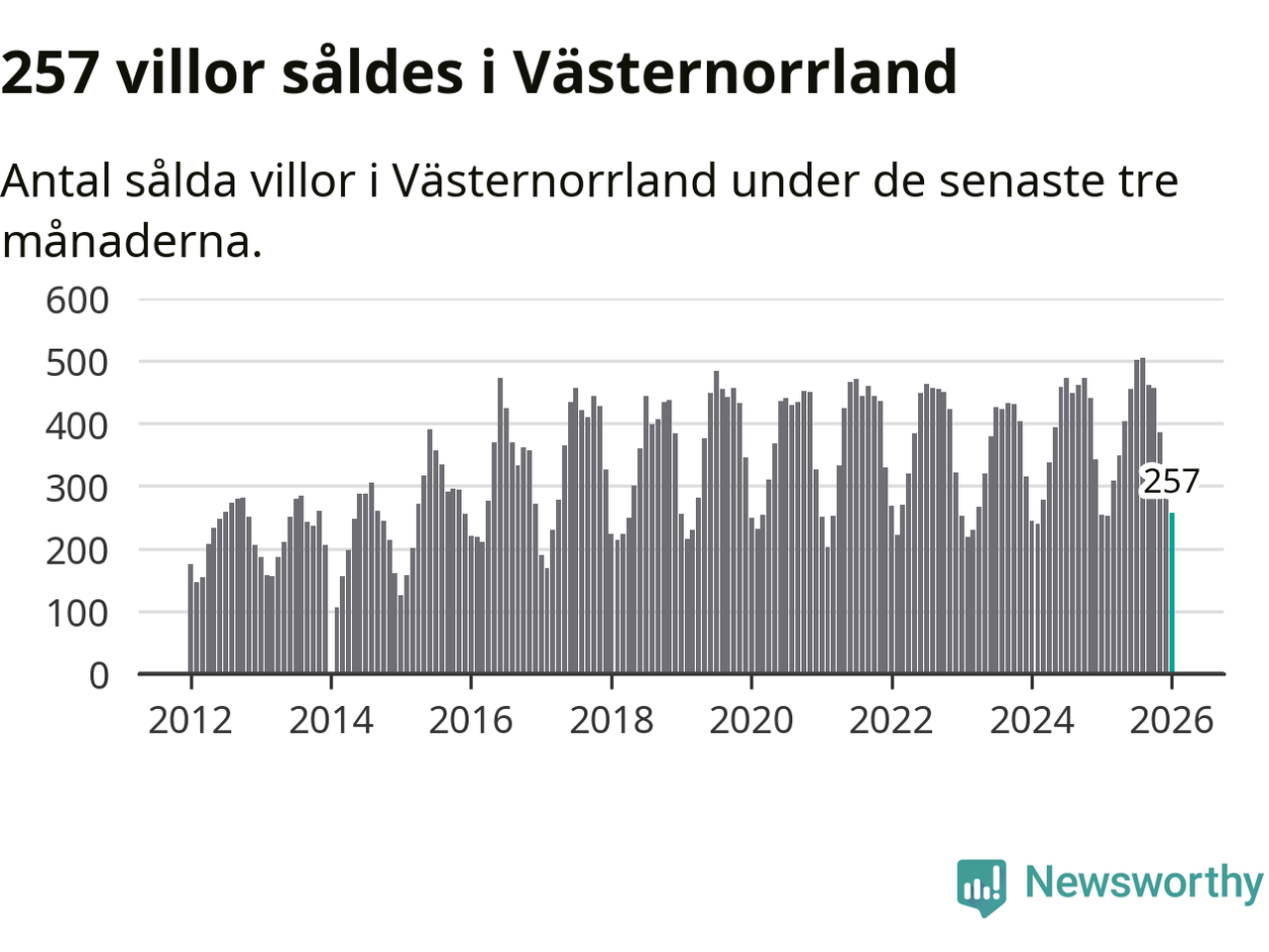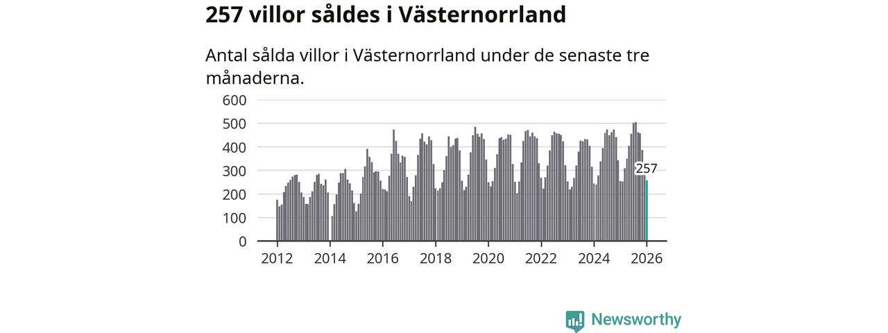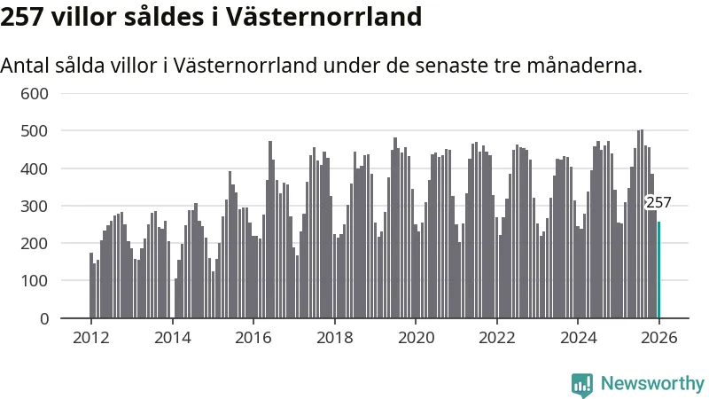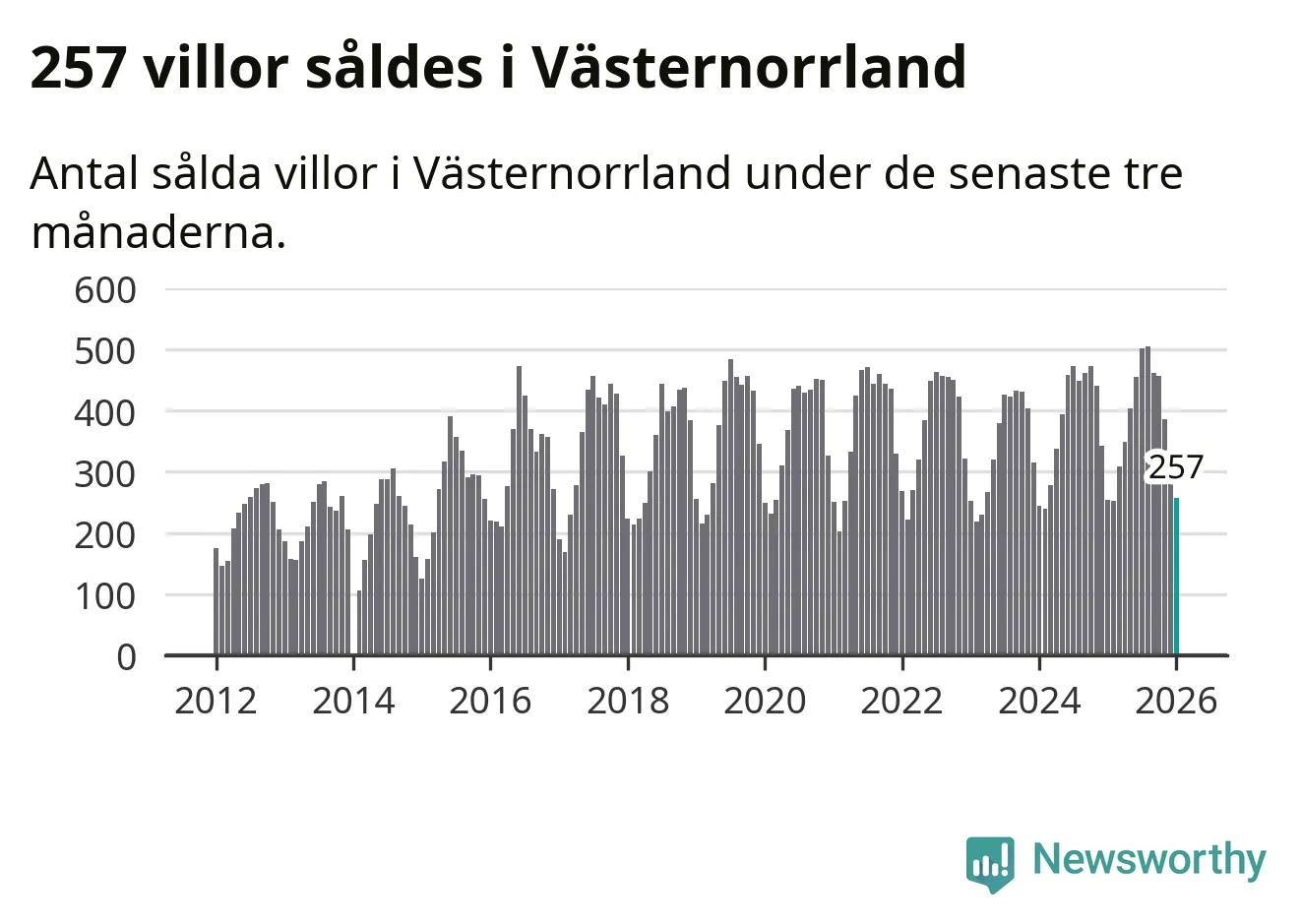 Sammanlagt såldes 257 villor i Västernorrlands län mellan november och januari till ett genomsnittligt pris på 1,7 miljoner kronor. I fjol gjordes 254 affärer vid den här tiden på året.