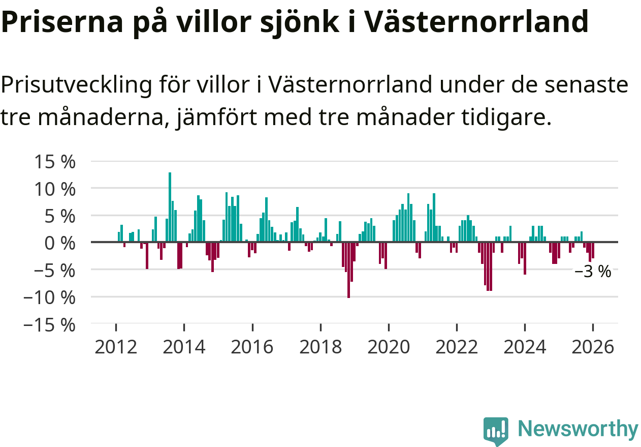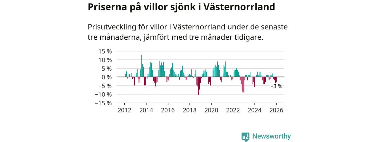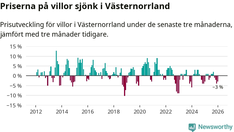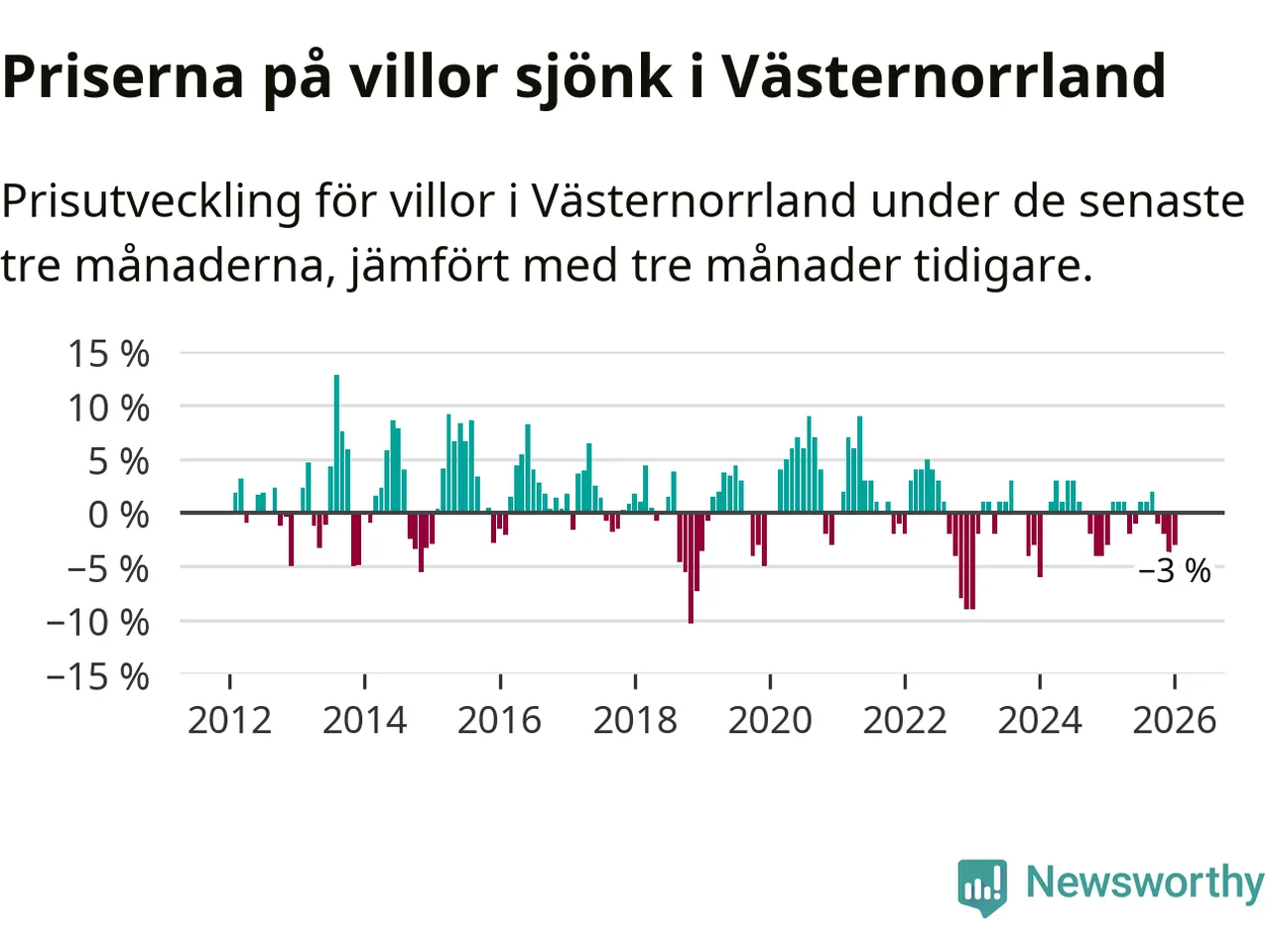 Villapriserna har gått ner i Västernorrlands län. Medelpriset på försäljningarna under de senaste tre månaderna visar på en nedgång med 3 procent.
