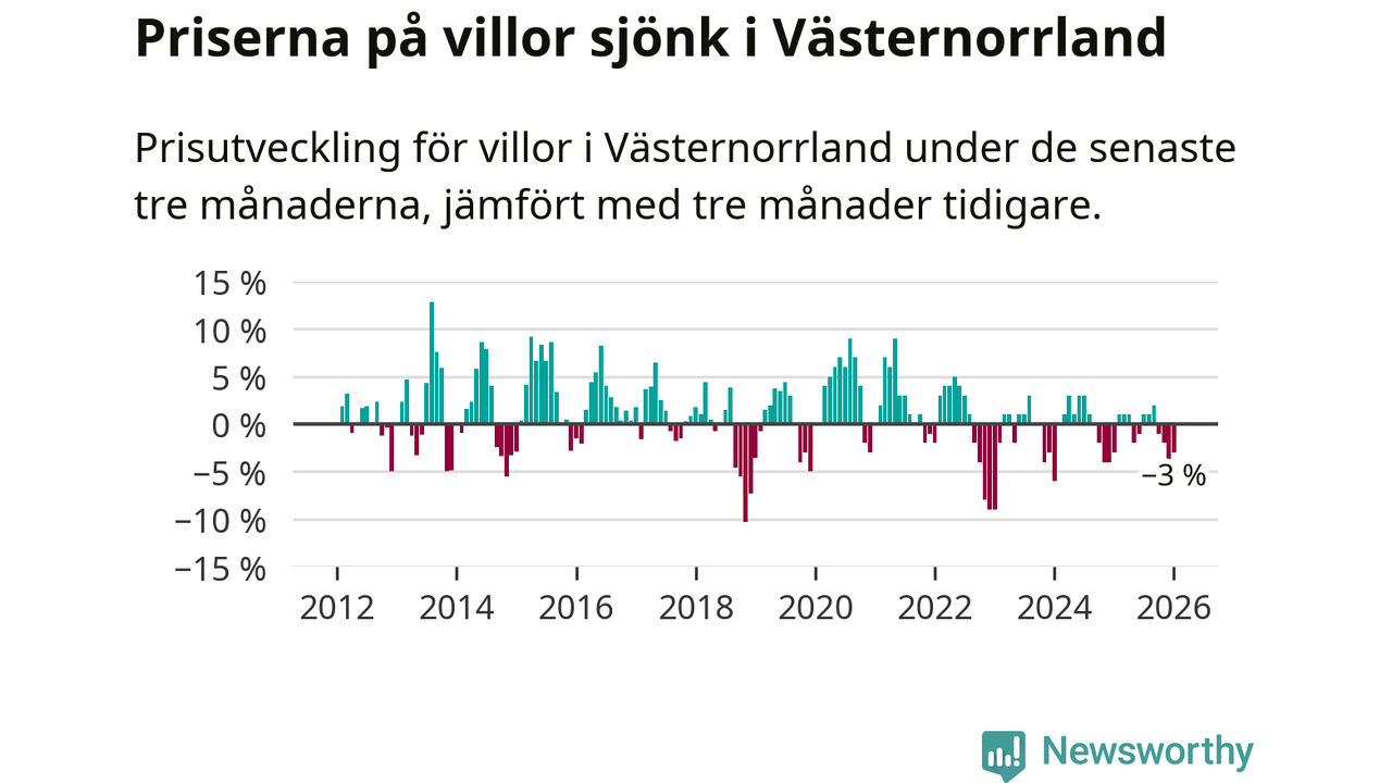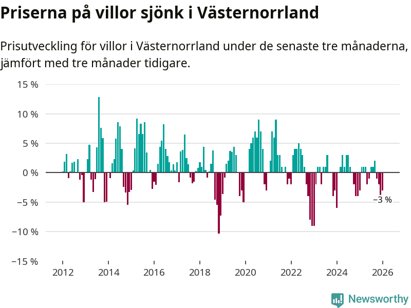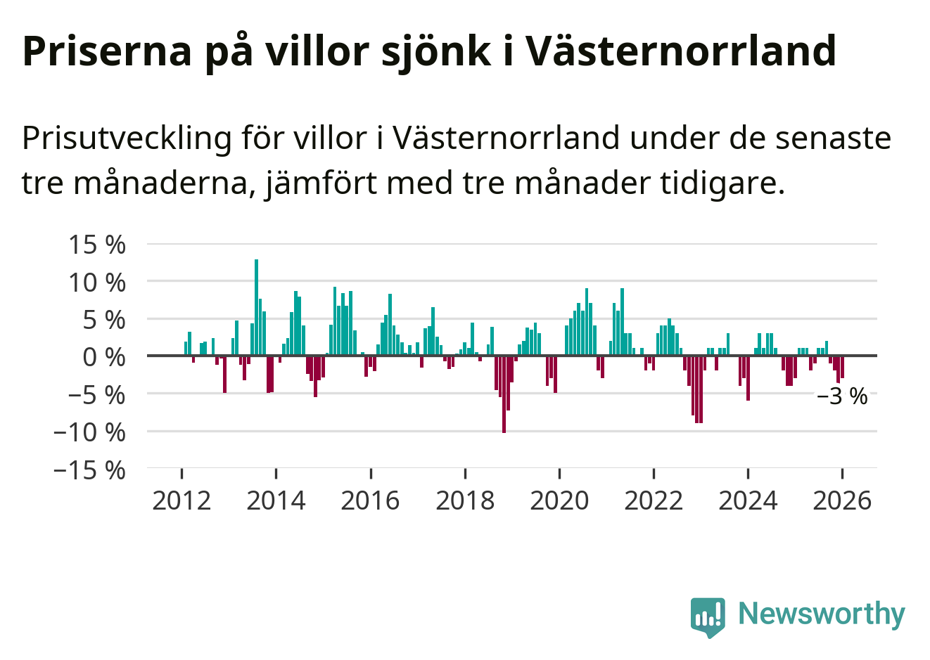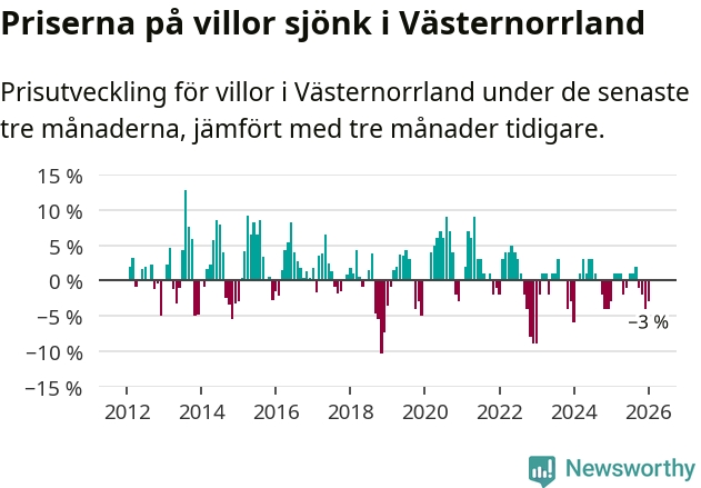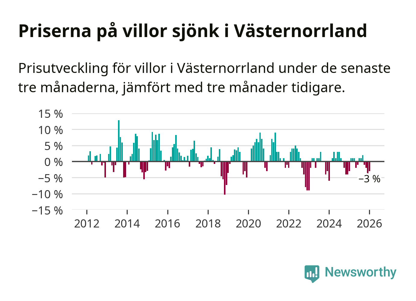 Villapriserna har gått ner i Västernorrlands län. Medelpriset på försäljningarna under de senaste tre månaderna visar på en nedgång med 3 procent.