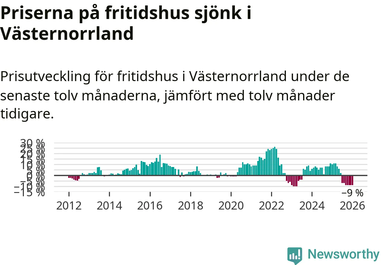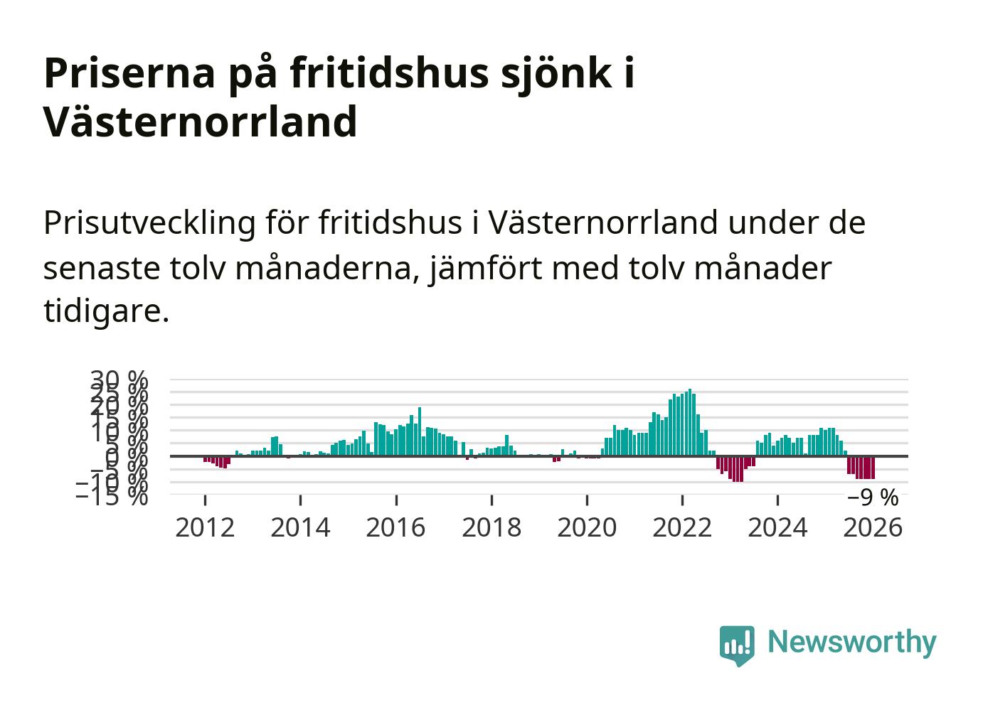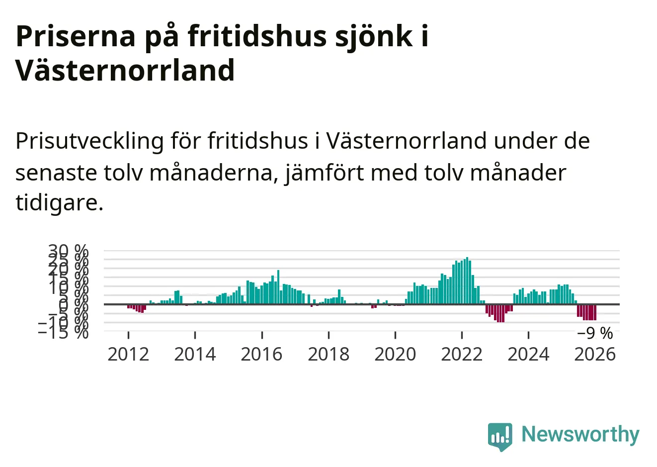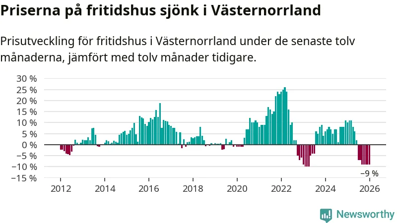 Priserna på fritidshus har gått ner i Västernorrlands län. Medelpriset på försäljningarna under de senaste tolv månaderna visar på en nedgång med 9 procent.