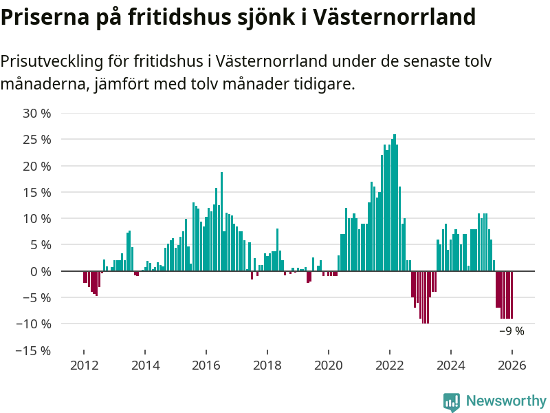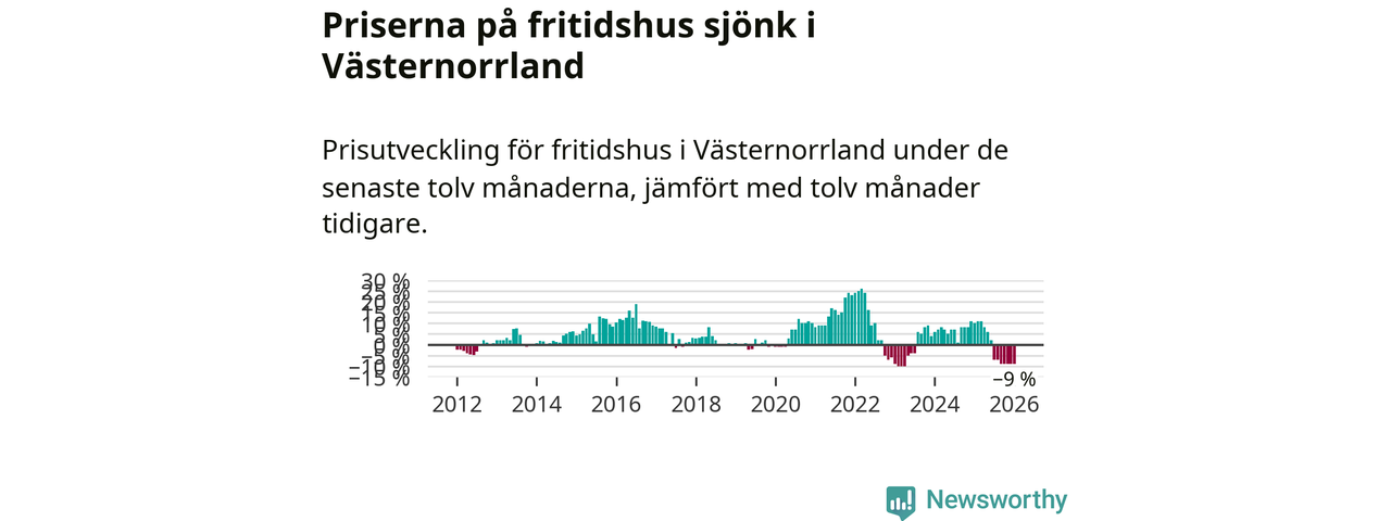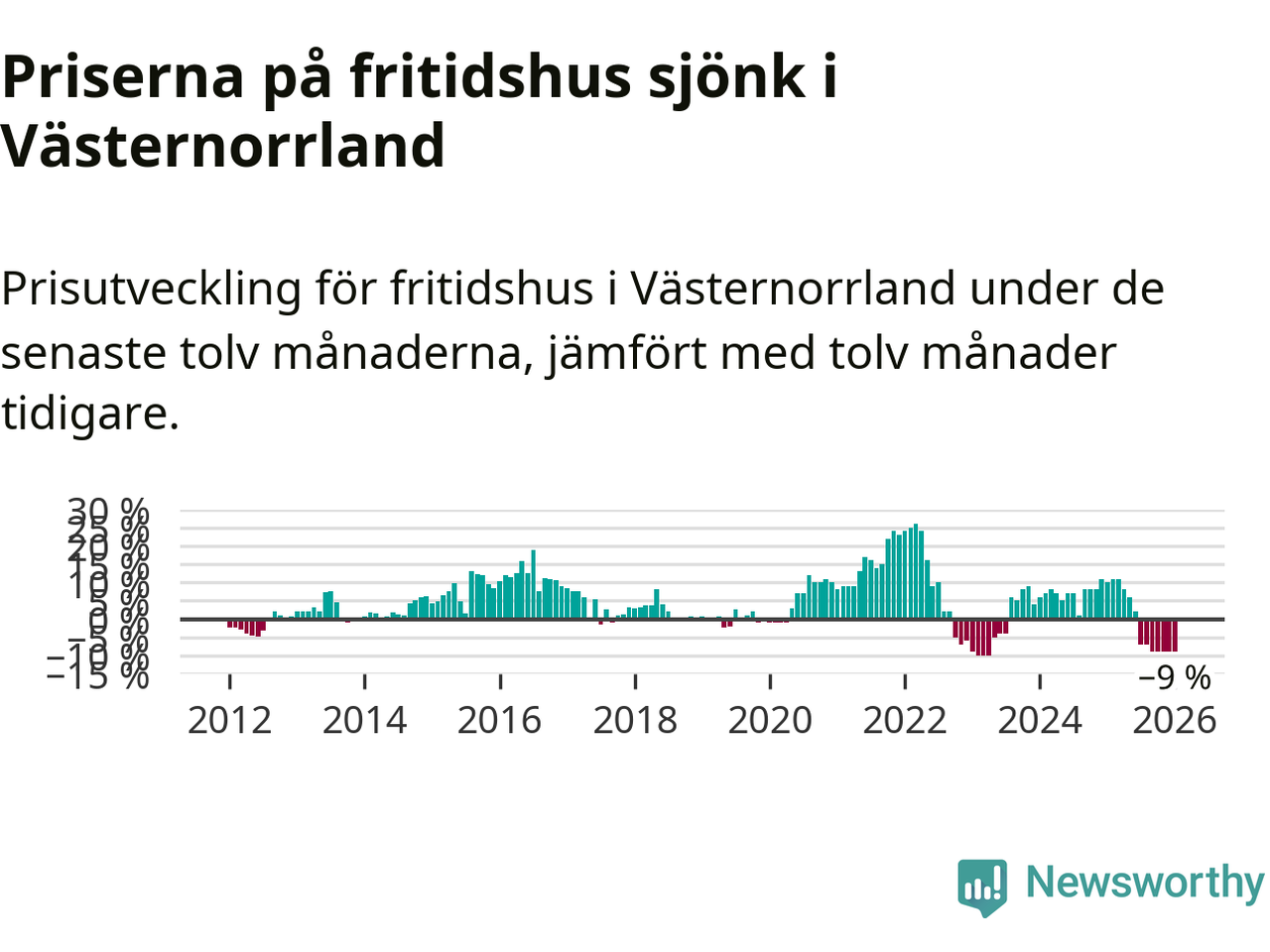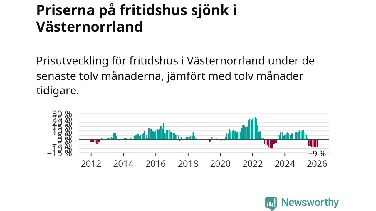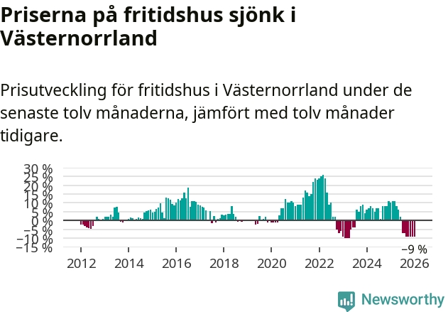 Priserna på fritidshus har gått ner i Västernorrlands län. Medelpriset på försäljningarna under de senaste tolv månaderna visar på en nedgång med 9 procent.