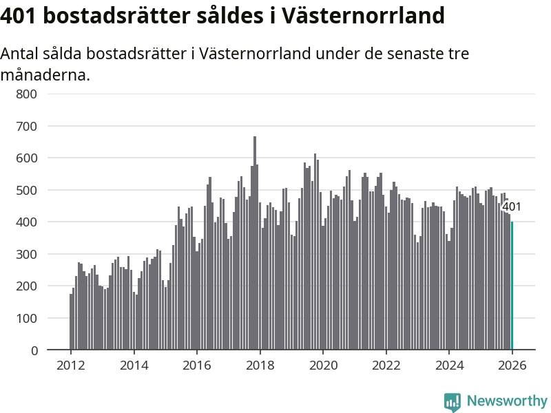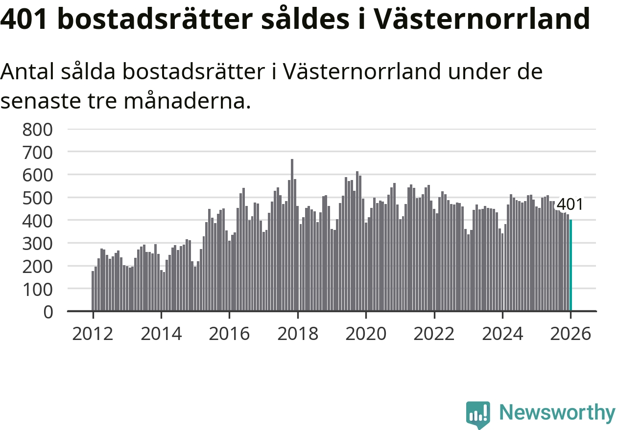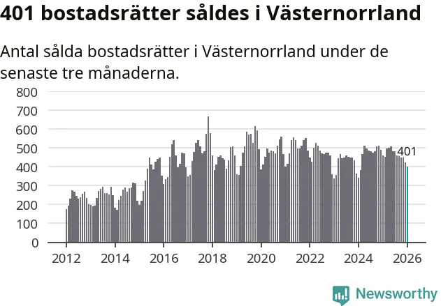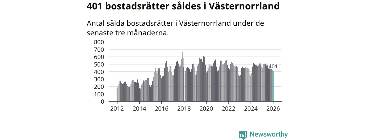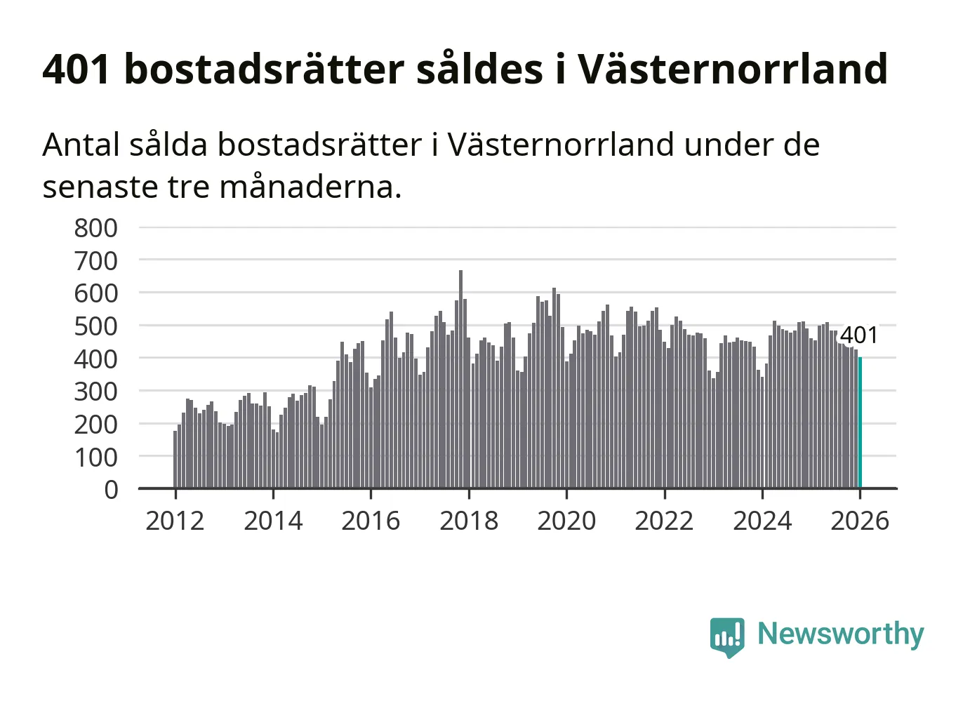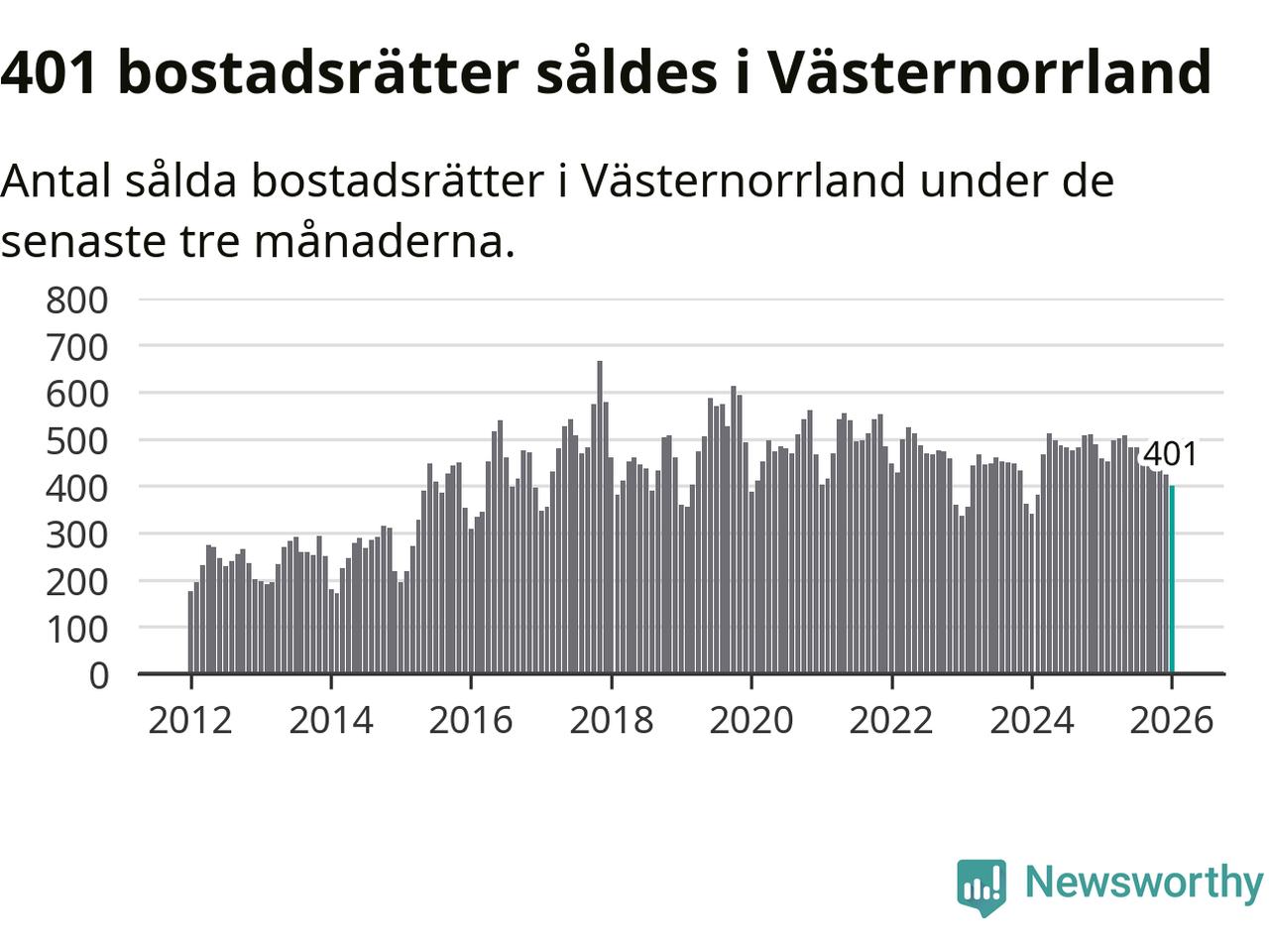 Sammanlagt såldes 401 bostadsrätter i Västernorrlands län mellan november och januari till ett genomsnittligt pris på 1,0 miljon kronor. I fjol gjordes 459 affärer vid den här tiden på året.