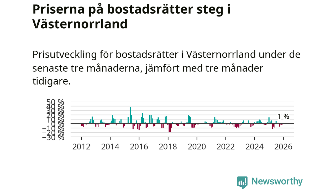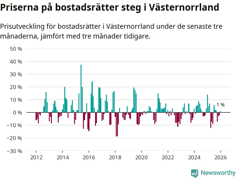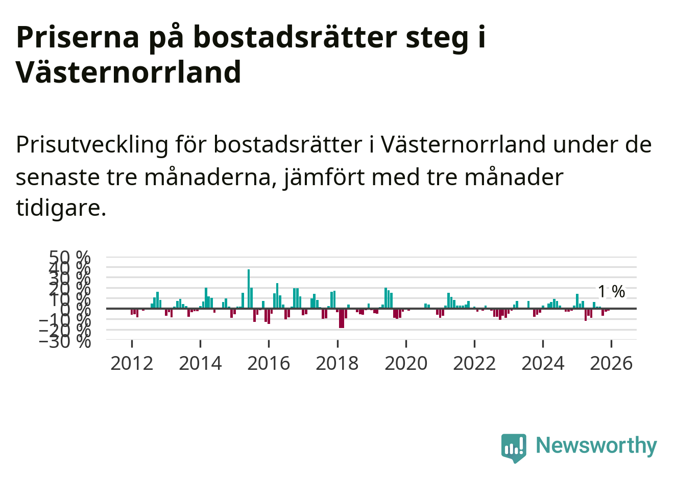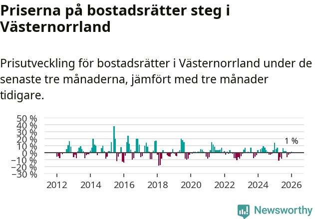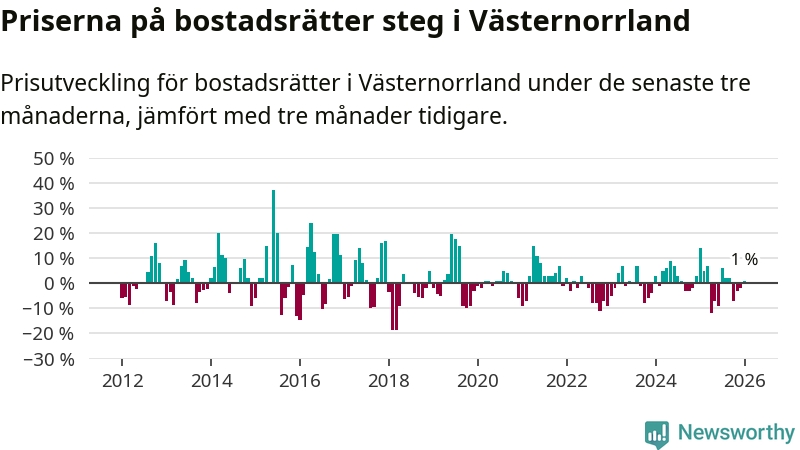 Priserna på bostadsrätter har gått upp i Västernorrlands län. Medelpriset på försäljningarna under de senaste tre månaderna visar på en uppgång med 1 procent.