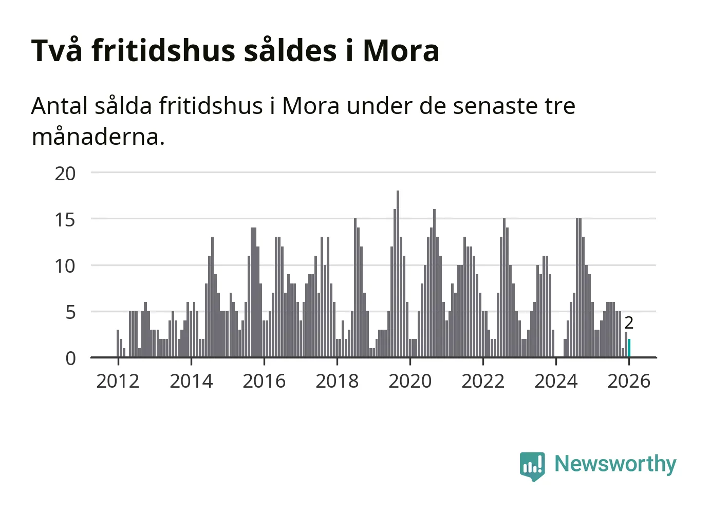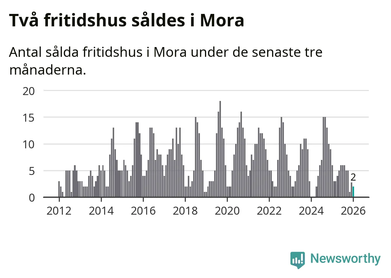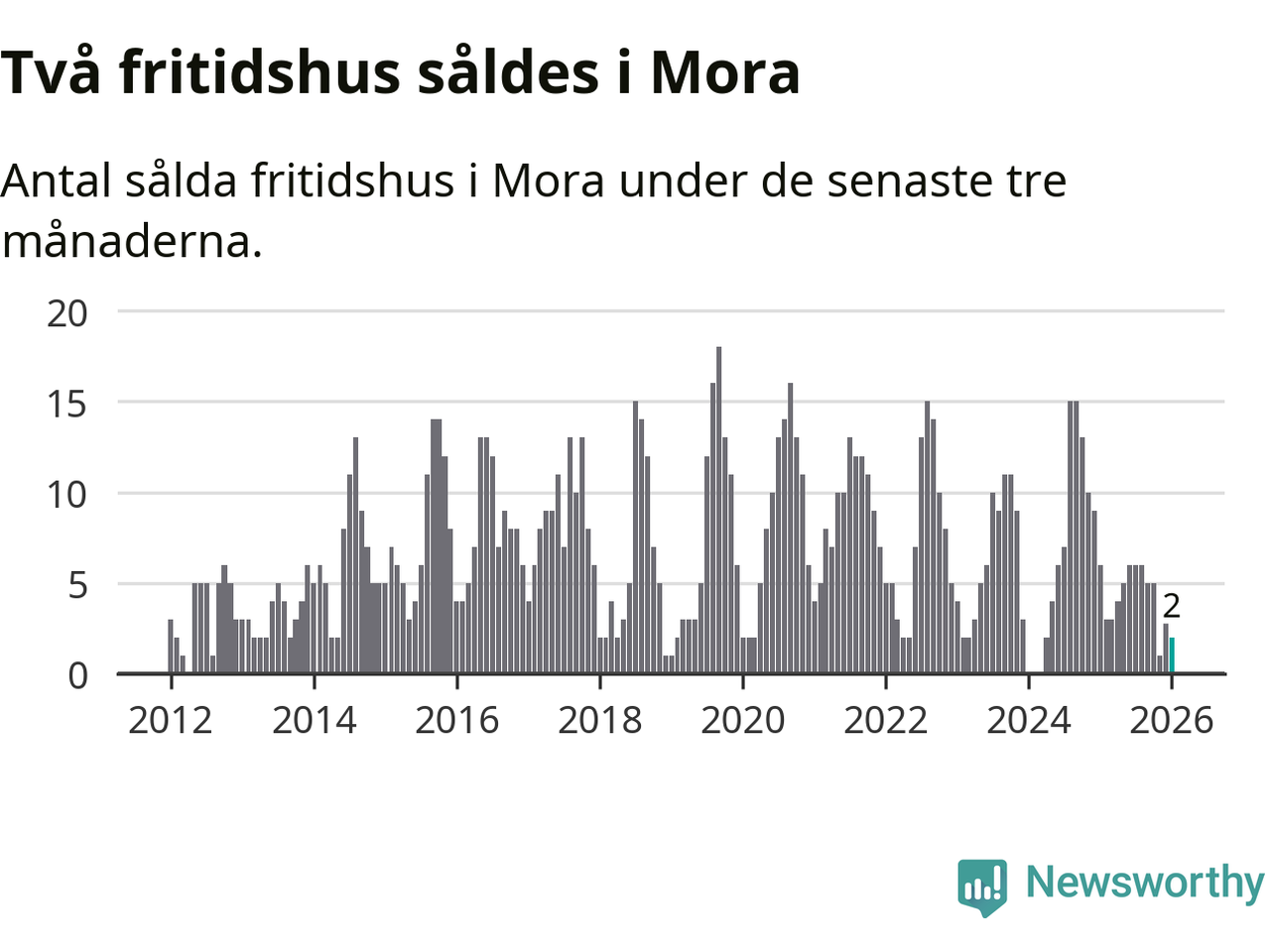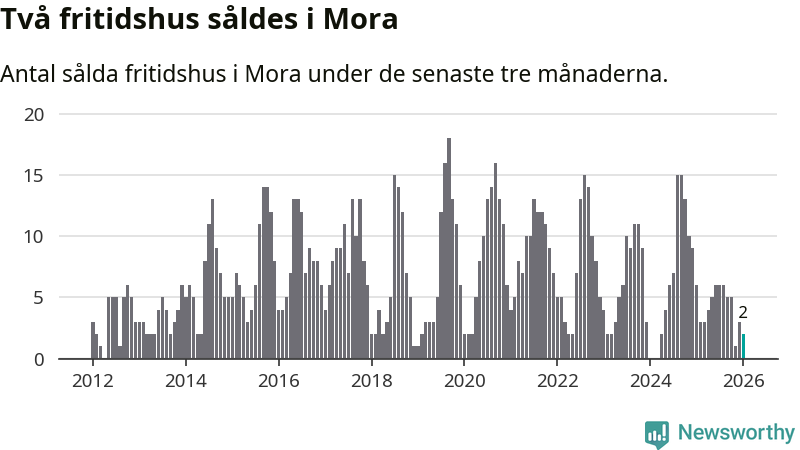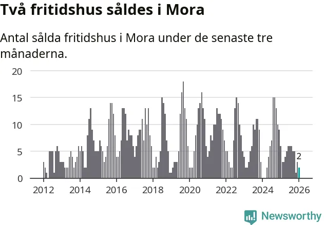 Mellan november och januari gjordes sammanlagt två affärer med fritidshus i Mora kommun. Det kan jämföras med sex vid motsvarande tid i fjol.