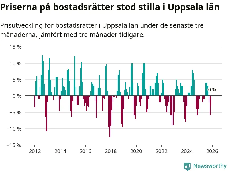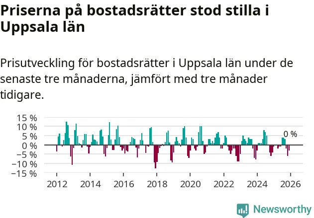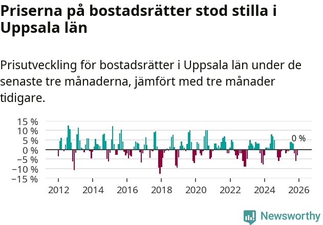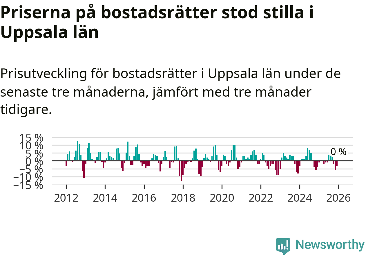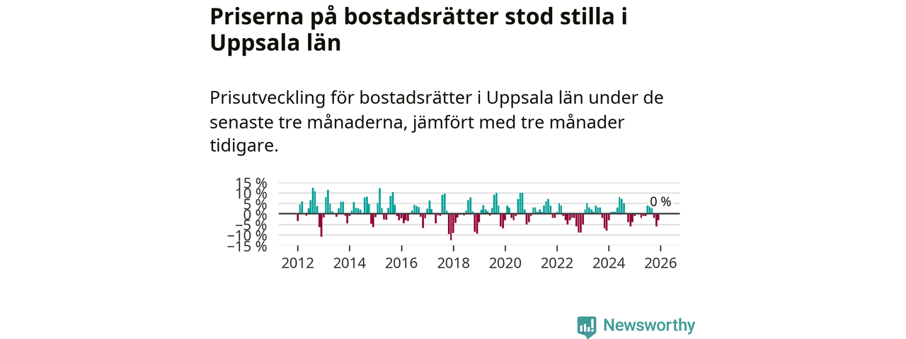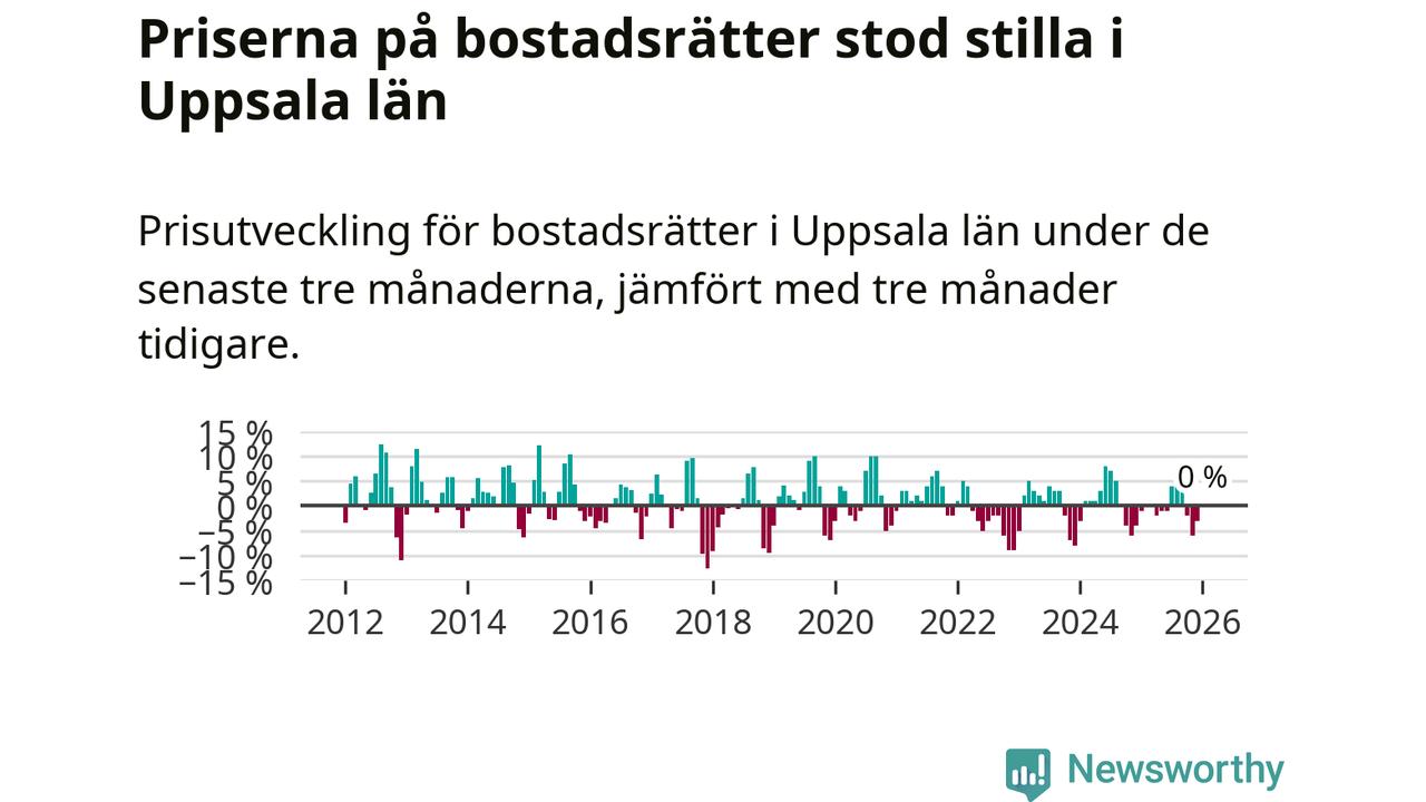 Priserna på bostadsrätter står i stort sett stilla i Uppsala län. Medelpriset på de på försäljningarna under de senaste tre månaderna låg på samma nivå som för tre månader sedan.