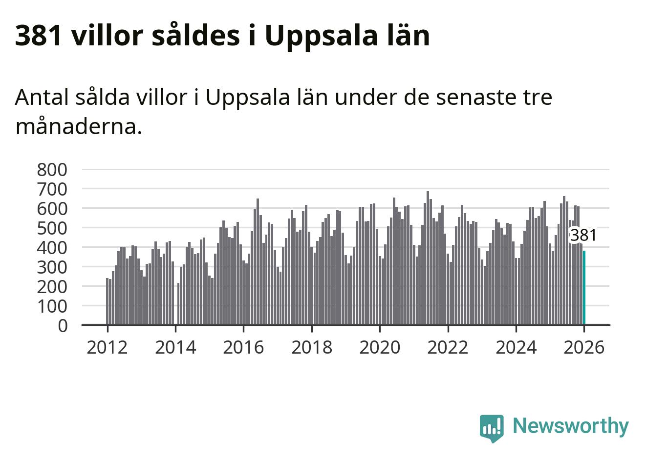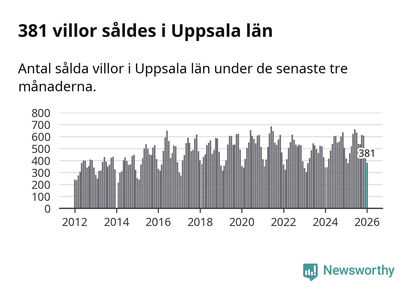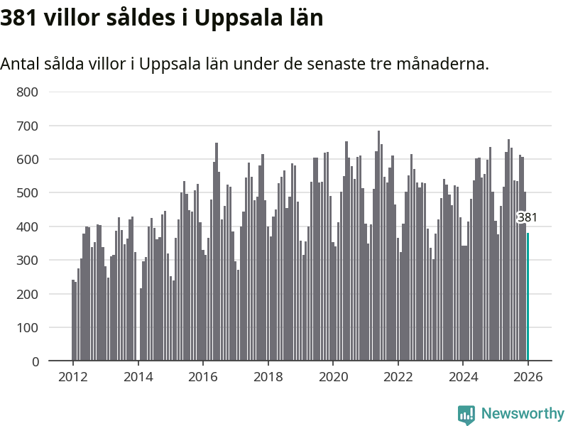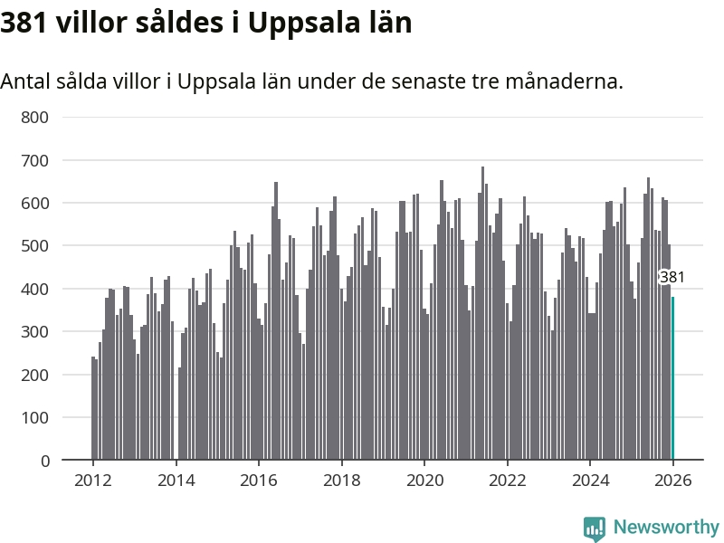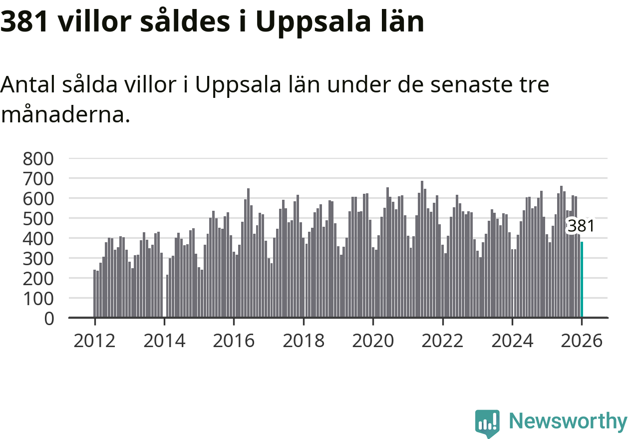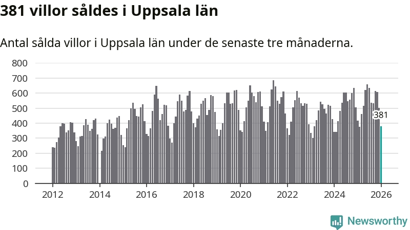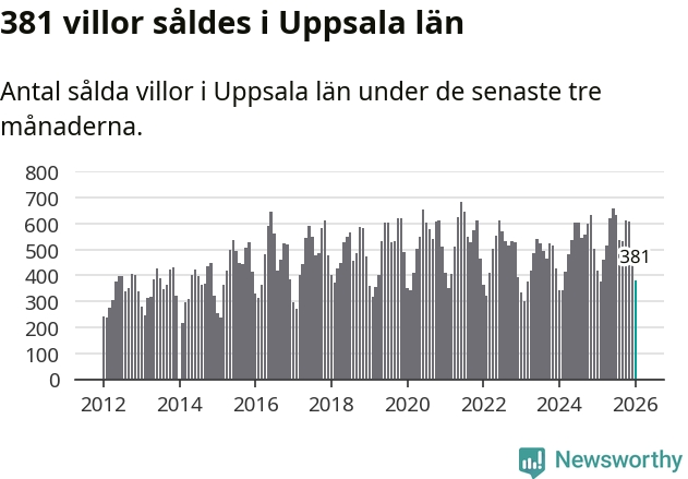Sammanlagt såldes 381 villor i Uppsala län mellan november och januari till ett genomsnittligt pris på 4,3 miljoner kronor. I fjol gjordes 417 affärer vid den här tiden på året.