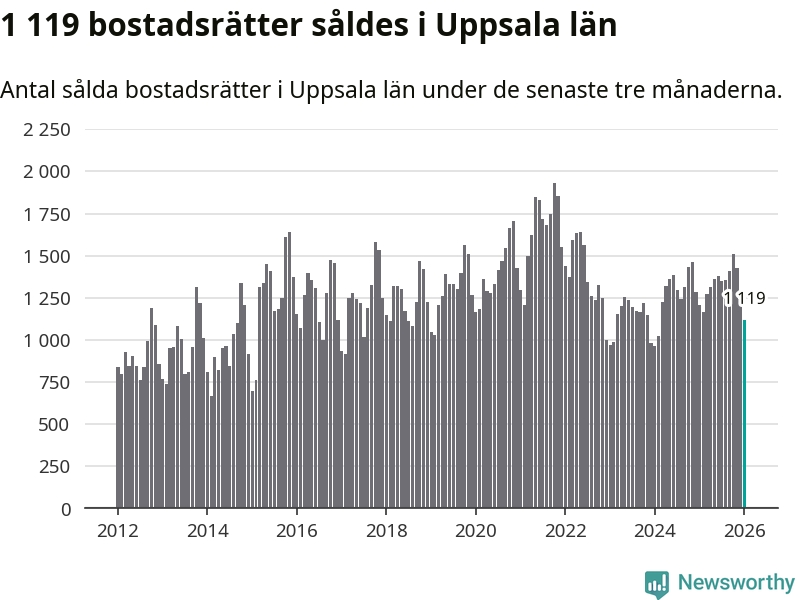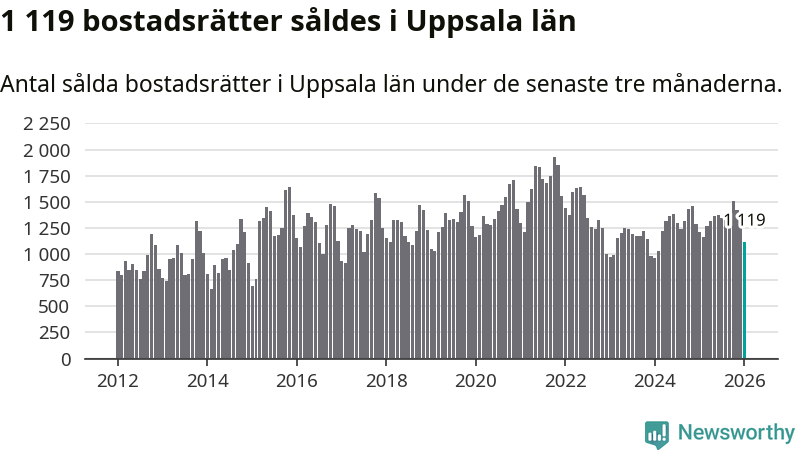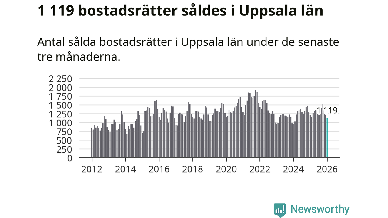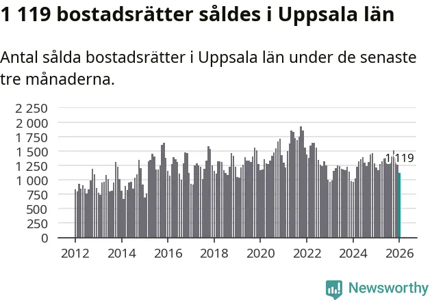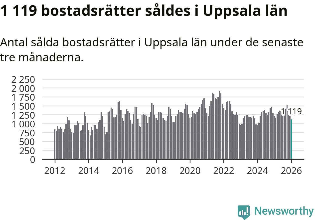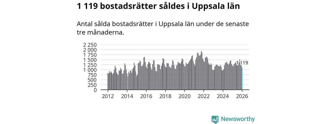 Sammanlagt såldes 1 119 bostadsrätter i Uppsala län mellan november och januari till ett genomsnittligt pris på 2,5 miljoner kronor. I fjol gjordes 1 208 affärer vid den här tiden på året.