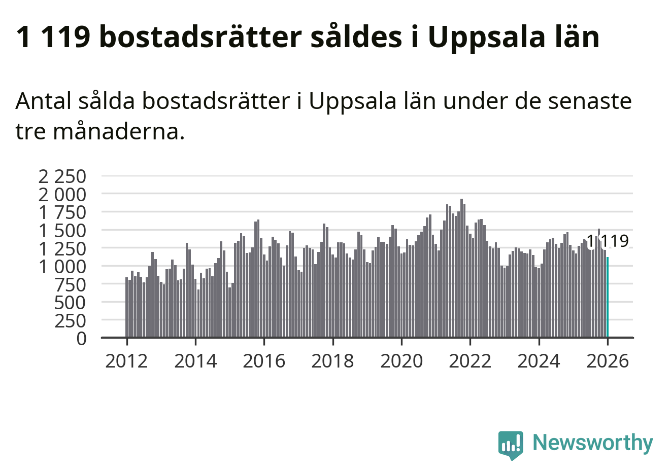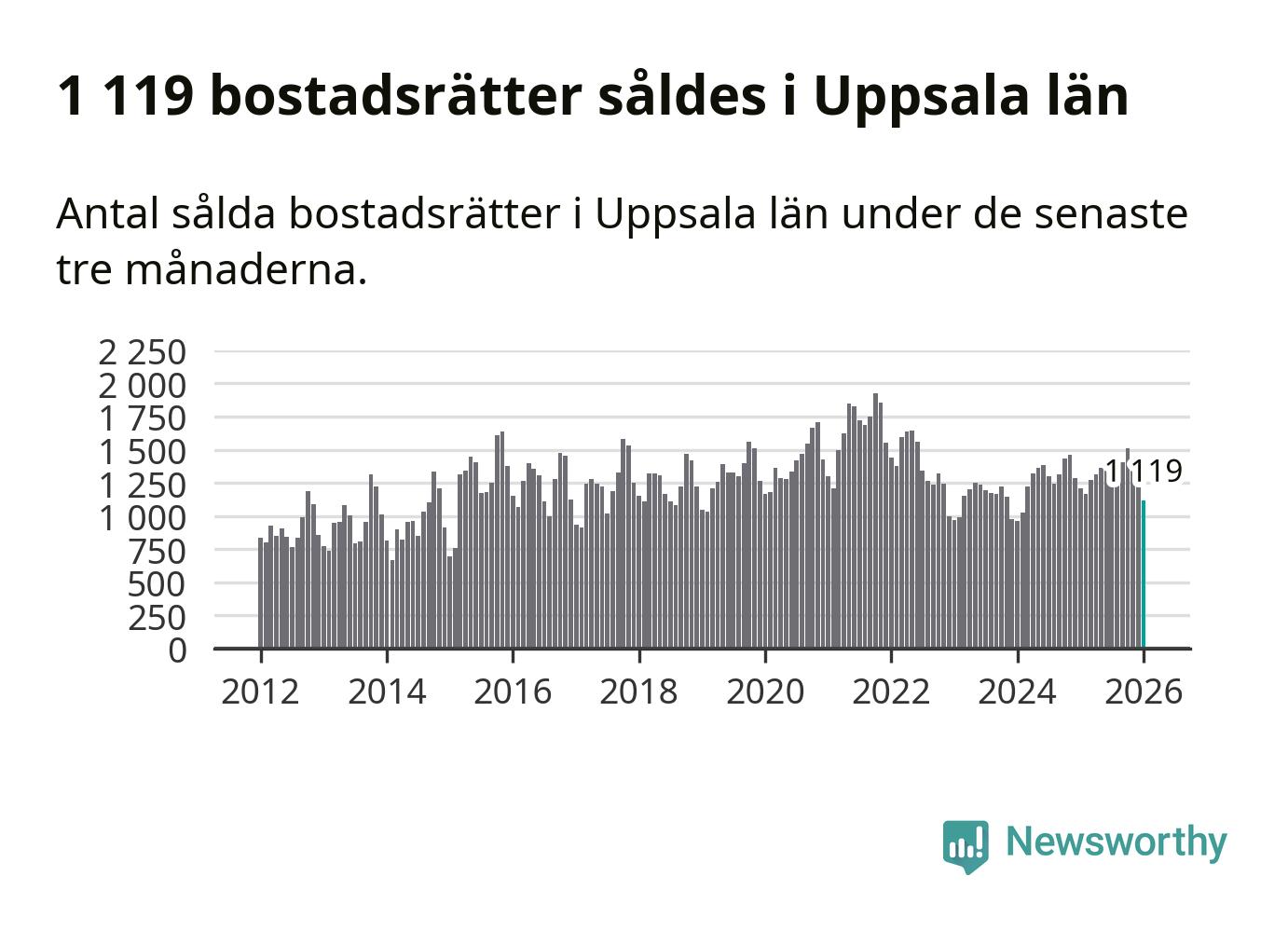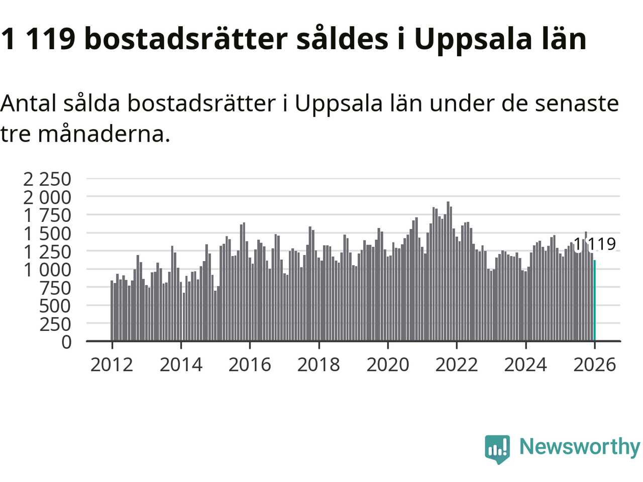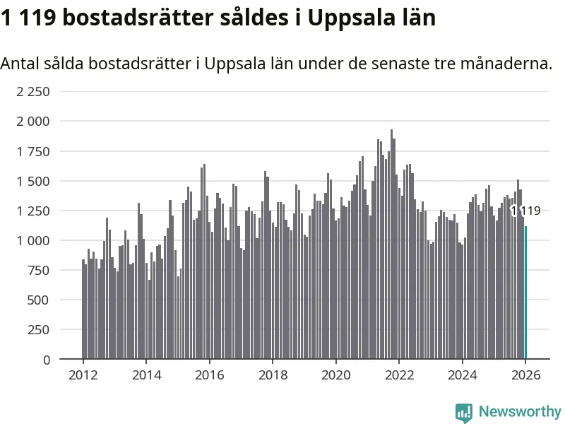 Sammanlagt såldes 1 119 bostadsrätter i Uppsala län mellan november och januari till ett genomsnittligt pris på 2,5 miljoner kronor. I fjol gjordes 1 208 affärer vid den här tiden på året.