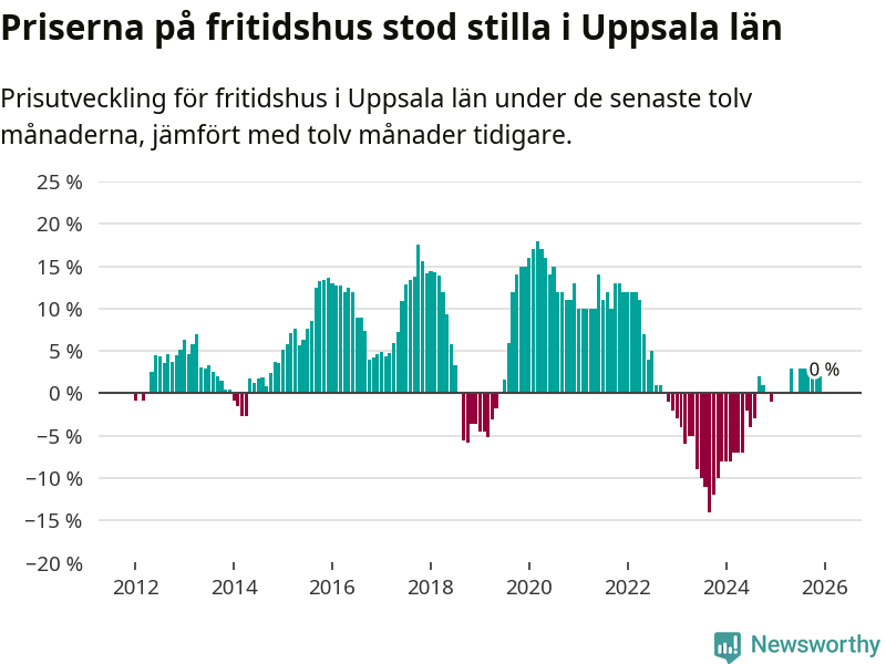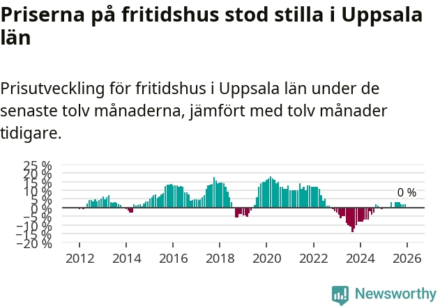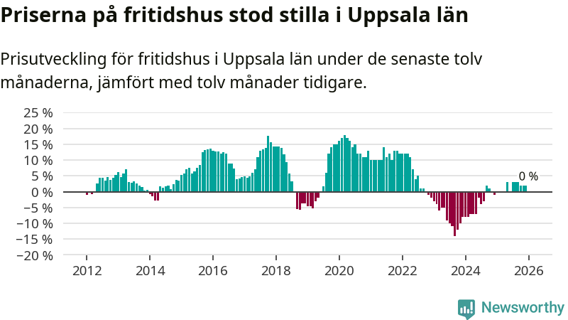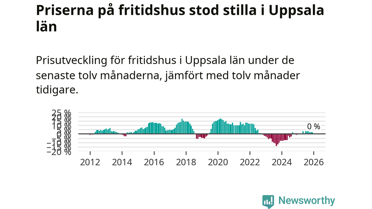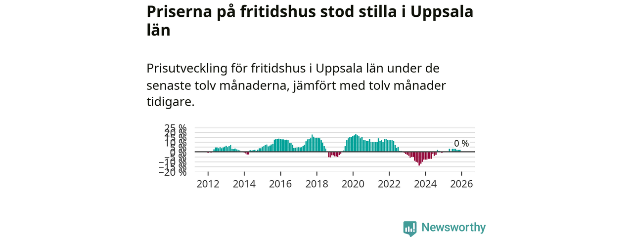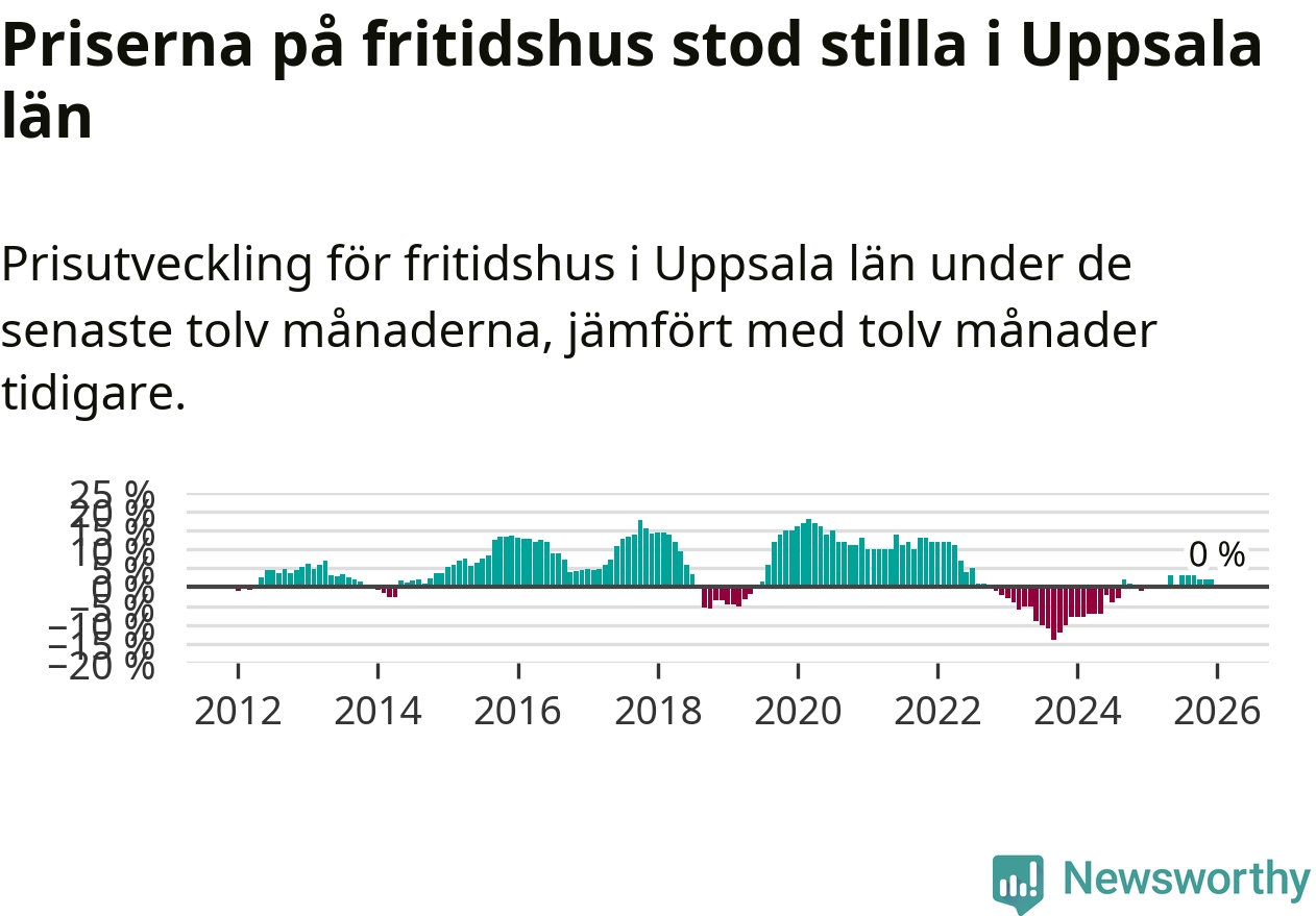 Priserna på fritidshus står i stort sett stilla i Uppsala län. Medelpriset på de på försäljningarna under de senaste tolv månaderna låg på samma nivå som för ett år sedan.