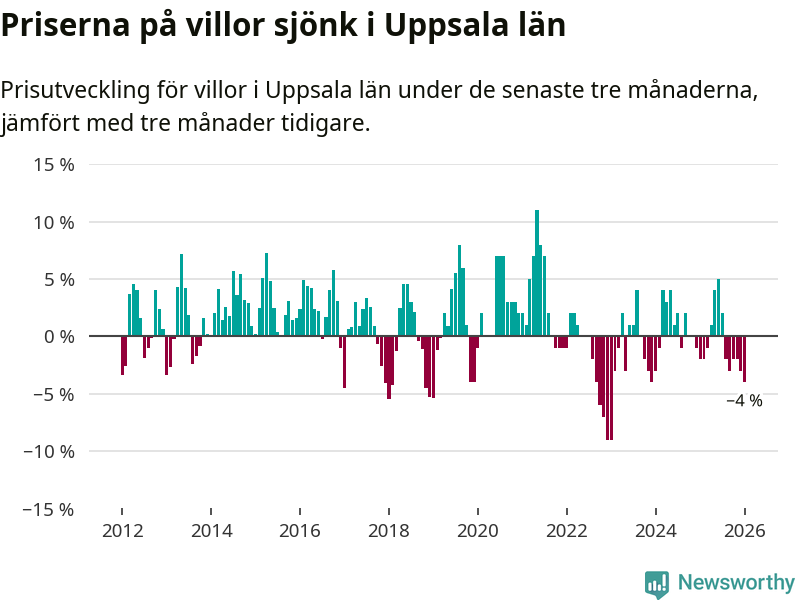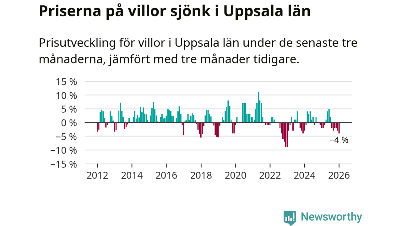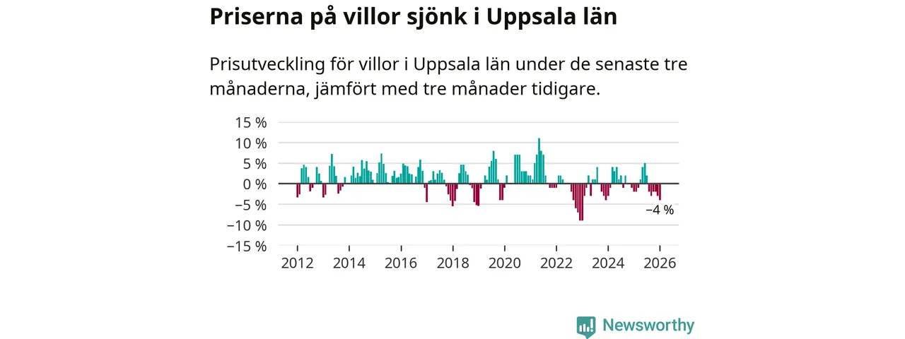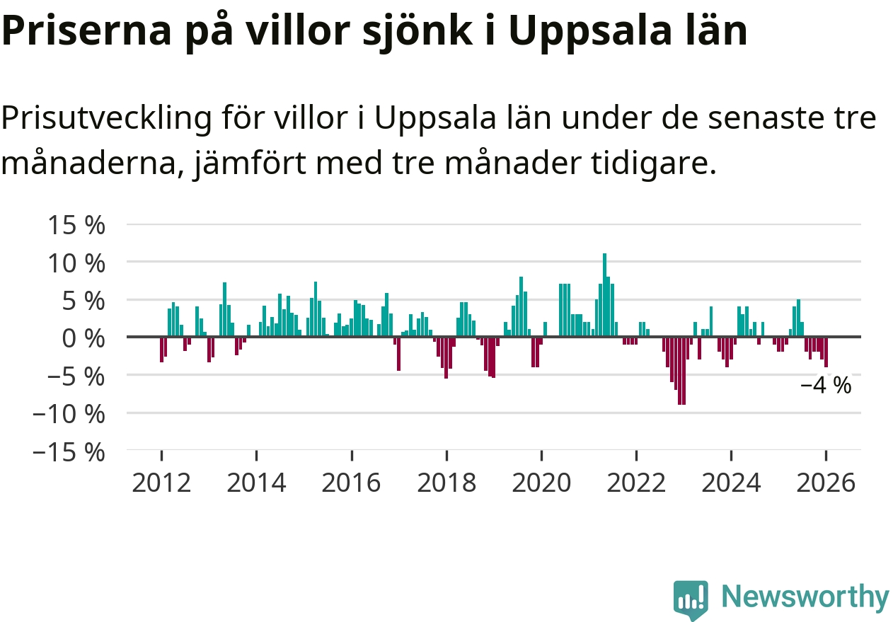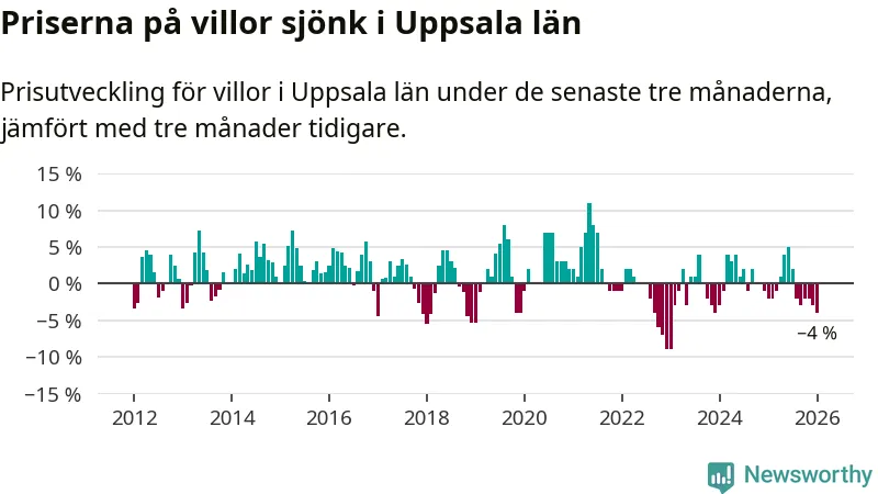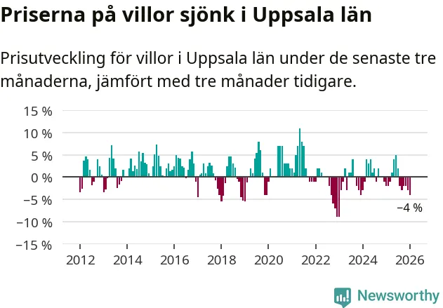 I Uppsala län som helhet går villapriserna ner med 4 procent. Även i hela Sverige sjunker villapriserna. I hela riket noterades en prisnedgång på 2 procent.