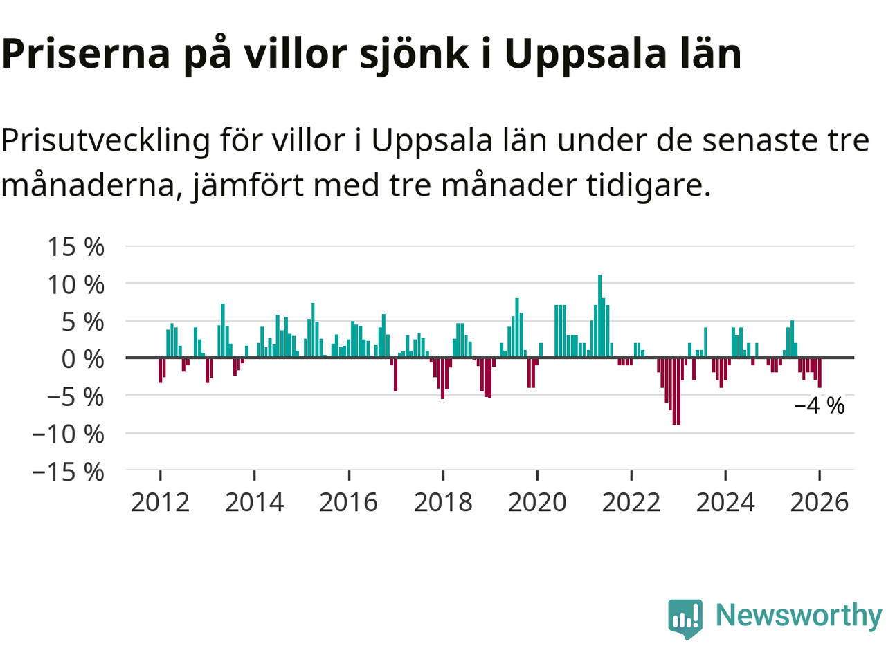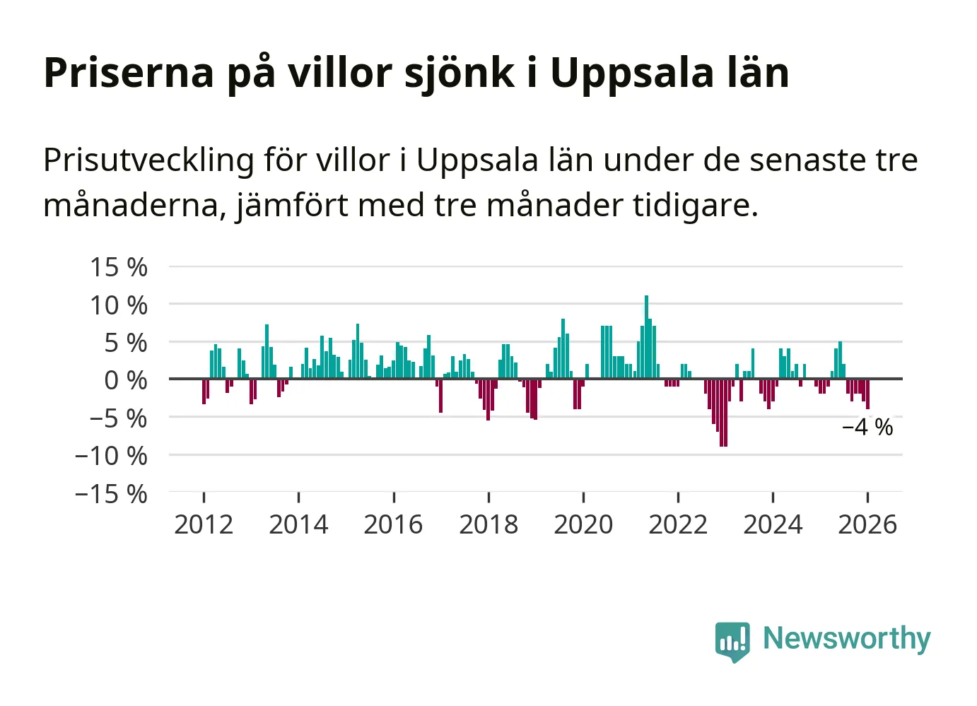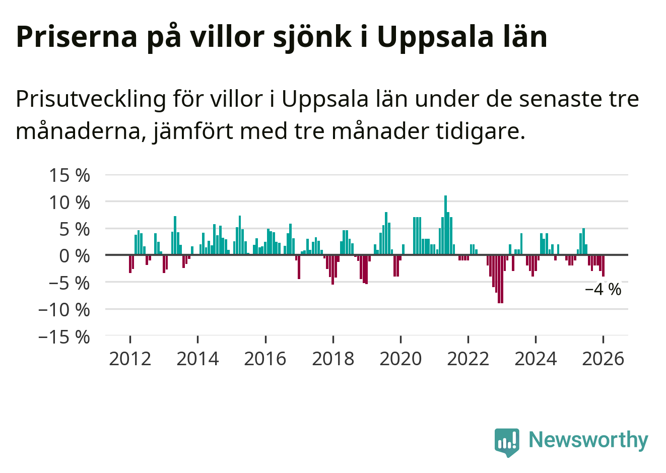 I Uppsala län som helhet går villapriserna ner med 4 procent. Även i hela Sverige sjunker villapriserna. I hela riket noterades en prisnedgång på 2 procent.