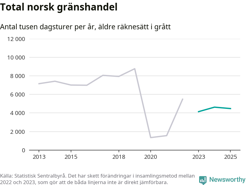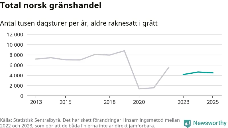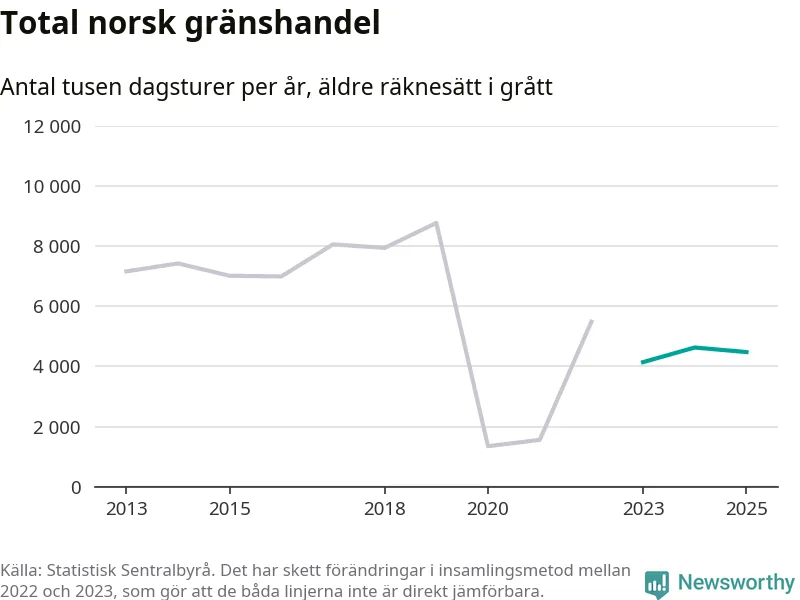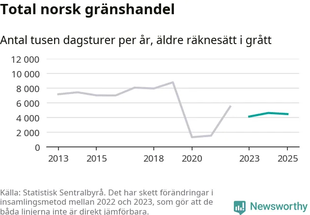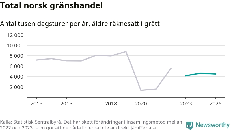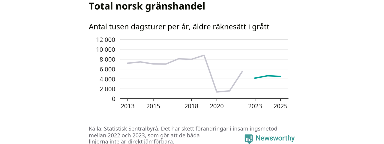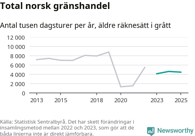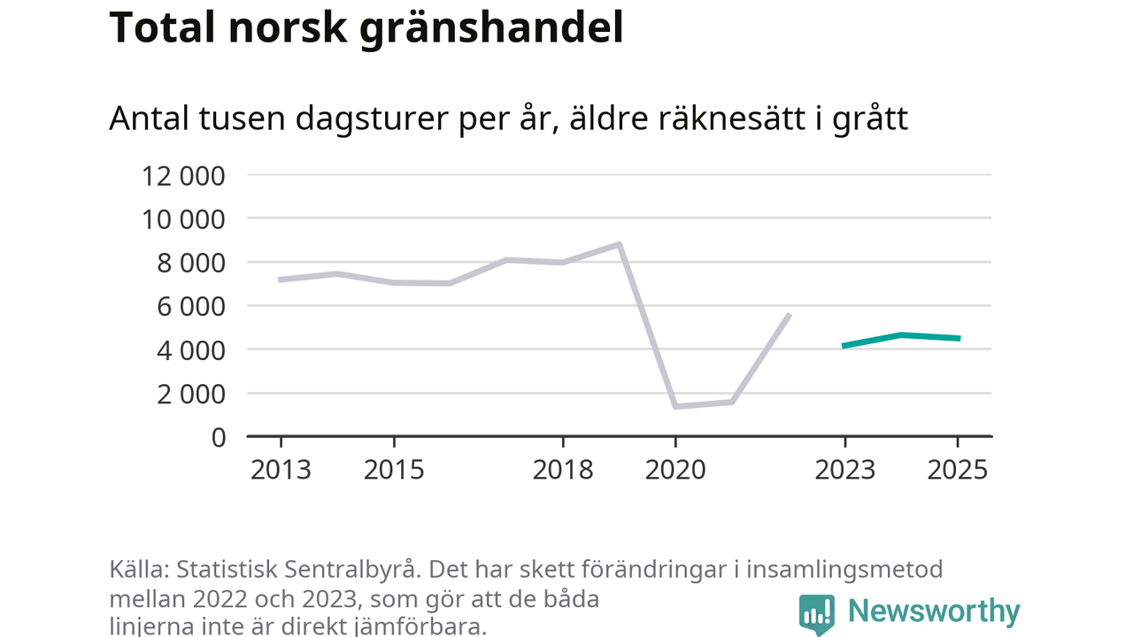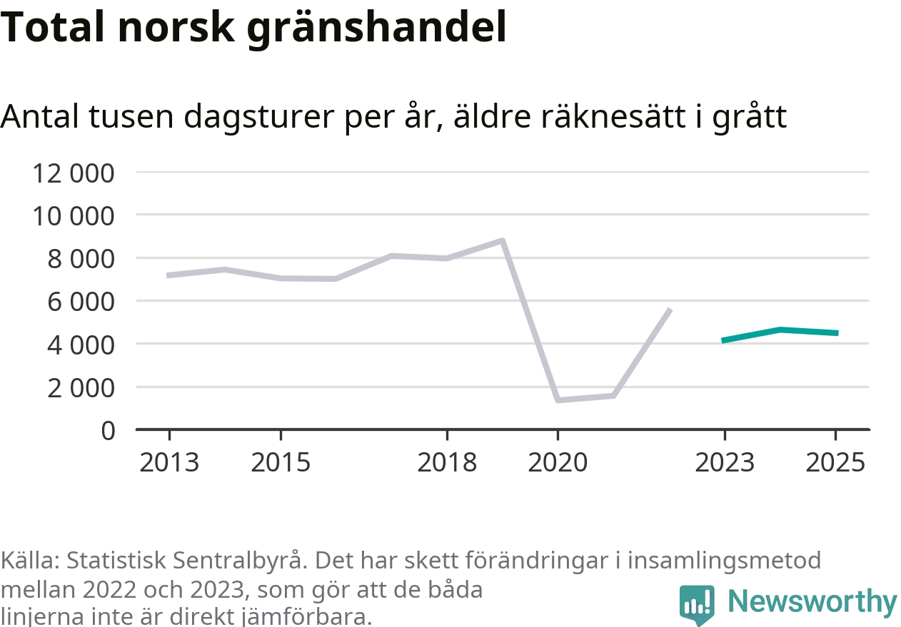 Den norska statistiken över gränshandel bygger på en enkätundersökning till invånare över hela Norge, och mellan 2022 och 2023 gjordes en stor ändring i hur den undersökningen genomförs. Det gör att de senaste årens siffror inte går att jämföra med tidigare år, och det är alltså svårt att med säkerhet säga om och när handeln helt återhämtat sig efter pandemin. Enligt SSB har den tidigare undersökningsmetoden troligen överskattat handeln.