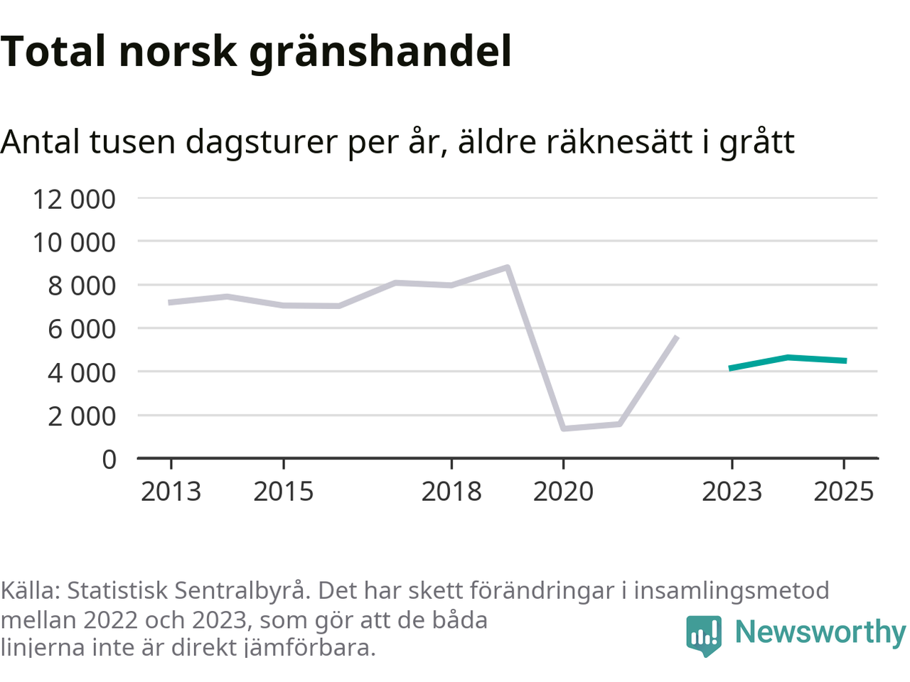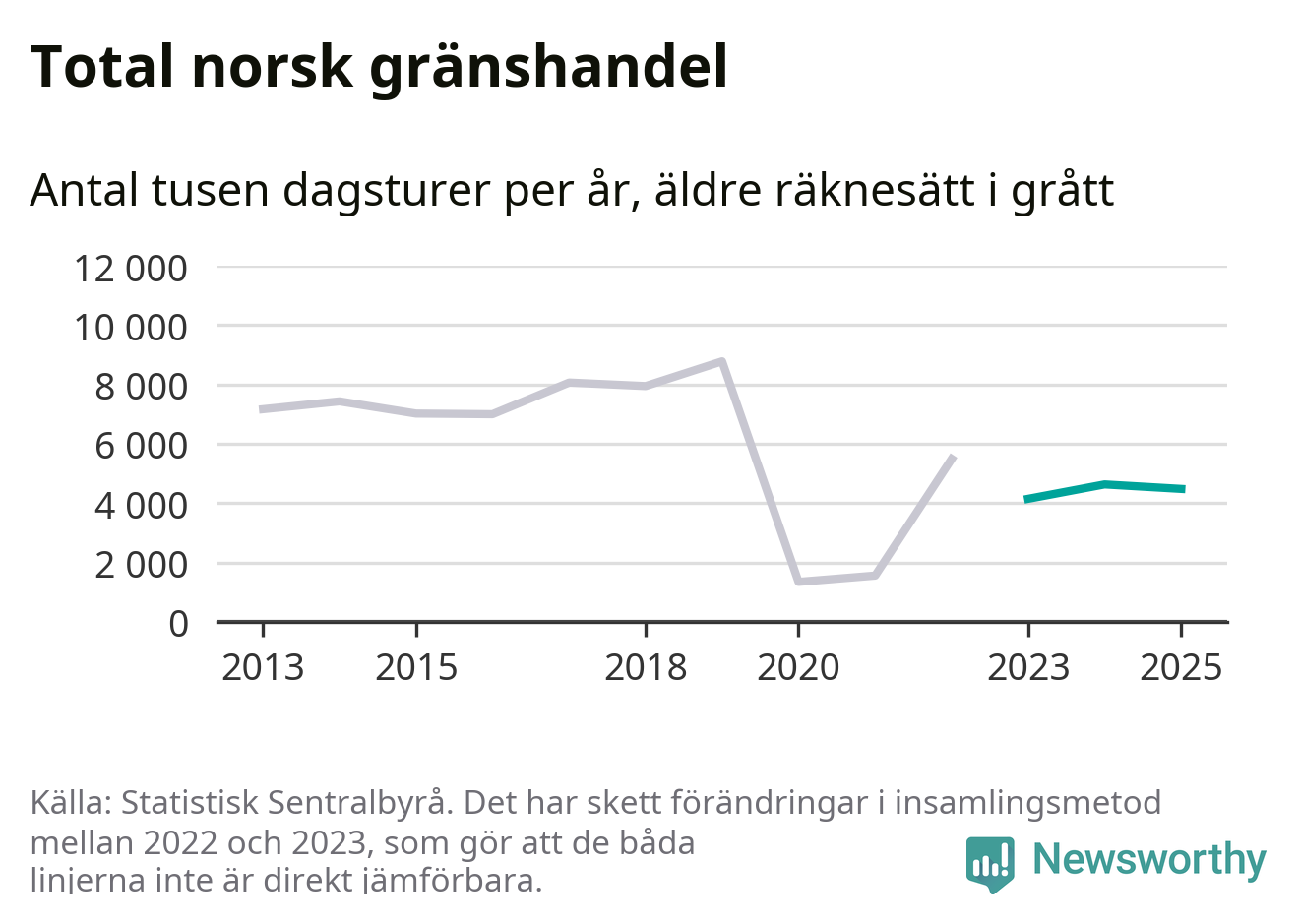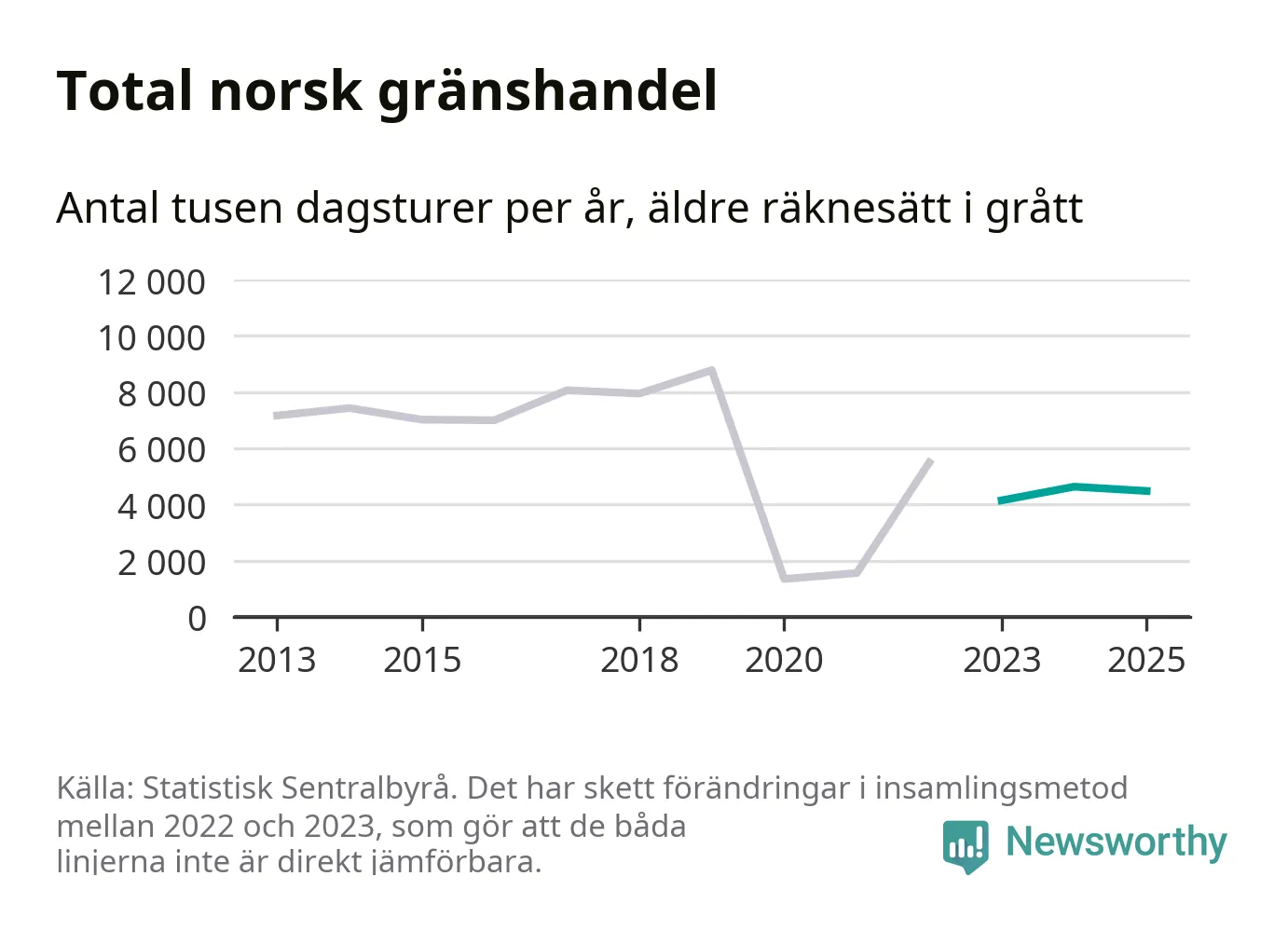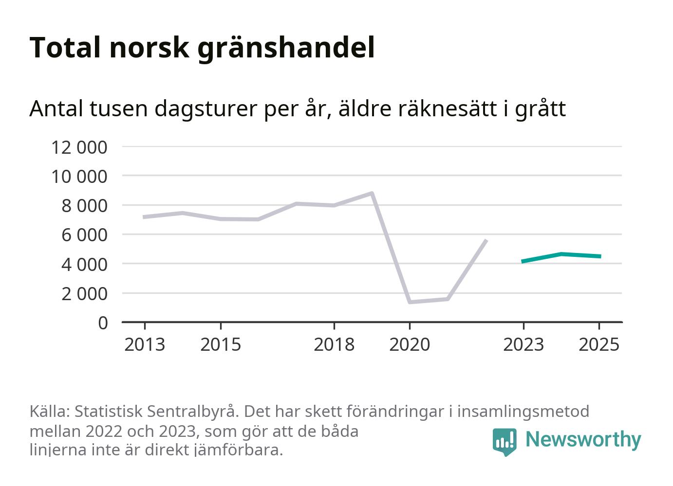 Den norska statistiken över gränshandel bygger på en enkätundersökning till invånare över hela Norge, och mellan 2022 och 2023 gjordes en stor ändring i hur den undersökningen genomförs. Det gör att de senaste årens siffror inte går att jämföra med tidigare år, och det är alltså svårt att med säkerhet säga om och när handeln helt återhämtat sig efter pandemin. Enligt SSB har den tidigare undersökningsmetoden troligen överskattat handeln.