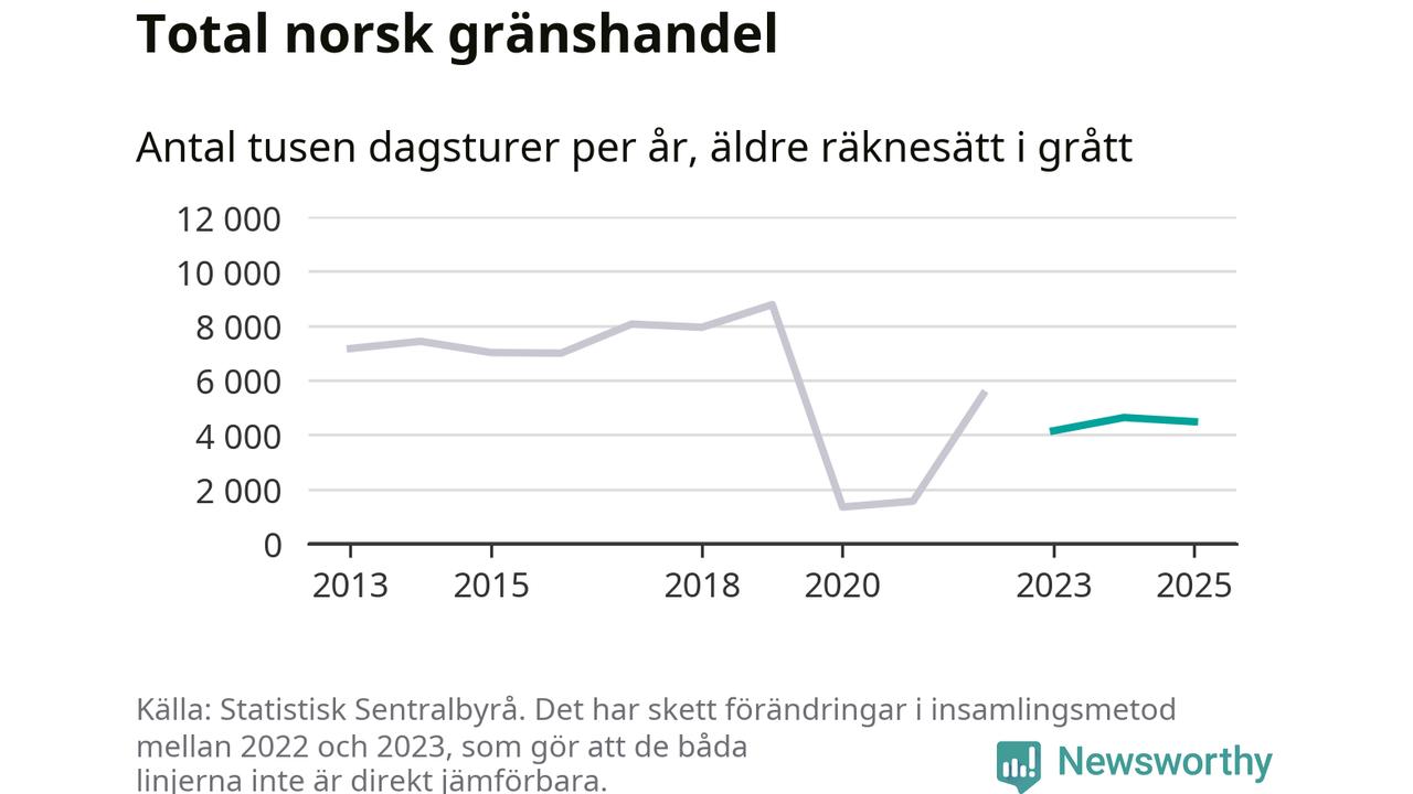 Gränshandeln minskade förra året med 3 procent jämfört med 2024, räknat i antal dagsresor över gränsen. Totalt gjordes 4,5 miljoner sådana resor till orter längs den norska gränsen enligt Statistisk Sentralbyrå (SSB), att jämföra med 4,6 miljoner under 2024.
