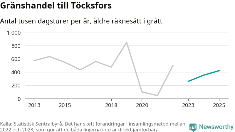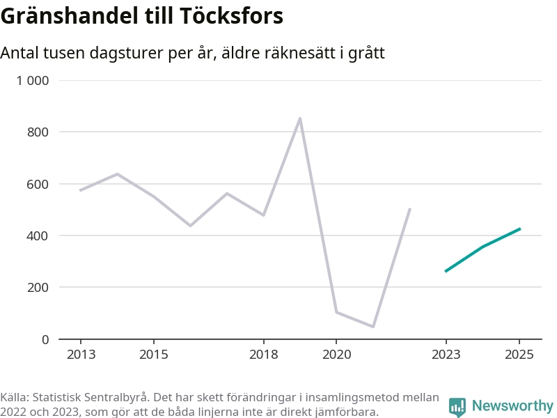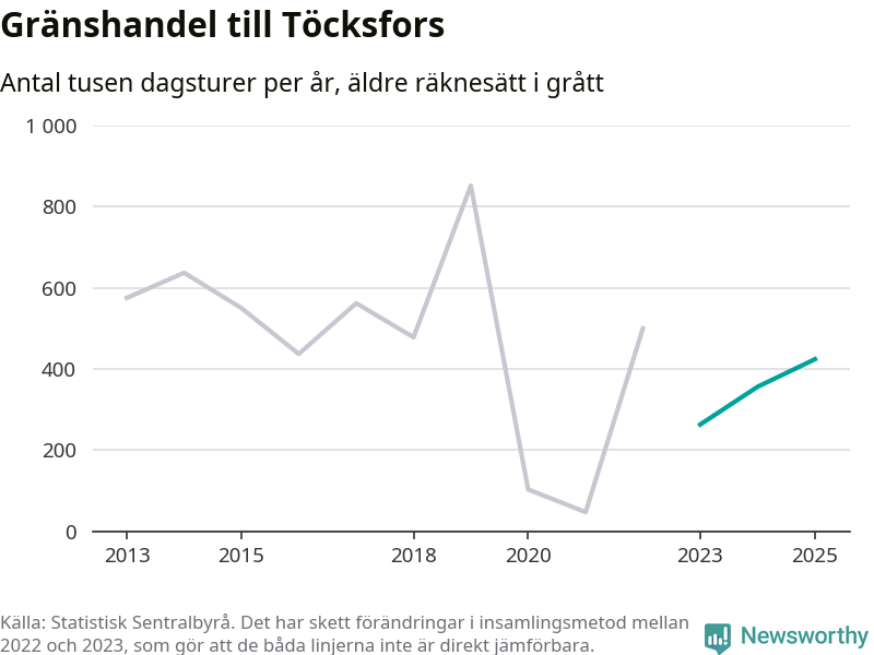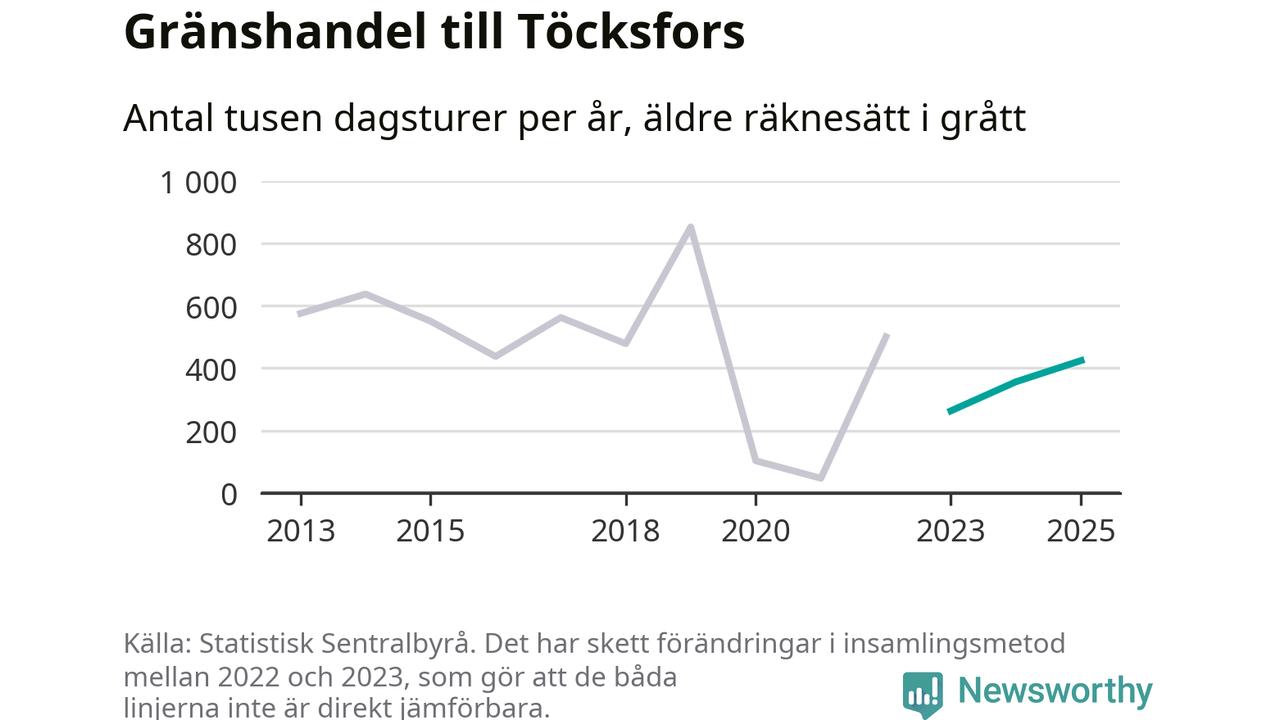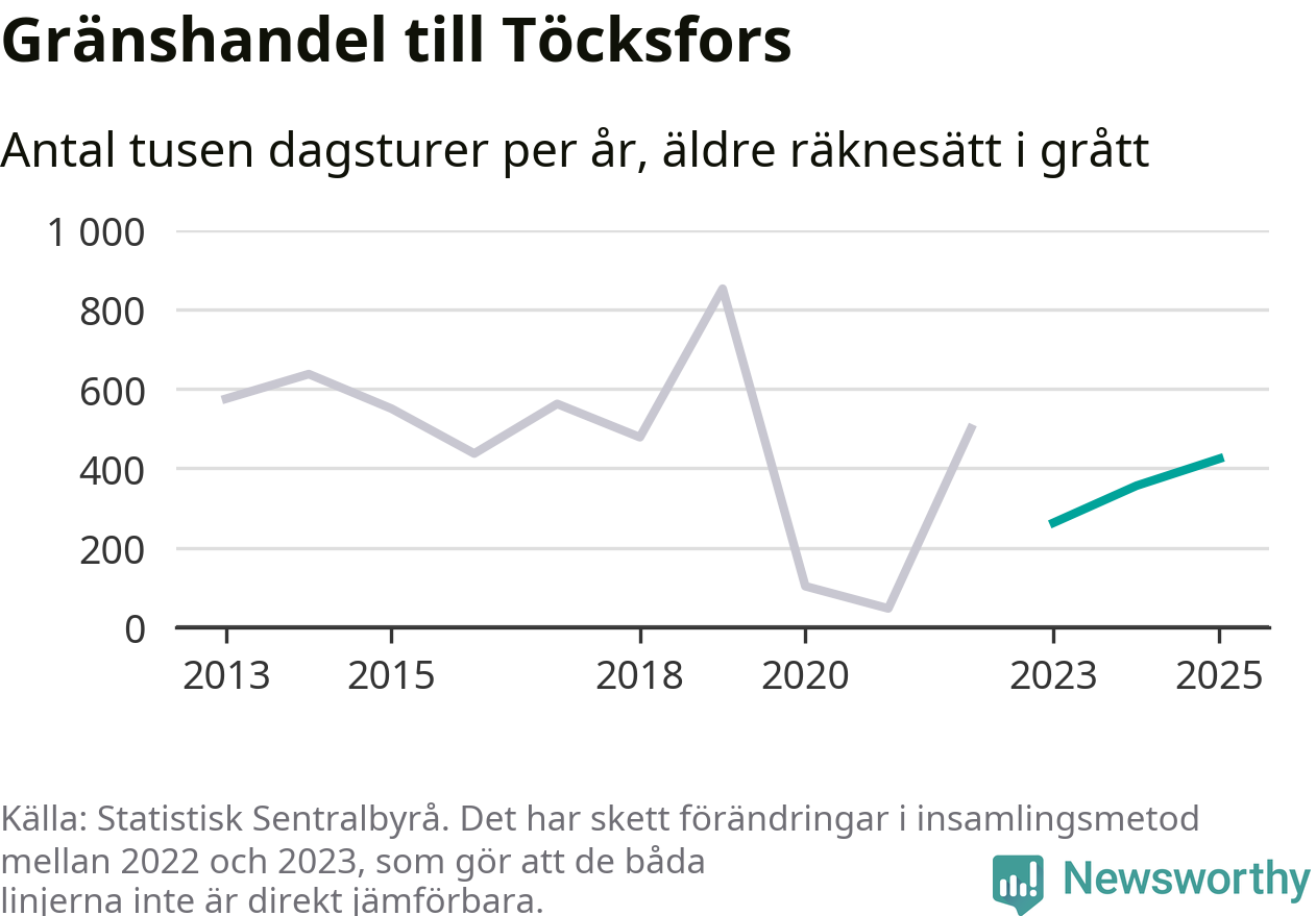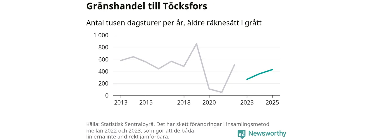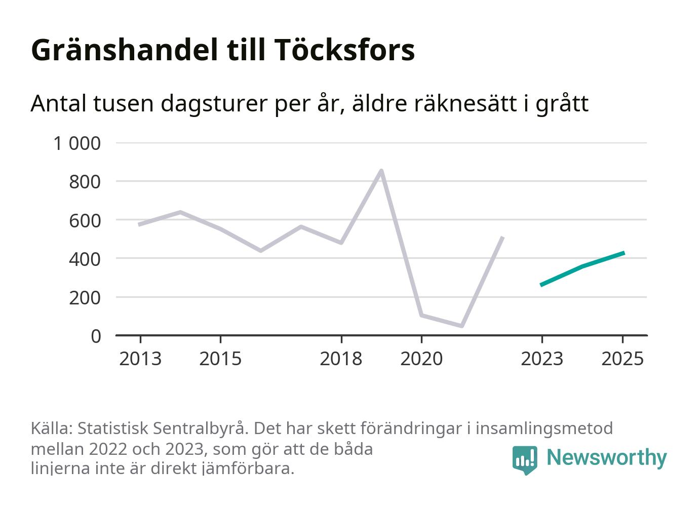 Gränshandeln i Töcksfors ökade förra året med 19 procent jämfört med 2024, räknat i antal dagsresor över gränsen. Totalt gjordes 424 000 sådana resor till Töcksfors under 2025 enligt Statistisk Sentralbyrå (SSB), att jämföra med 356 000 under 2024.