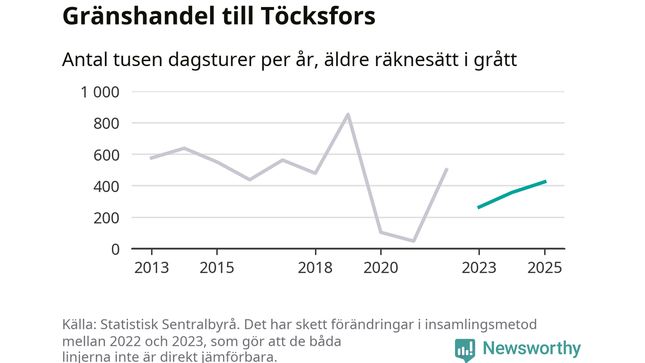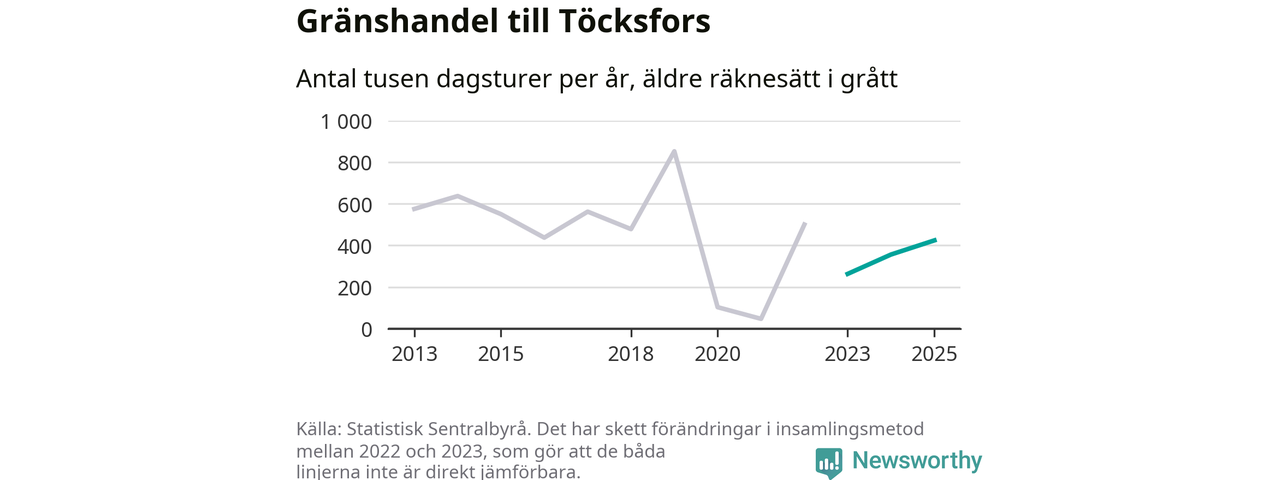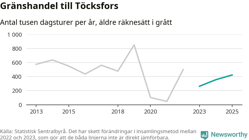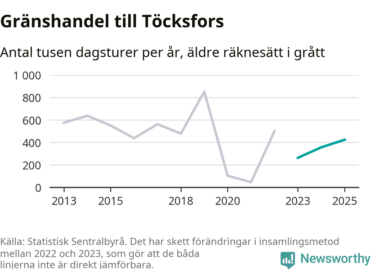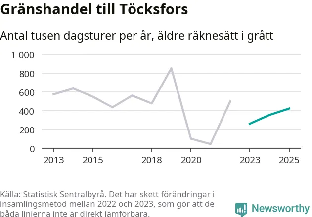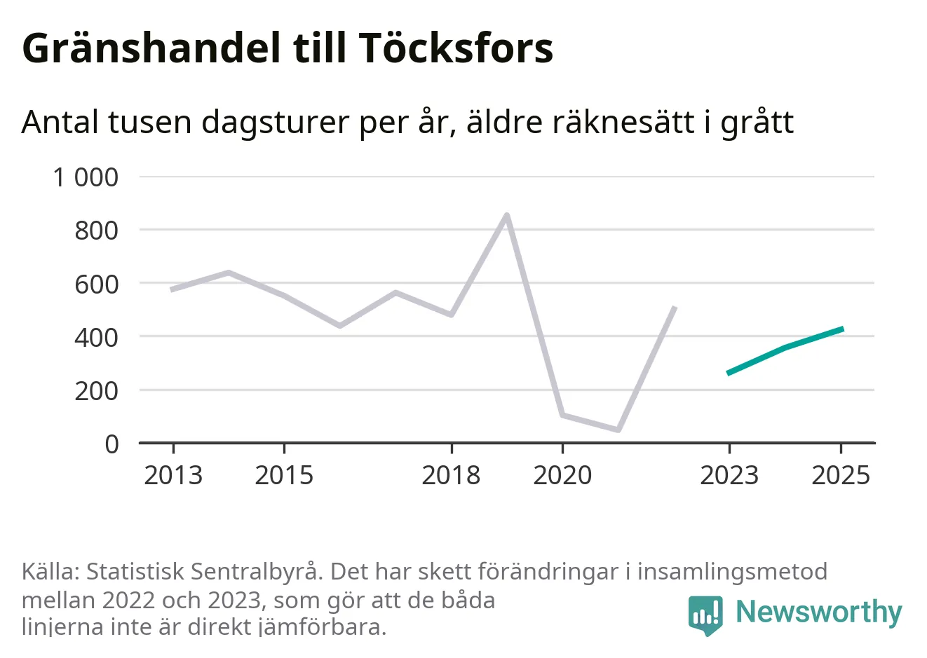 Den norska statistiken över gränshandel bygger på en enkätundersökning till invånare över hela Norge, och mellan 2022 och 2023 gjordes en stor ändring i hur den undersökningen genomförs. Det gör att de senaste årens siffror inte går att jämföra med tidigare år, och det är alltså svårt att med säkerhet säga om och när handeln helt återhämtat sig efter pandemin. Enligt SSB har den tidigare undersökningsmetoden troligen överskattat handeln.