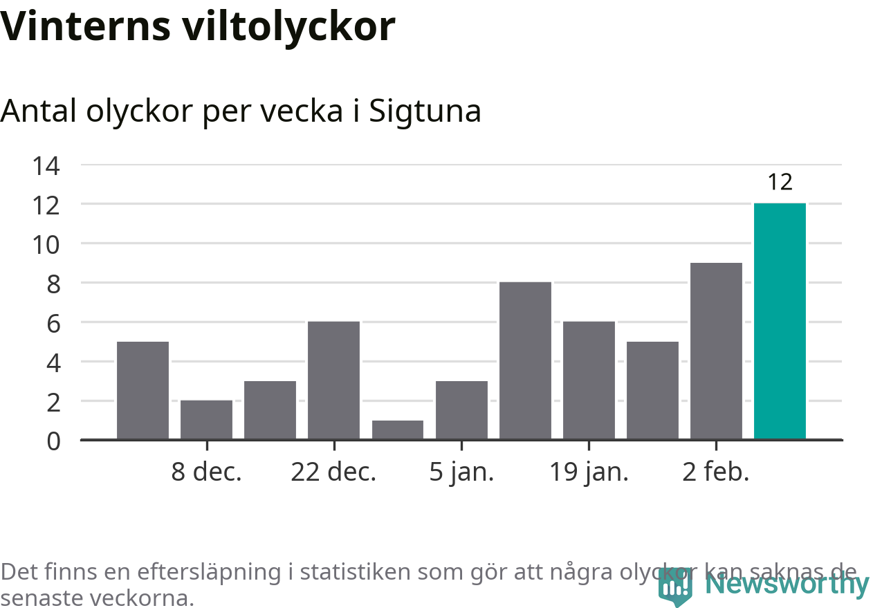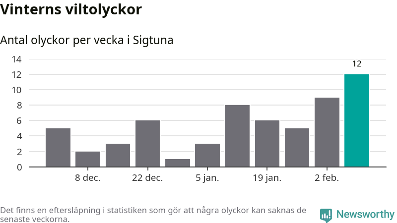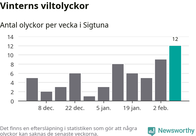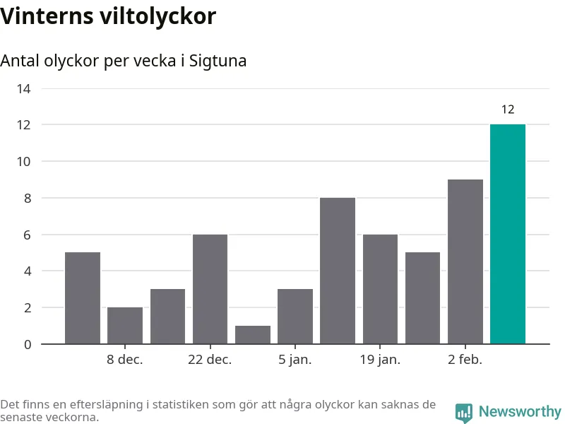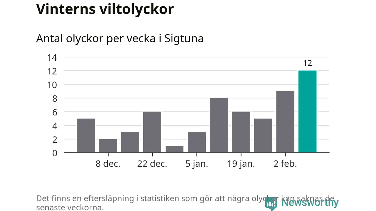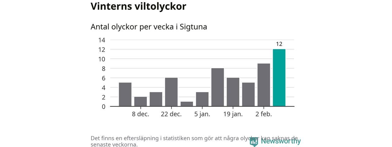 Under vecka 7 rapporterades tolv viltolyckor in i Sigtuna kommun. Det är det största antalet på en vecka den här vintern.