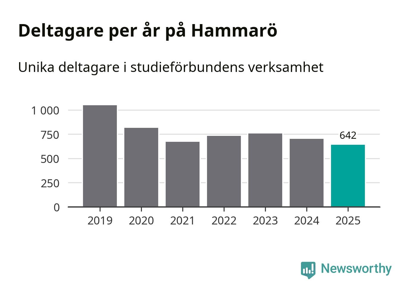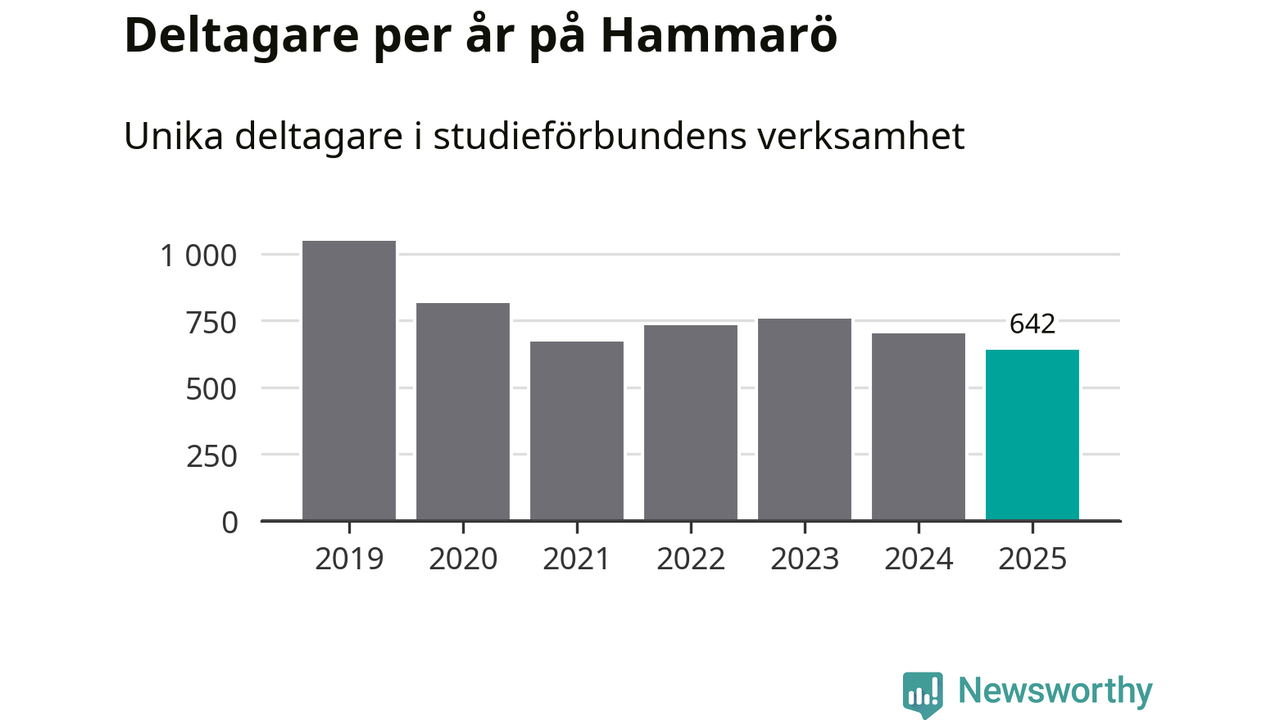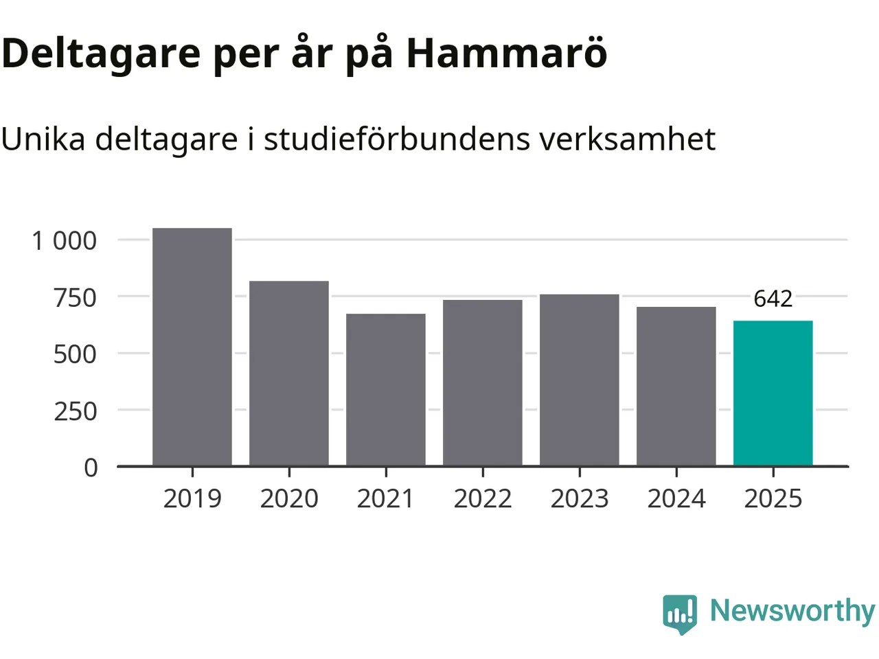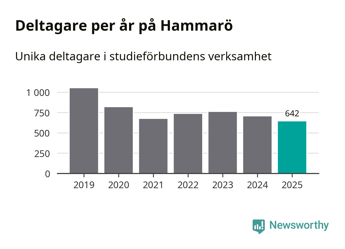Även sett till unika deltagare är folkbildningen på tillbakagång på Hammarö. 2025 deltog 642 personer i studieförbundens verksamhet, vilket är en minskning med åtta procent jämfört med året innan. Det innebär att fyra procent av befolkningen i kommunen deltog i studieförbundens verksamhet under 2025, vilket är ungefär som rikssnittet.